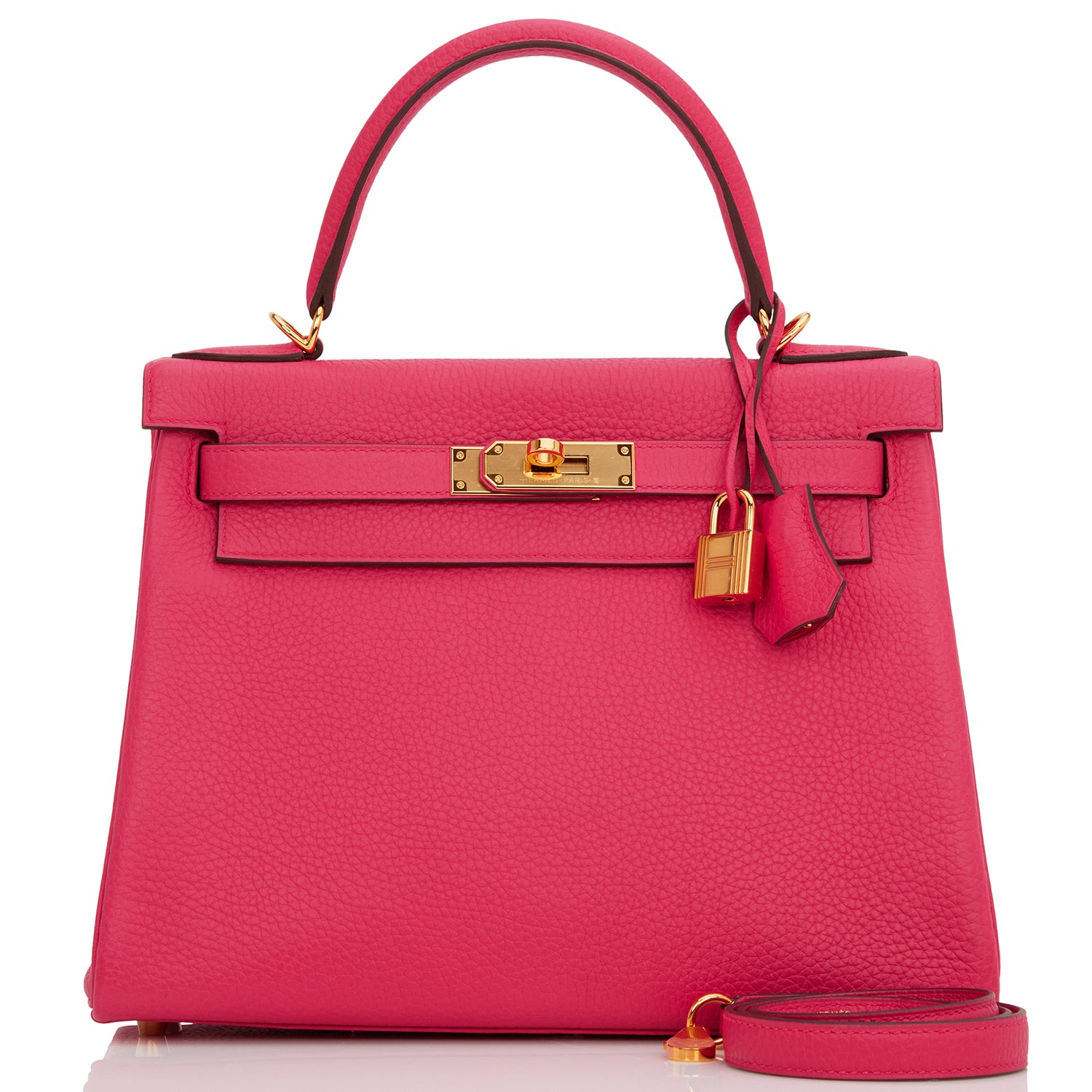 This Kelly, in the Retourne style, is in Rose Extreme clemence leather with gold hardware and has tonal stitching,front flap, two straps with center toggle closure, clochette with lock and two keys, single rolled handle and removable shoulder strap.