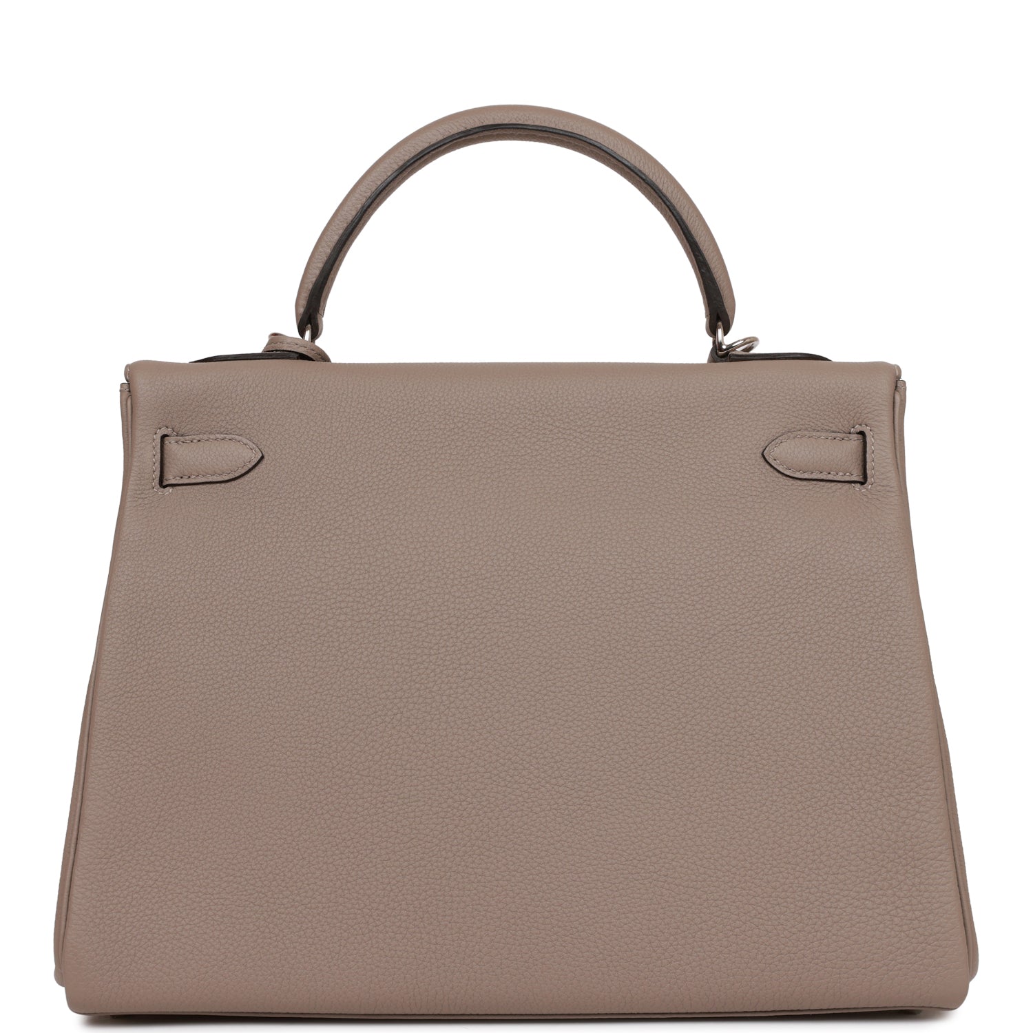 This Kelly, in the Retourne style, is in Gris Asphalte togo leather with palladium hardware and has tonal stitching, two straps with front toggle closure, clochette with lock and two keys, single rolled handle and removable shoulder strap.