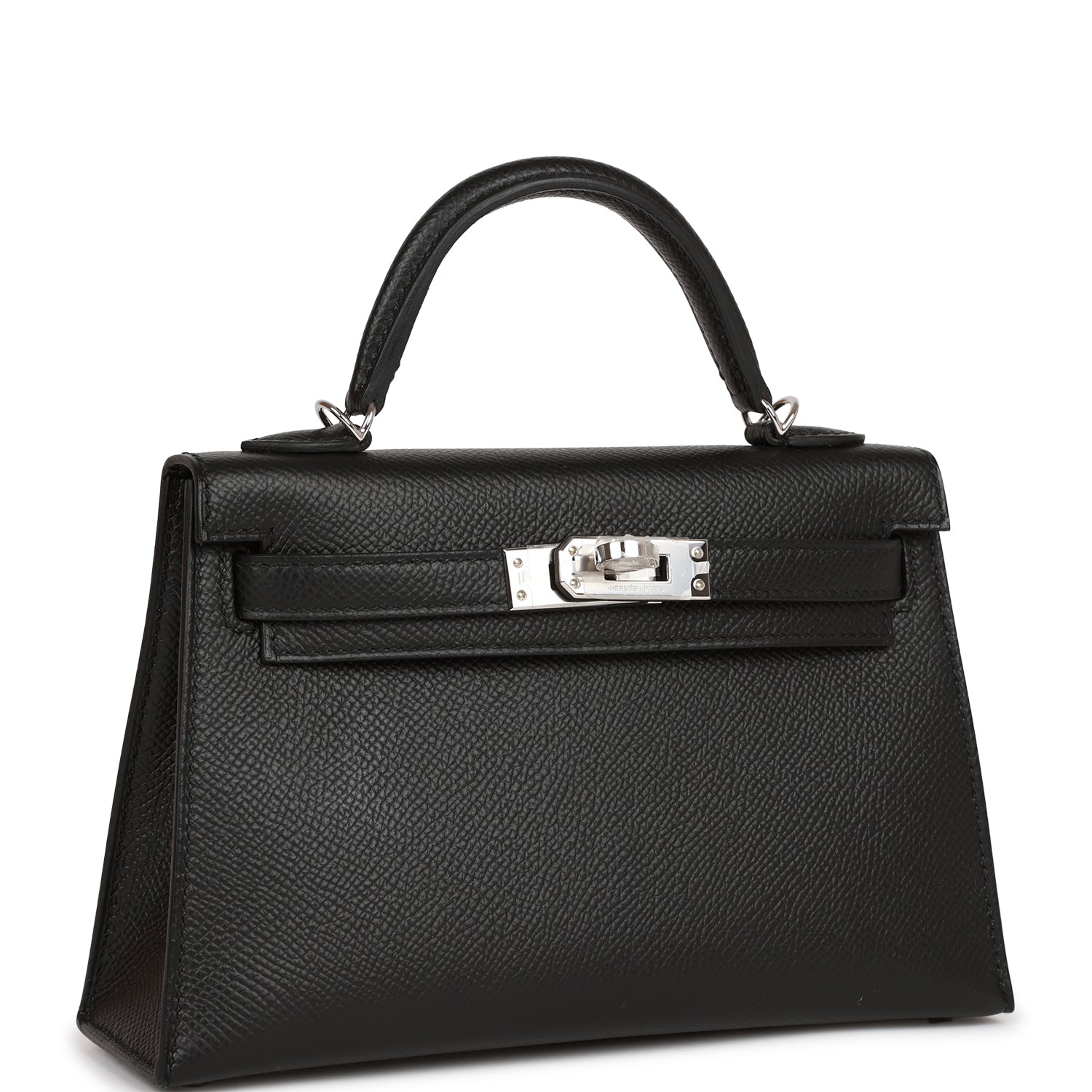 This tiny Kelly, in the Sellier style, is in black epsom leather with palladium hardware and has tonal stitching, two front straps with front toggle closure, single rolled handle and removable shoulder strap.