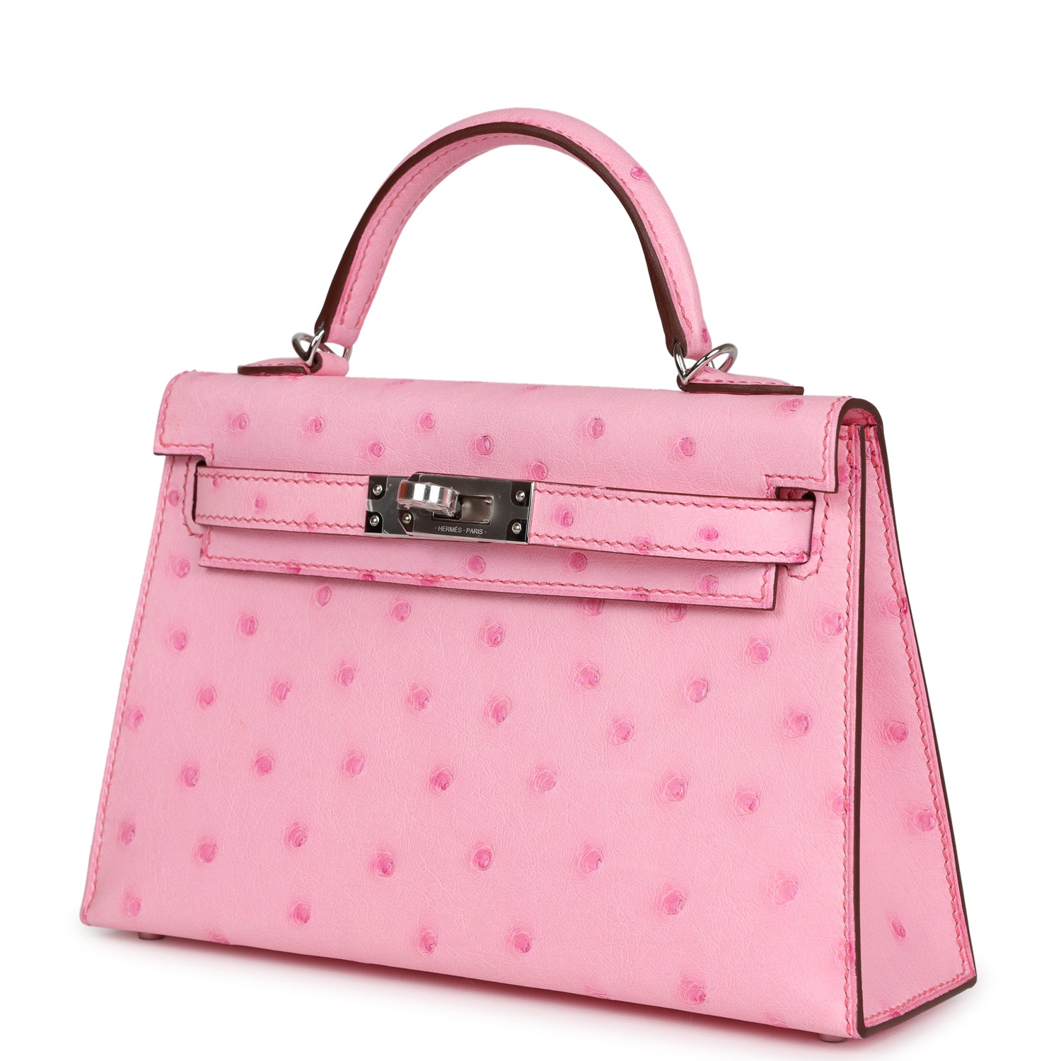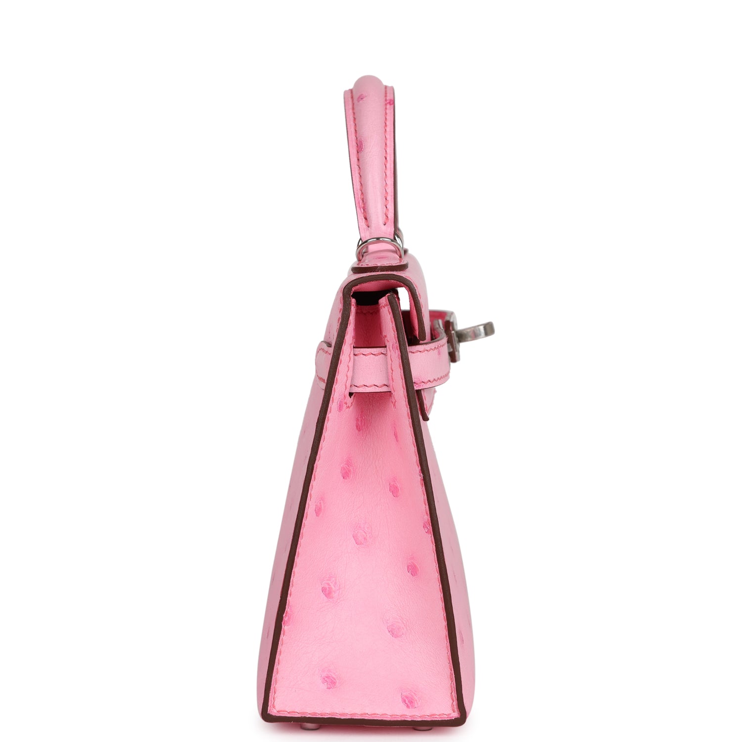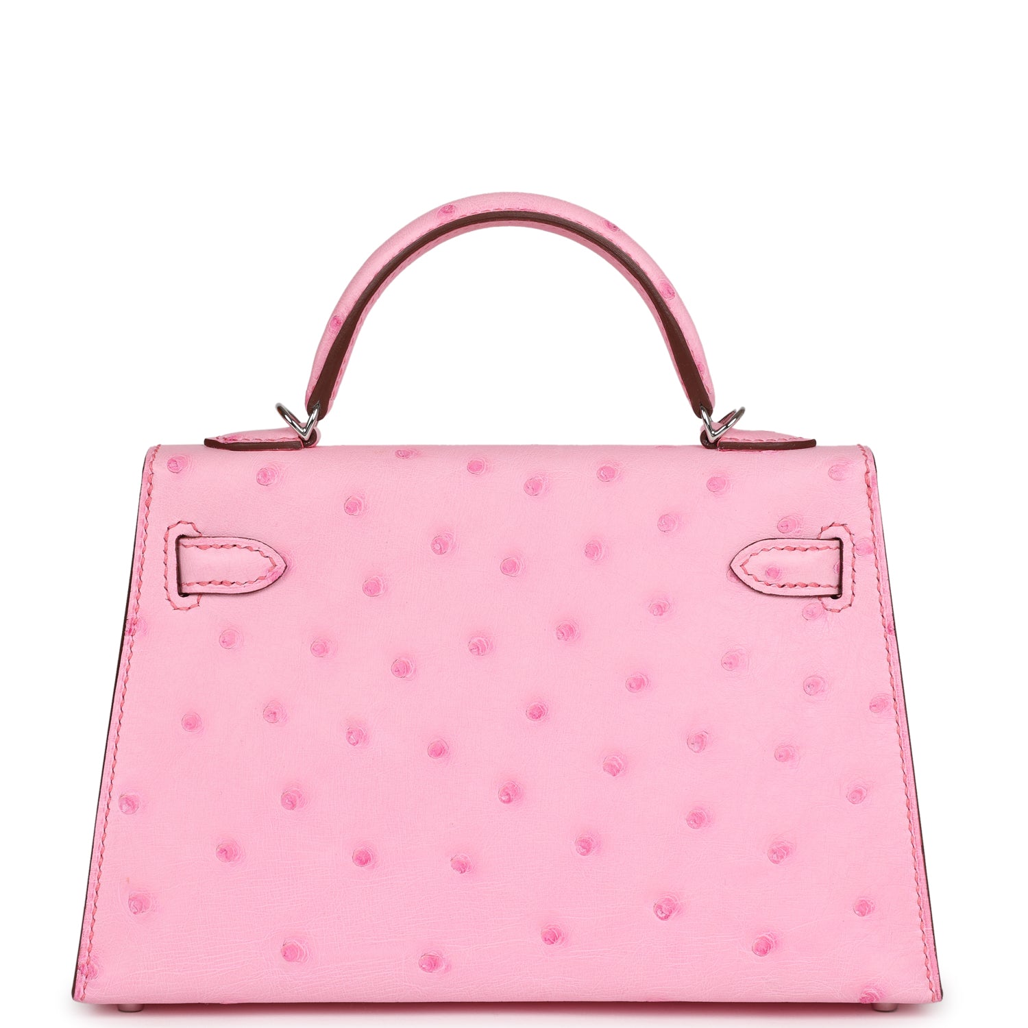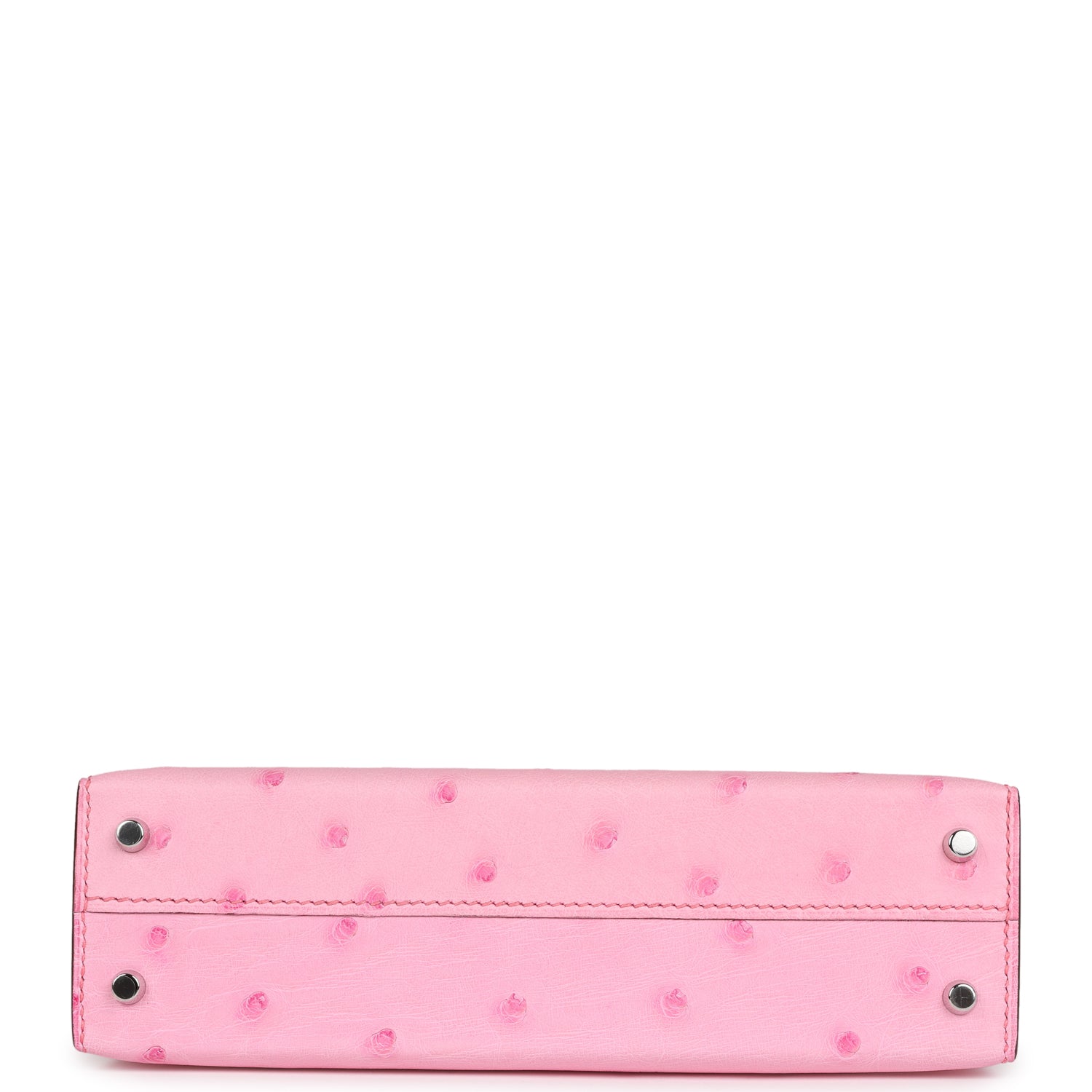 Kelly, is in bubblegum pink ostrich leather with palladium hardware and has tonal stitching, two front straps with front toggle closure, single rolled handle and removable shoulder strap.