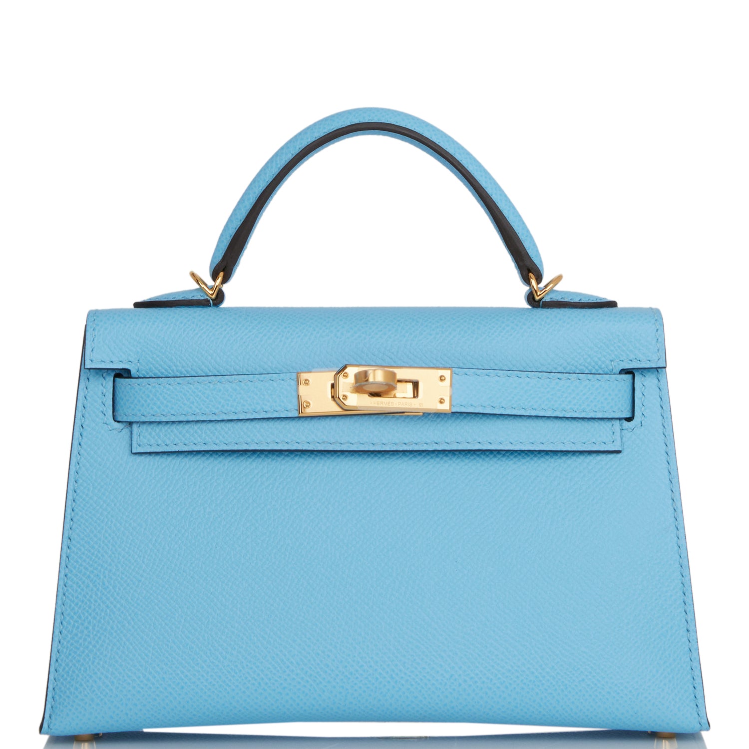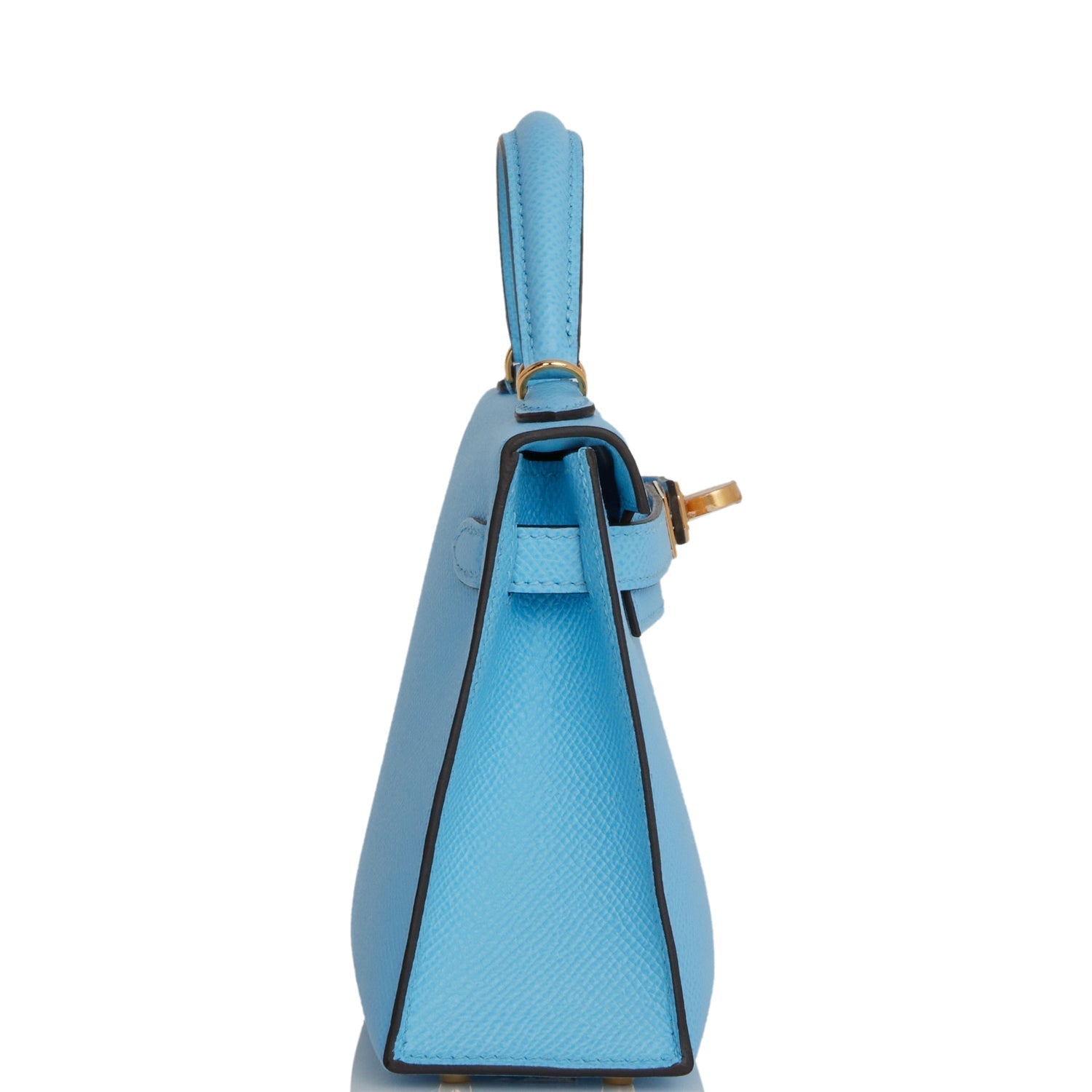 This Kelly, in the Sellier style, is in Celeste epsom leather with gold hardware and has tonal stitching, two straps with front toggle closure, single rolled handle and removable shoulder strap.