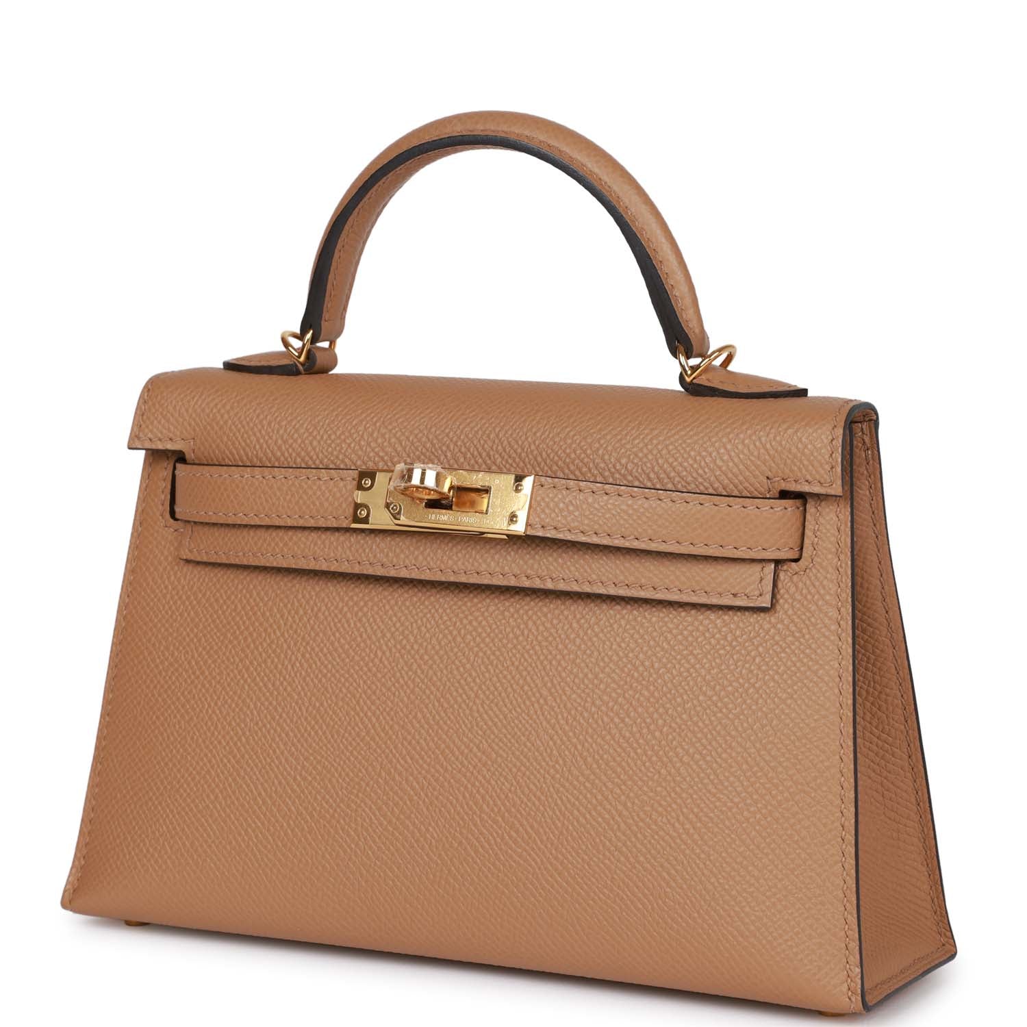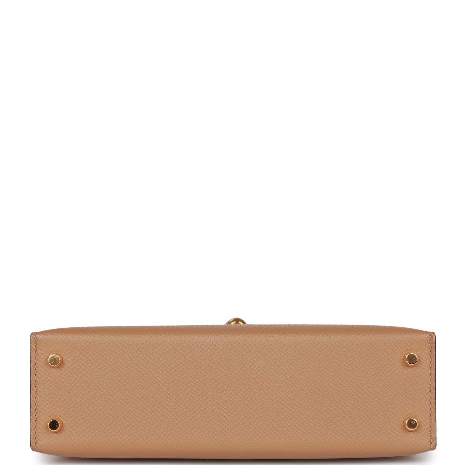 This tiny Kelly, in the Sellier style, is in Chai epsom leather with gold hardware and has tonal stitching, two front straps with front toggle closure, single rolled handle and removable shoulder strap.