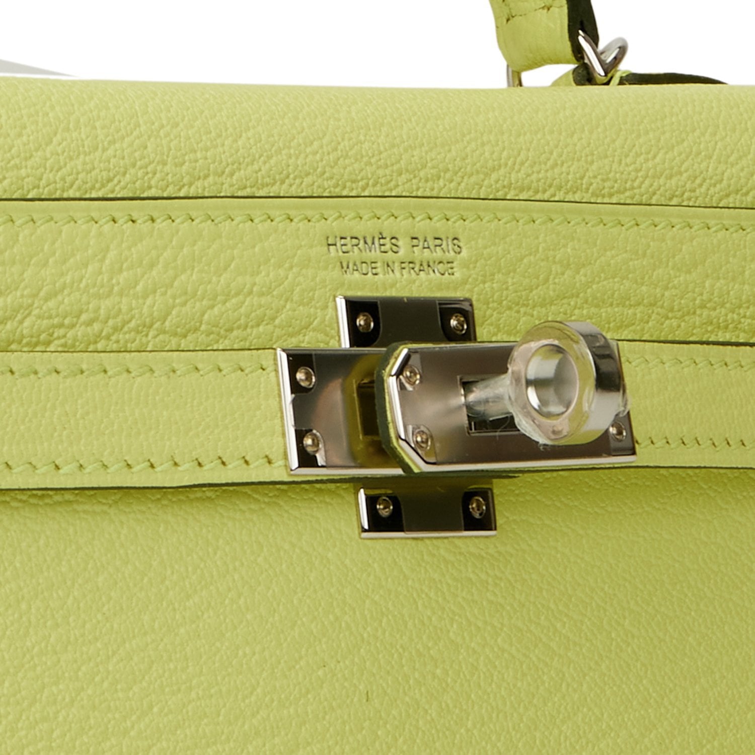 This Kelly, in the Sellier style, is in Jaune Bourgeon chevre leather with palladium hardware and has tonal stitching, two straps with front toggle closure, single rolled handle and removable shoulder strap.