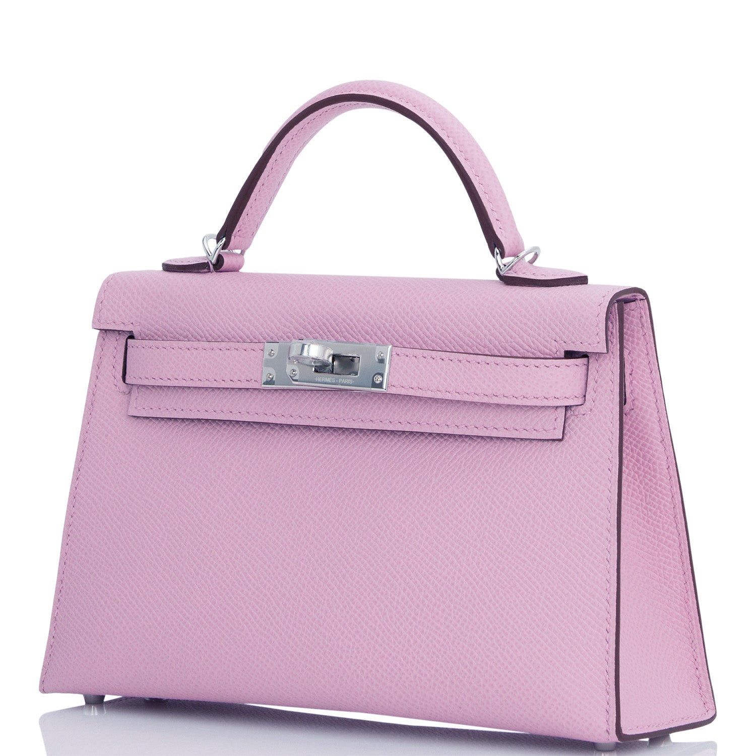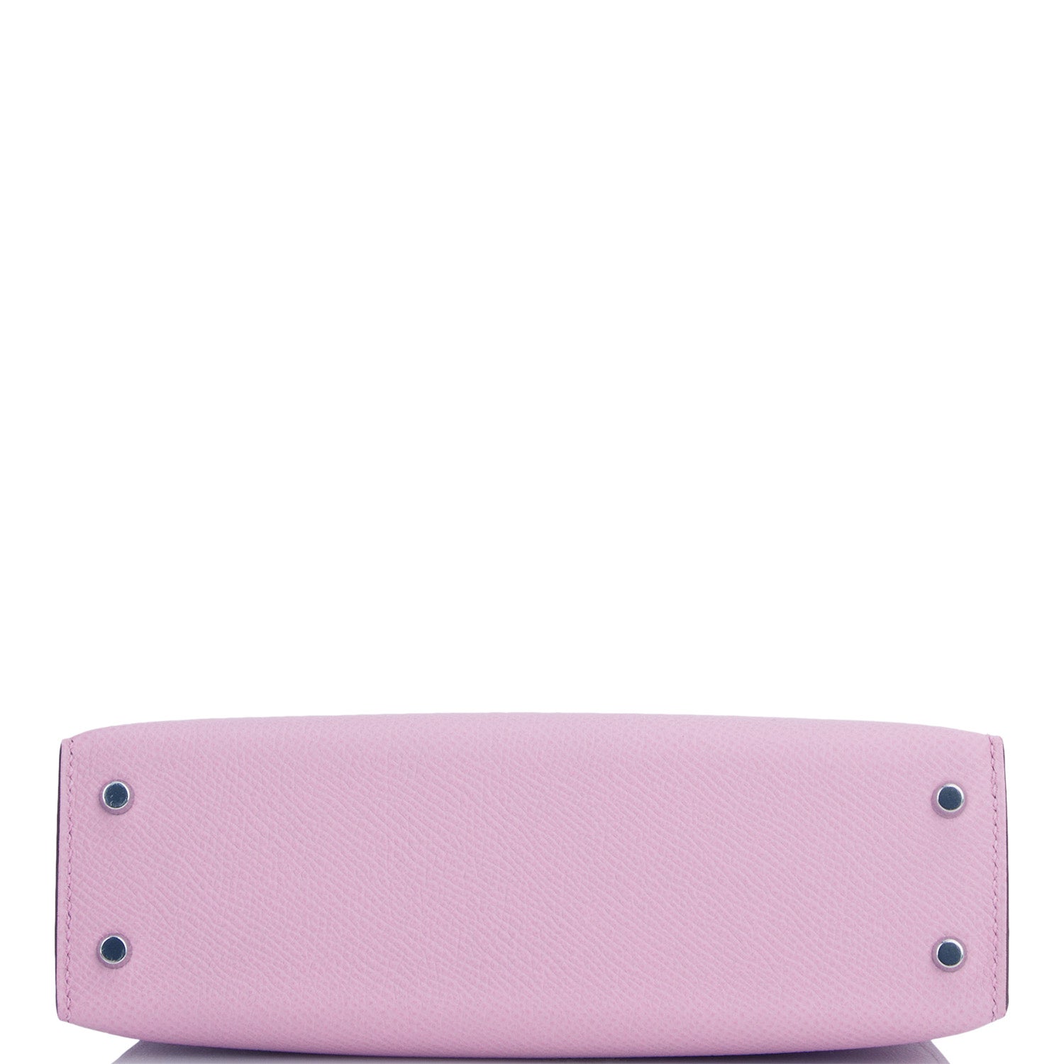 This Kelly, in the Sellier style, is in Mauve Sylvestre epsom leather with palladium hardware and has contrast stitching, front flap, two straps with center toggle closure, single rolled handle and removable shoulder strap.
