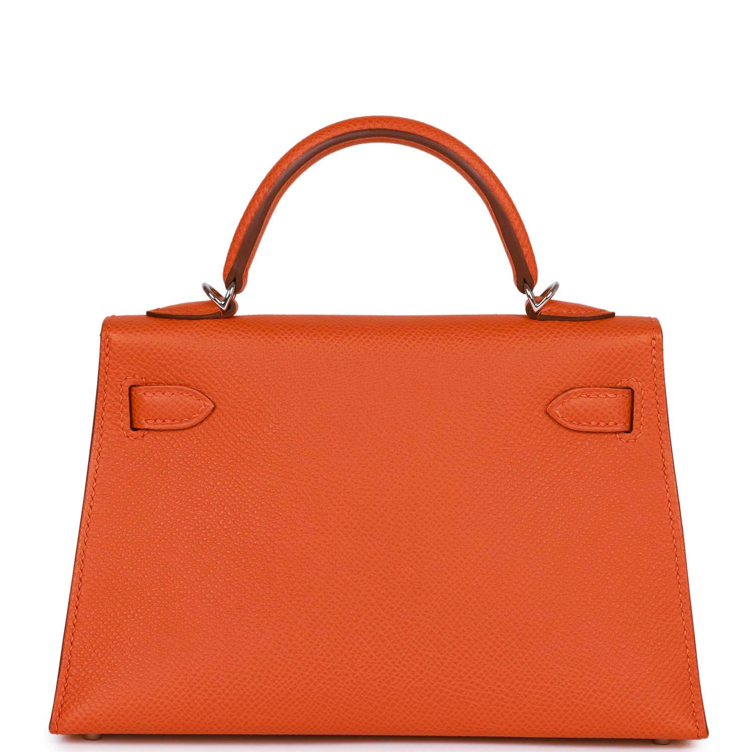 This Kelly, in the Sellier style, is in Orange epsom leather with palladium hardware and has tonal stitching, front flap, two straps with center toggle closure, single rolled handle and removable shoulder strap.