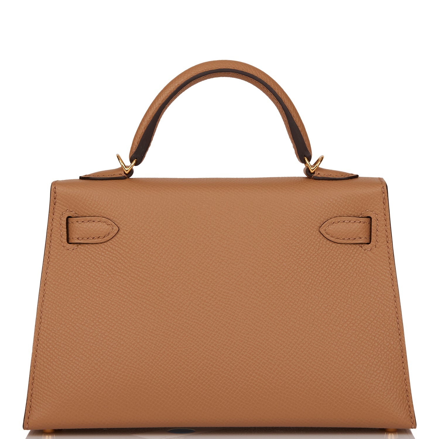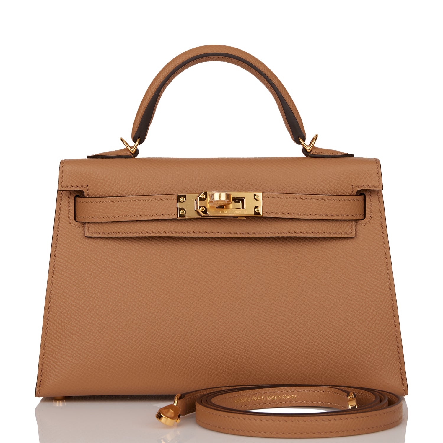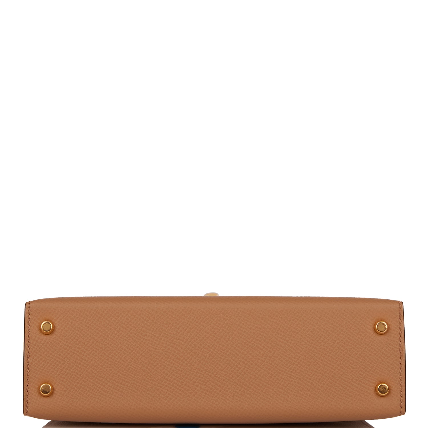 This tiny Kelly, in the Sellier style, is in Chai epsom leather with gold hardware and has tonal stitching, two front straps with front toggle closure, single rolled handle and removable shoulder strap.