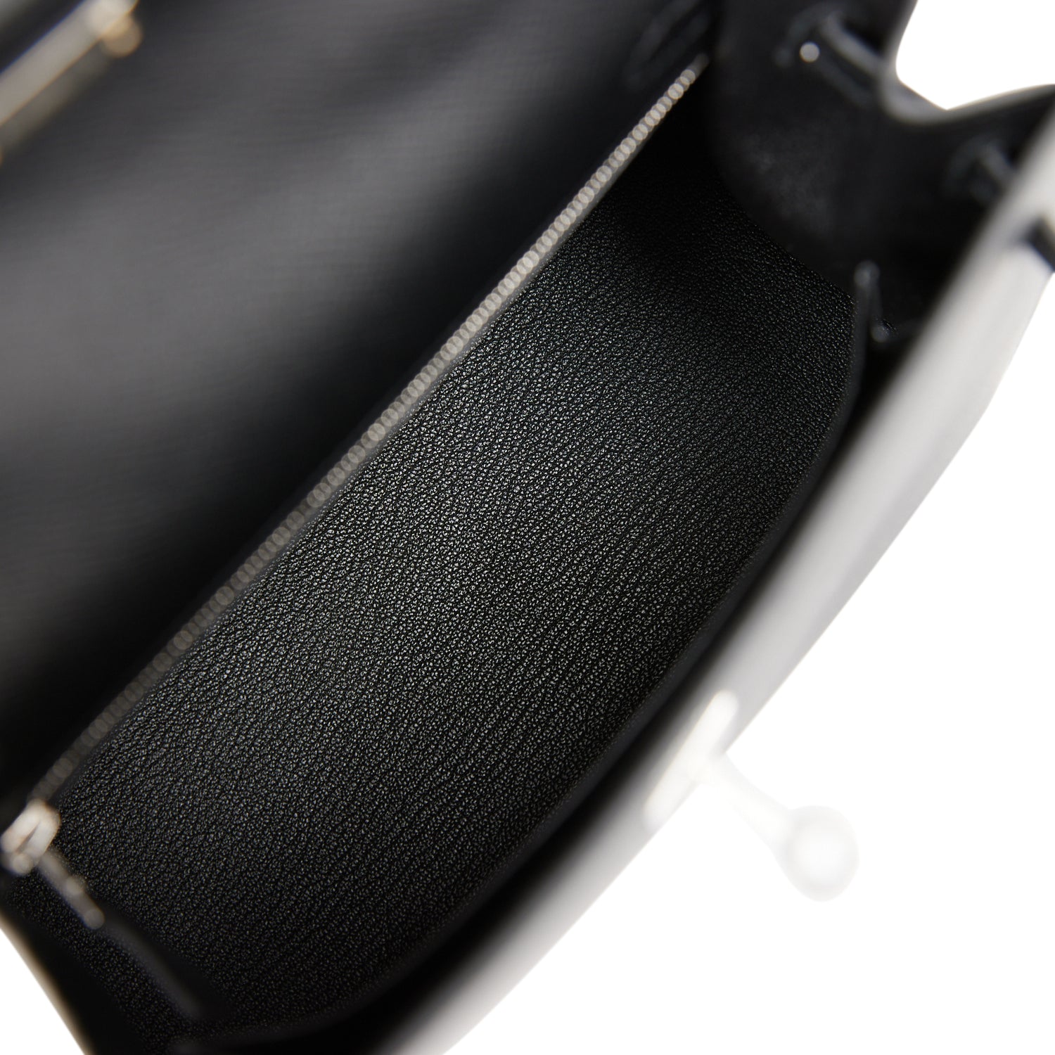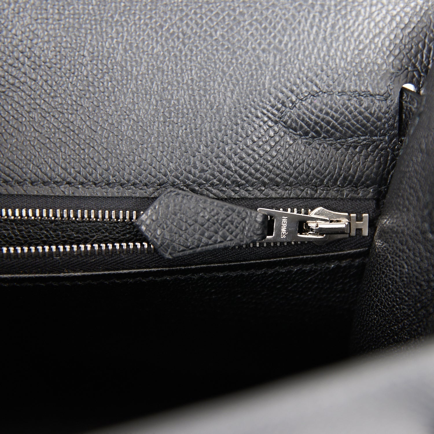 The interior is lined with black chevre leather and has one zip pocket with an Hermes engraved pull and one open pocket on the opposite side.