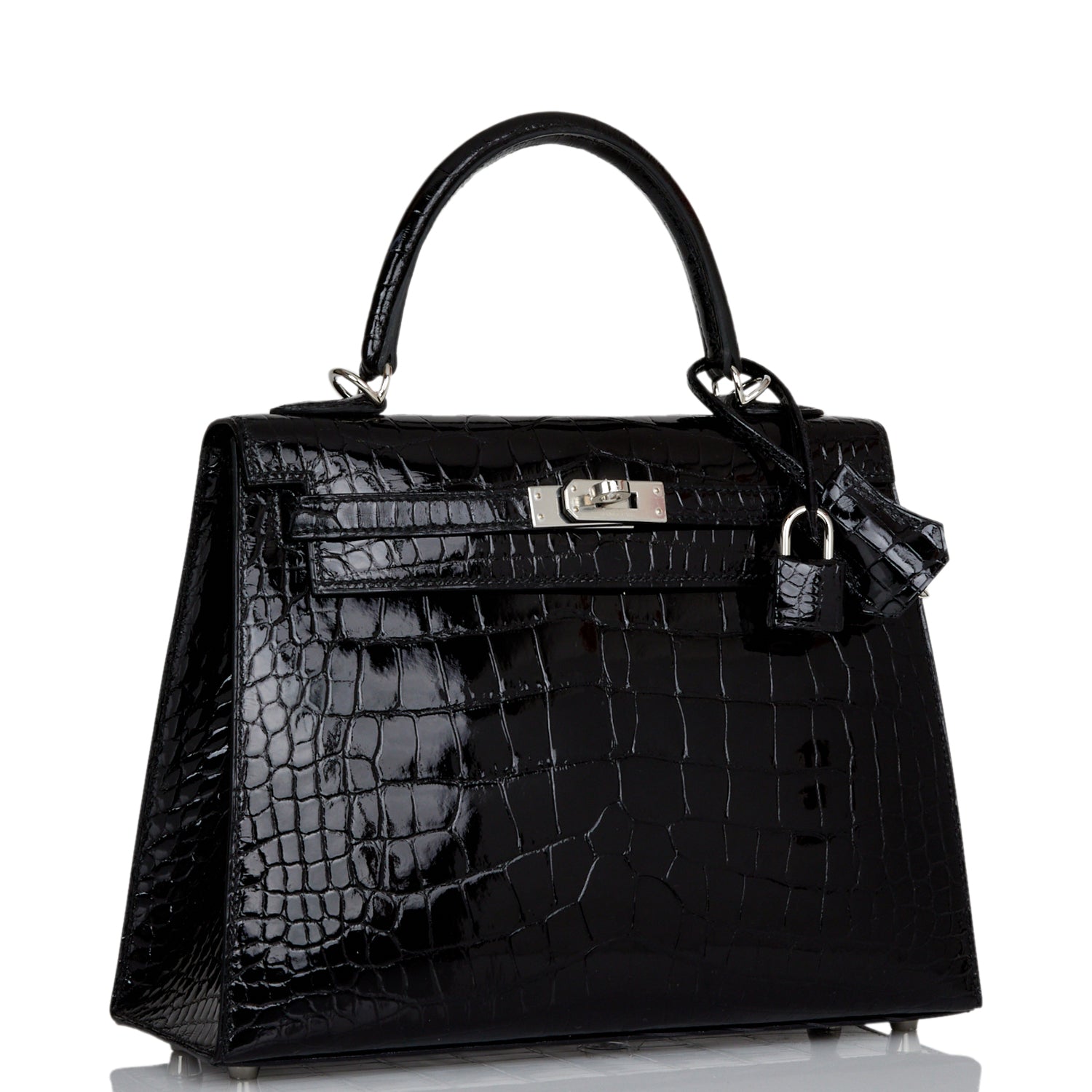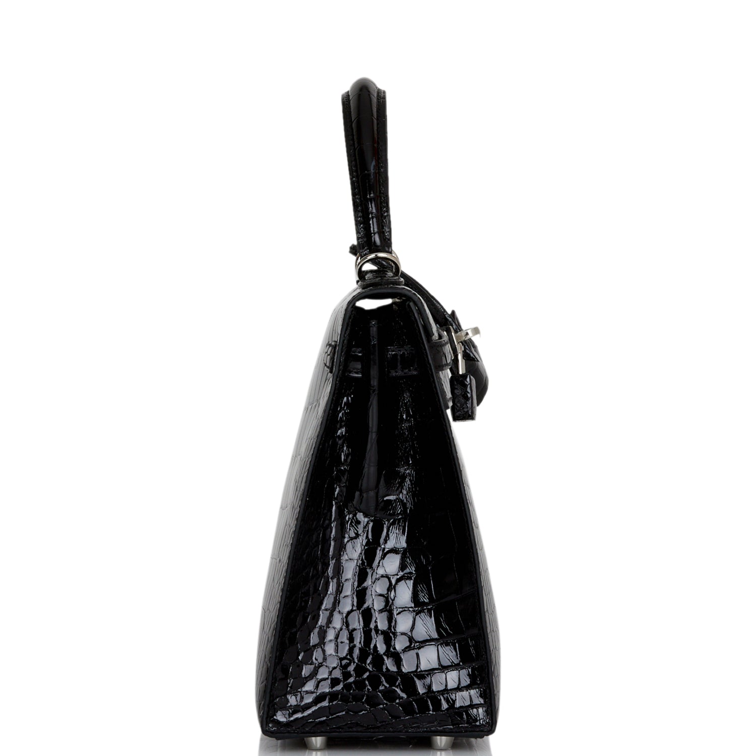 This Sellier Kelly is in Black shiny Mississippiensis alligator with palladium hardware and has tonal stitching, front flap, two straps with center toggle closure, clochette with lock and two keys, single rolled handle and removable strap.