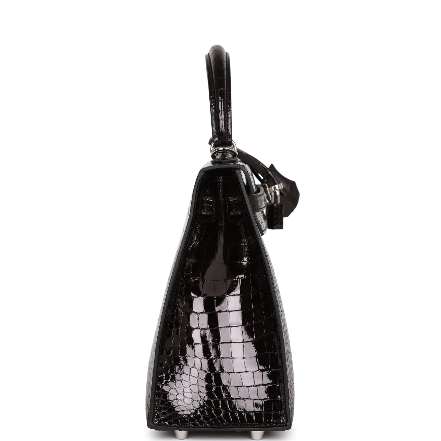 This Kelly, in the sellier style, is in Black shiny Porosus crocodile with palladium hardware and has tonal stitching, front flap, two straps with center toggle closure, clochette with lock and two keys, single rolled handle and removable strap.