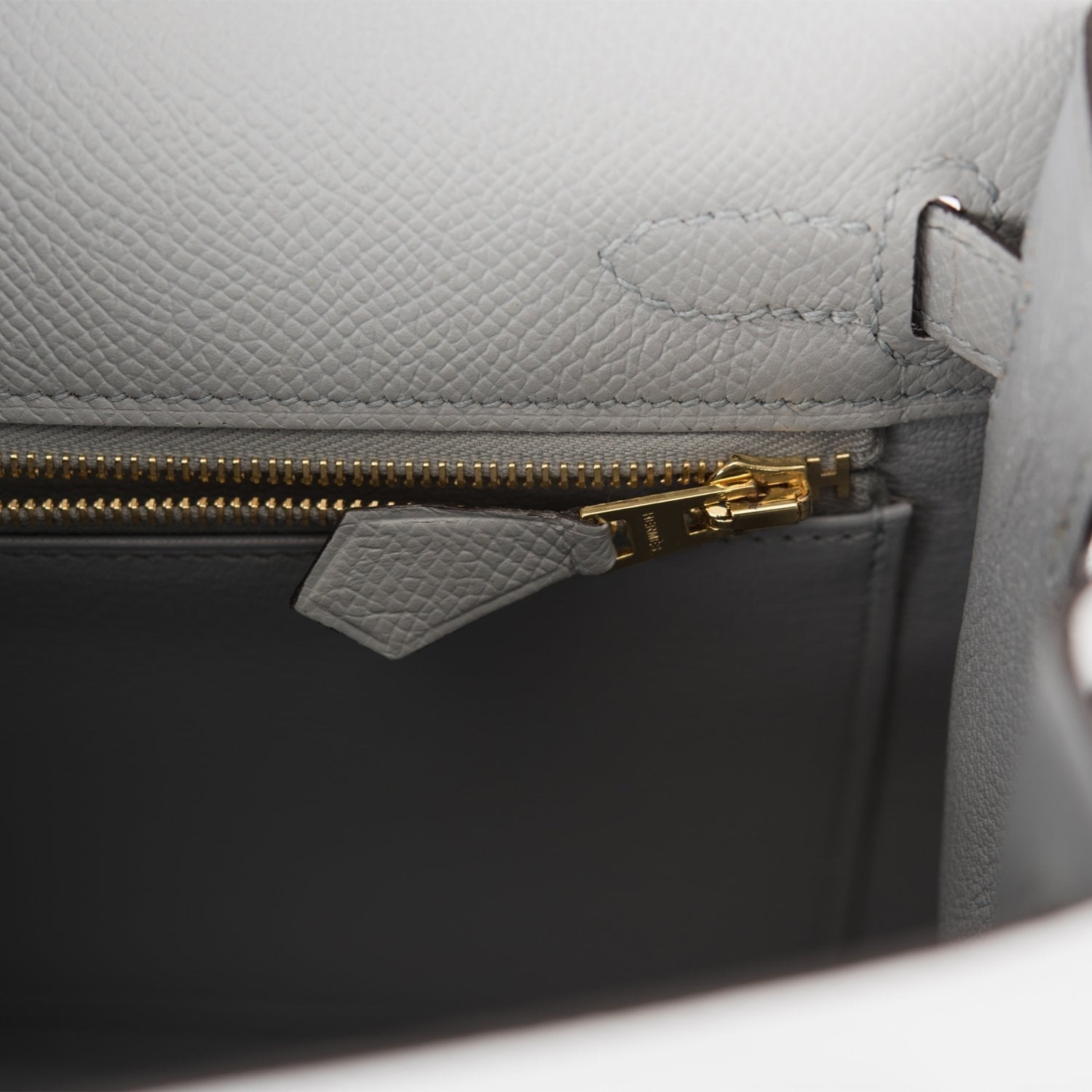 The interior is lined with Bleu Glacier chevre leather and has one zip pocket with an Hermes engraved pull and one open pocket on the opposite side.