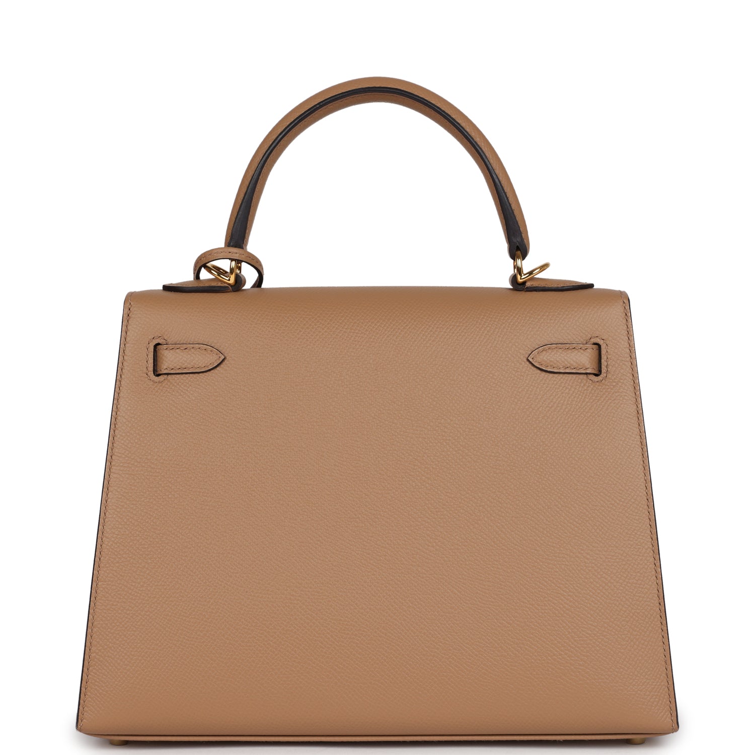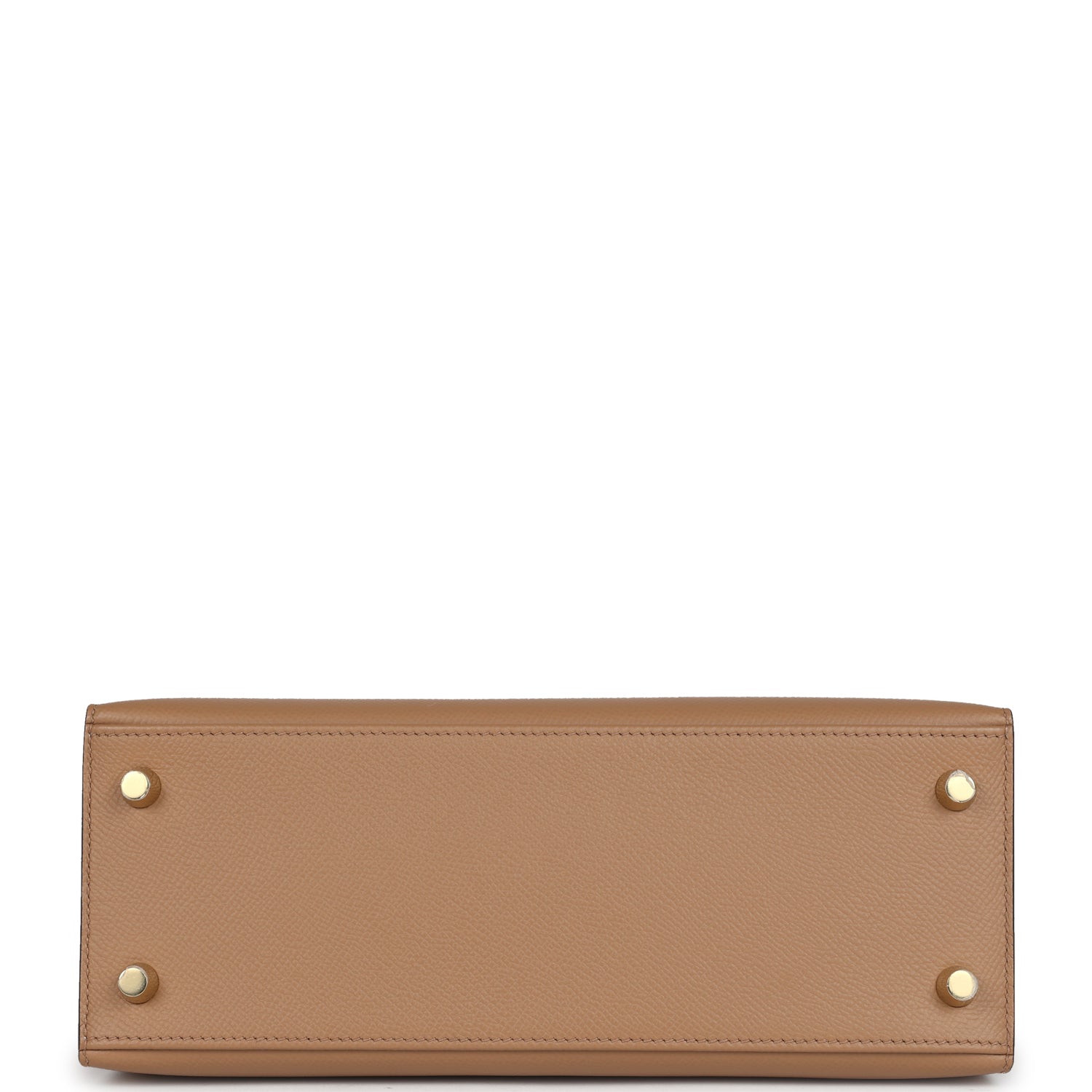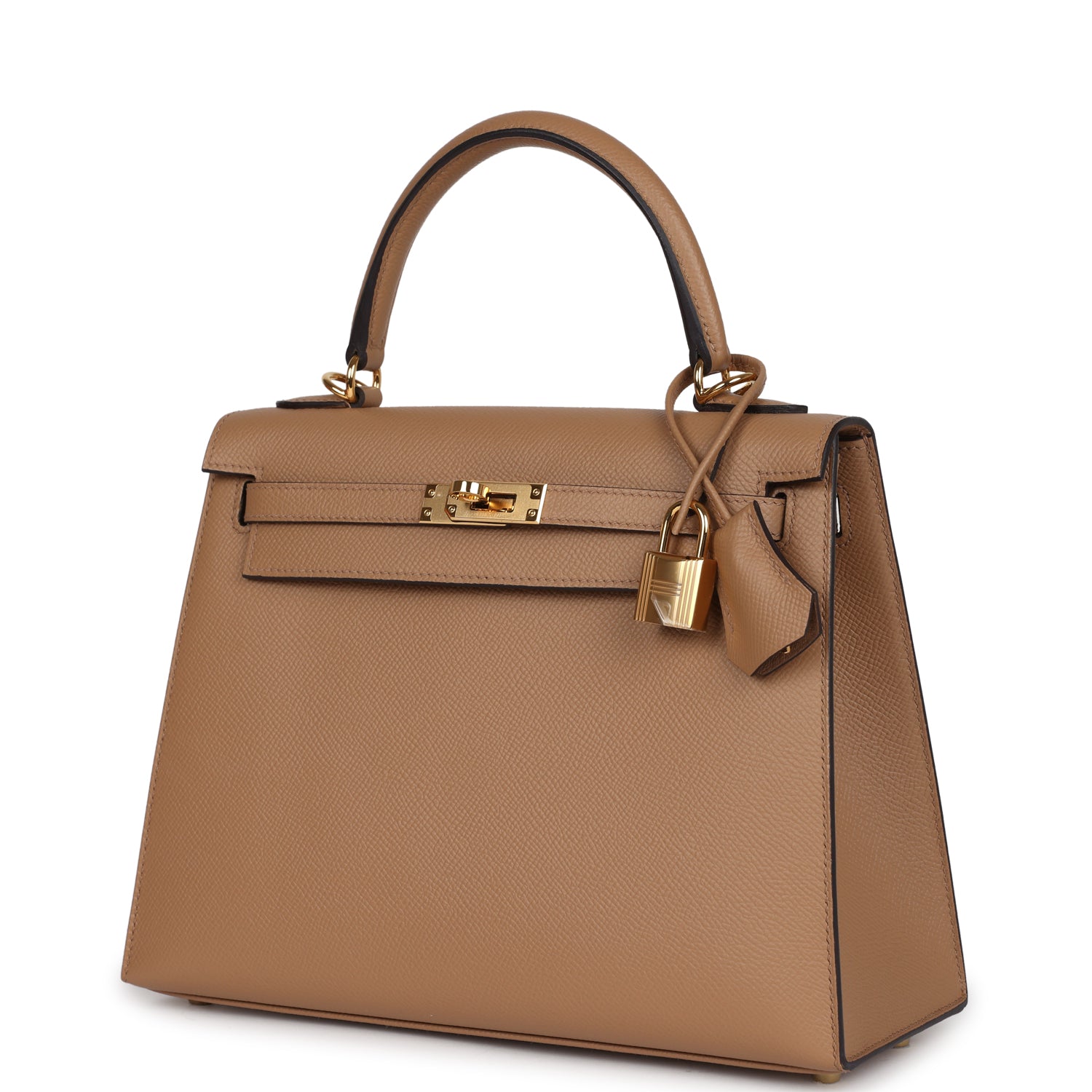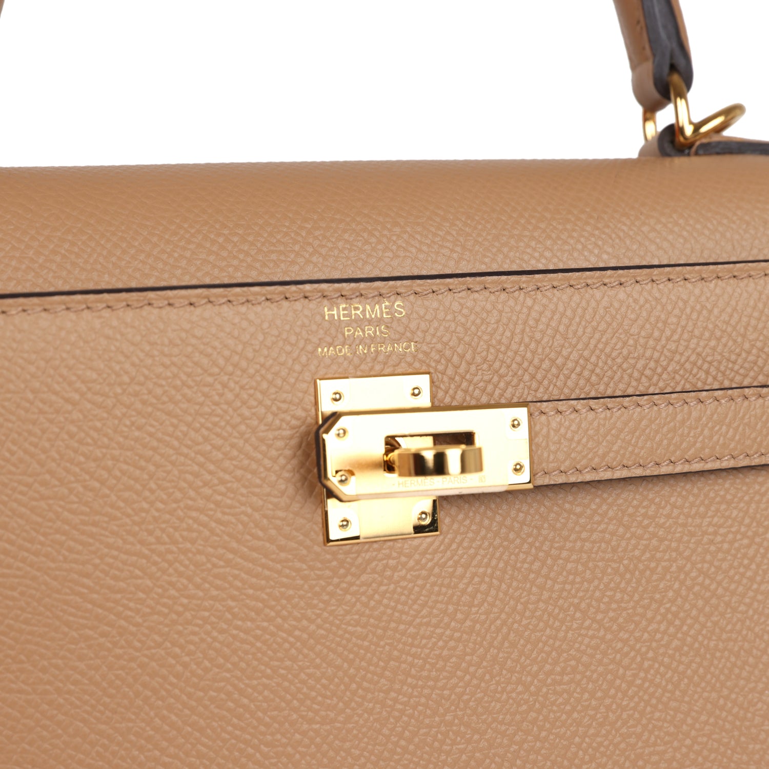 Kelly, in the Sellier style, is in Chai epsom leather with gold hardware and has tonal stitching, front flap, two straps with center toggle closure, clochette with lock and two keys a single rolled handle and removable shoulder strap.