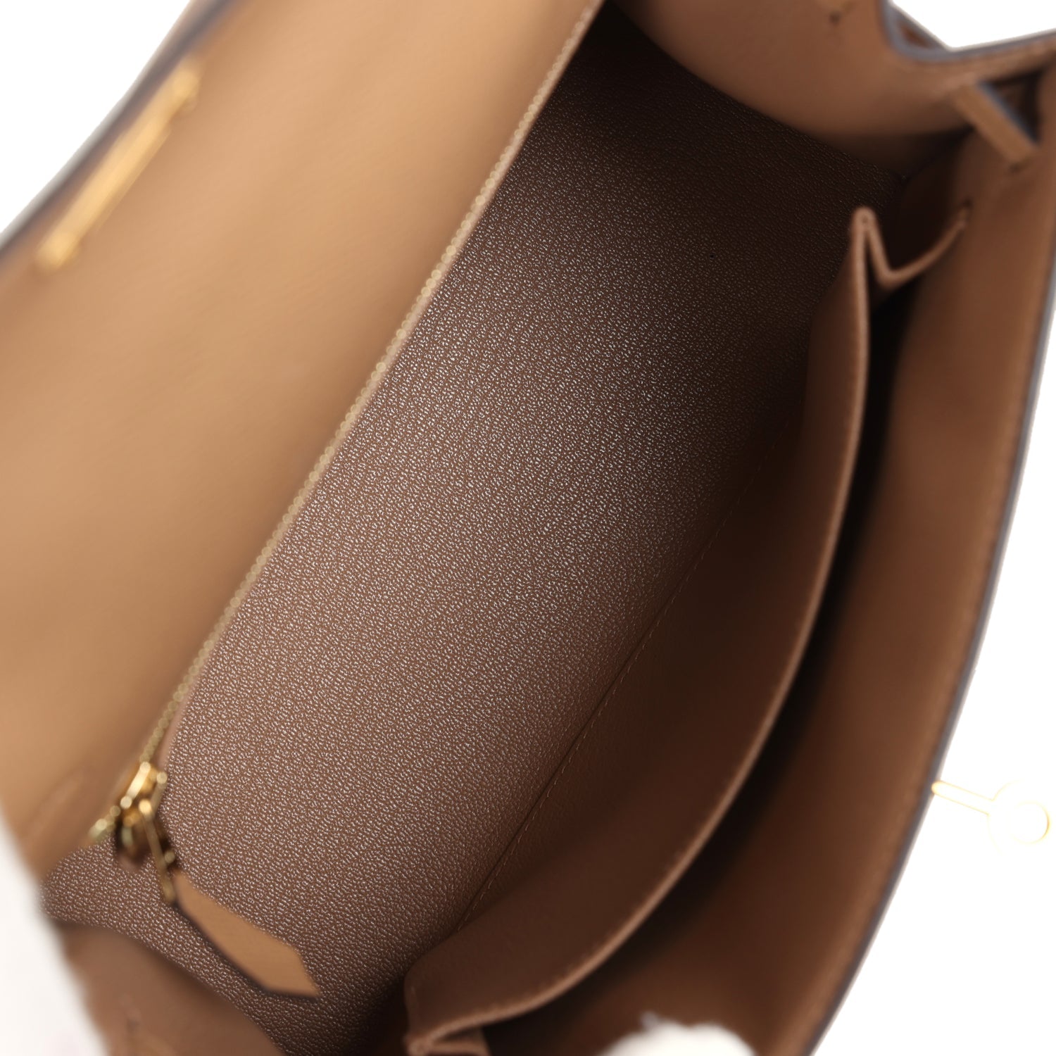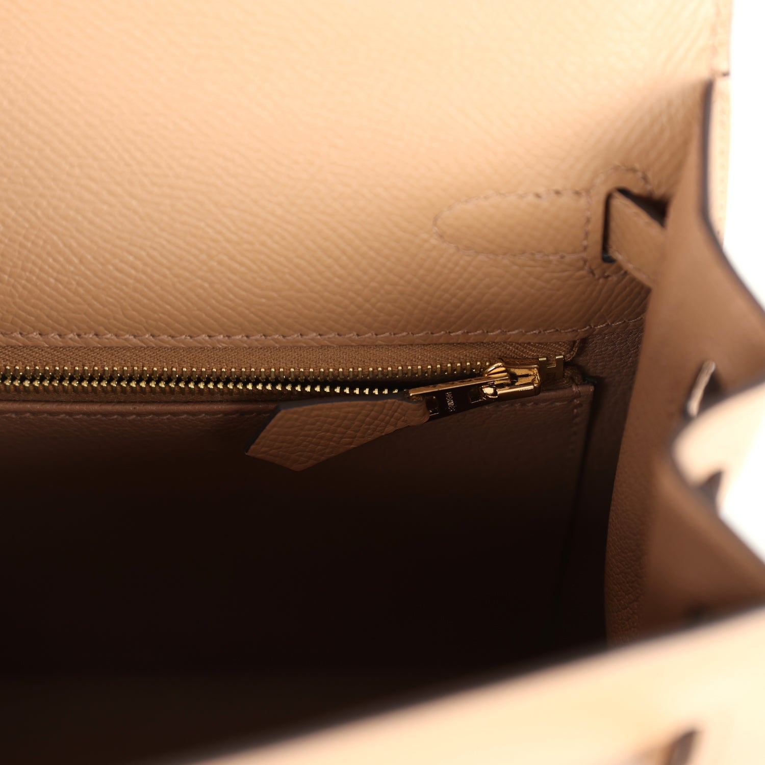 The interior is lined with Chai chevre leather and has one zip pocket with an Hermes engraved pull and one open pocket on the opposite side.