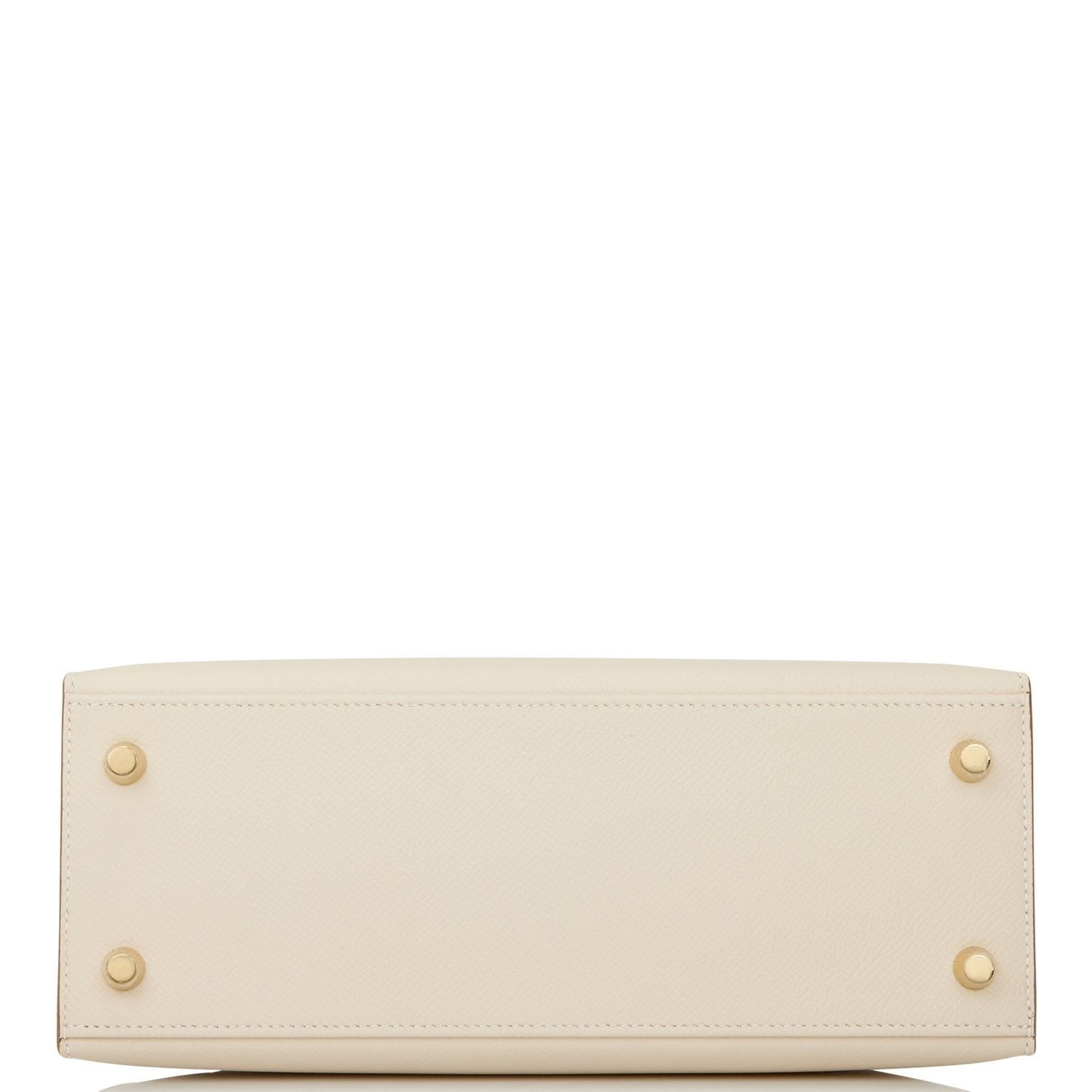 This Kelly, in the Sellier style, is in Craie epsom leather with gold hardware and has tonal stitching, front flap, two straps with center toggle closure, clochette with lock and two keys, single rolled handle and removable shoulder strap.
