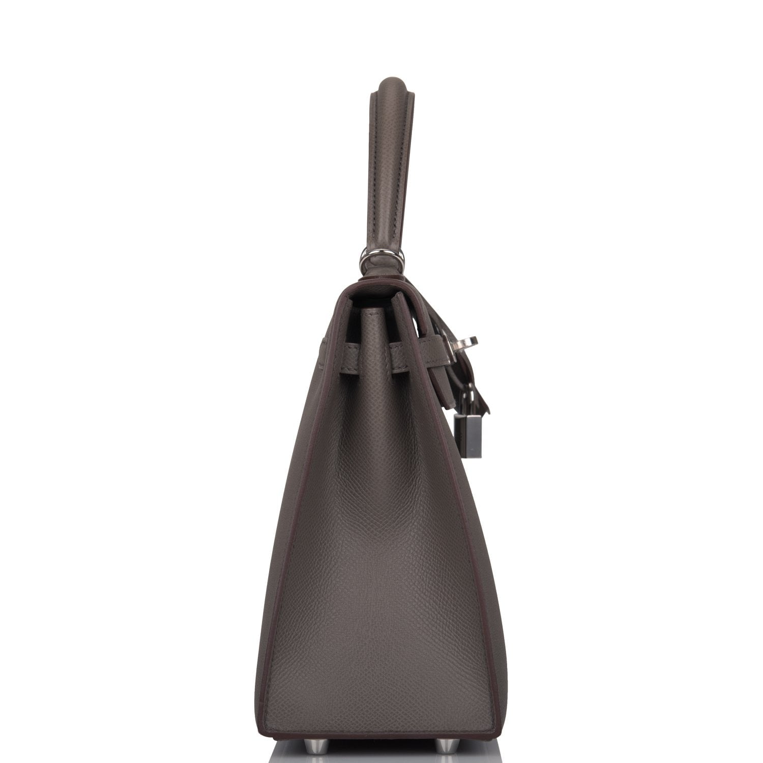 This Kelly, in the Sellier style, is in Etain epsom leather with palladium hardware and has tonal stitching, two straps with front toggle closure, clochette with lock and two keys, a single rolled handle and removable shoulder strap.