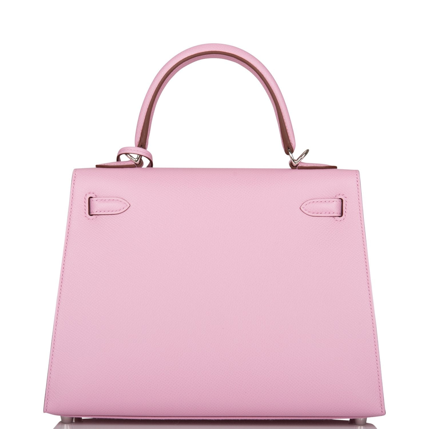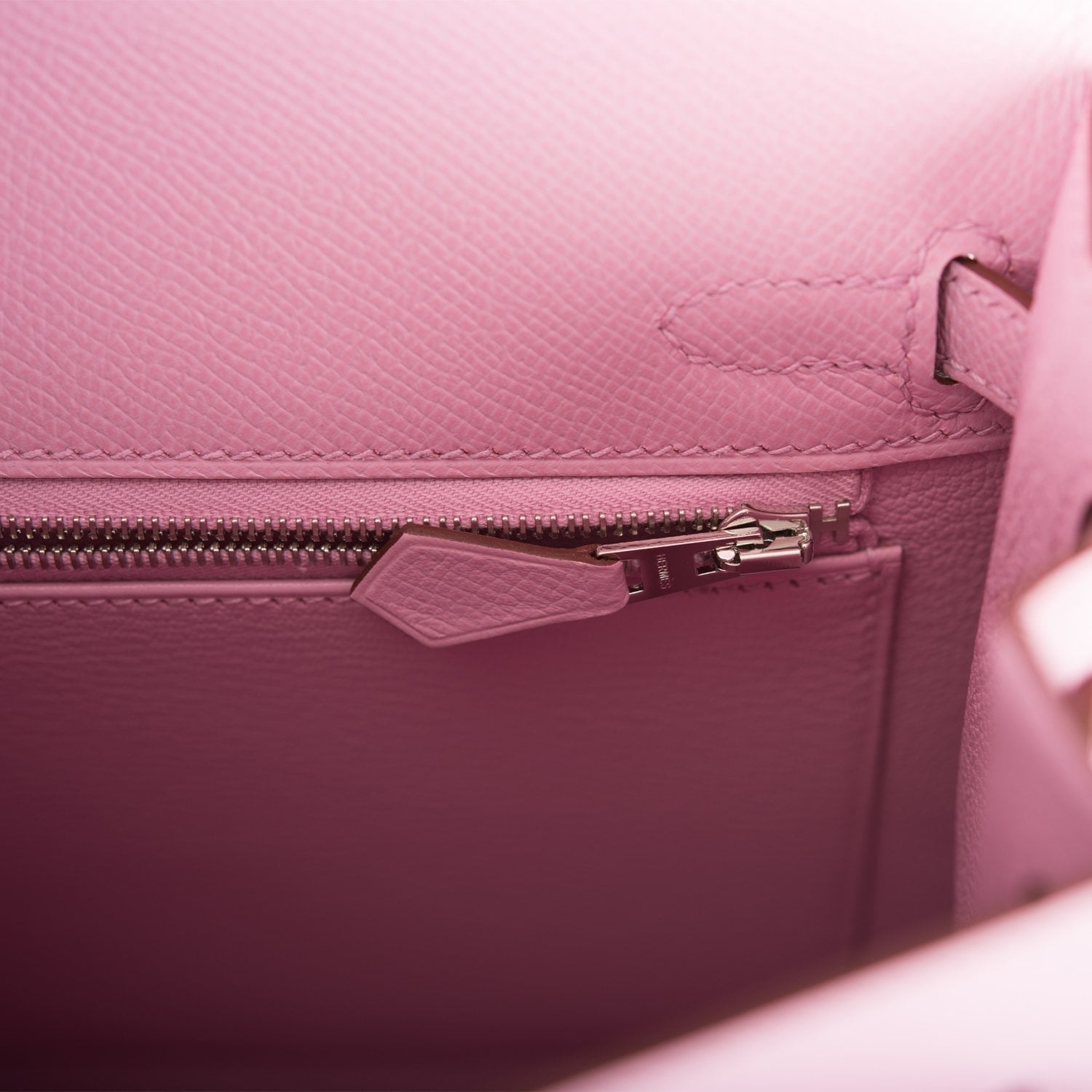 This Kelly, in the Sellier style, is in Mauve Sylvestre epsom leather with palladium hardware and has tonal stitching, two front straps with toggle closure, clochette with lock and two keys, single rolled handle and removable shoulder strap.