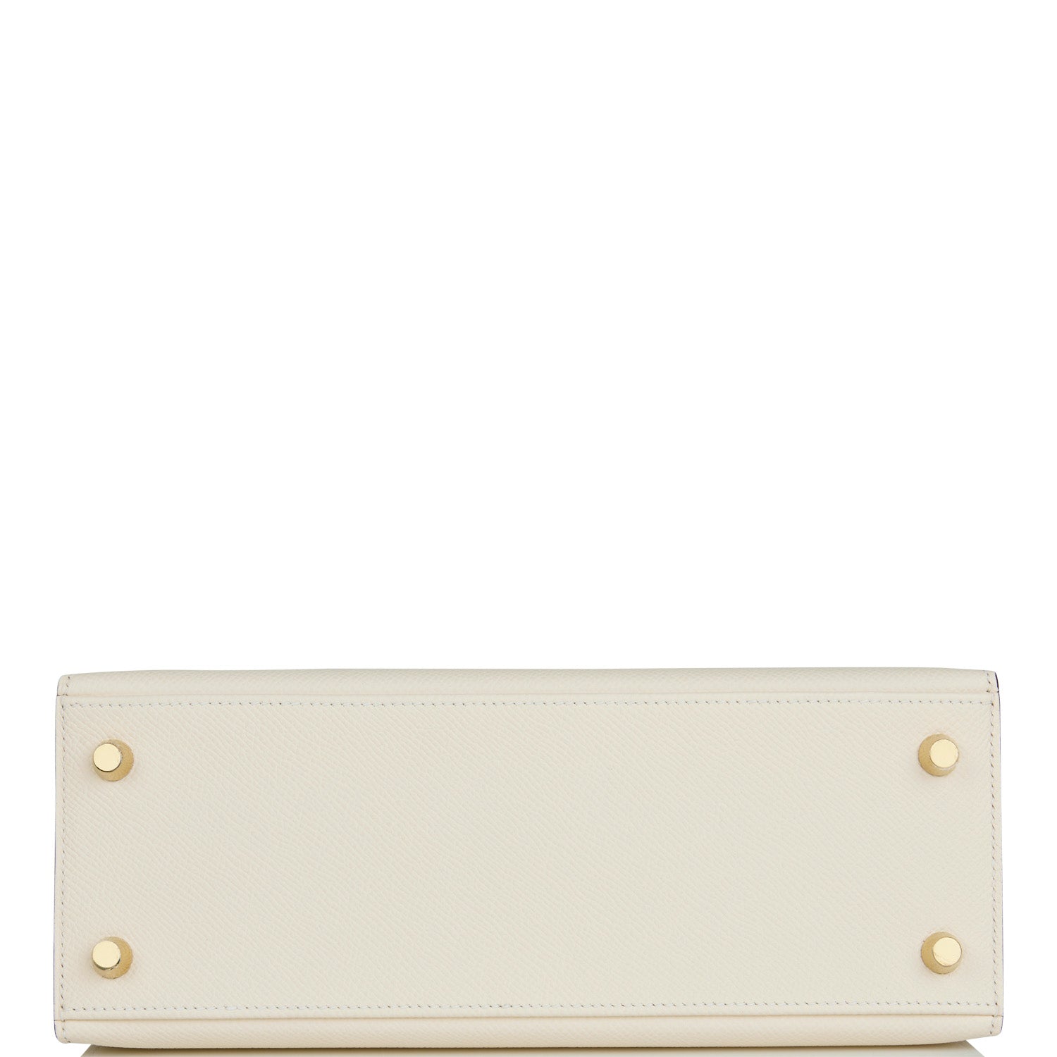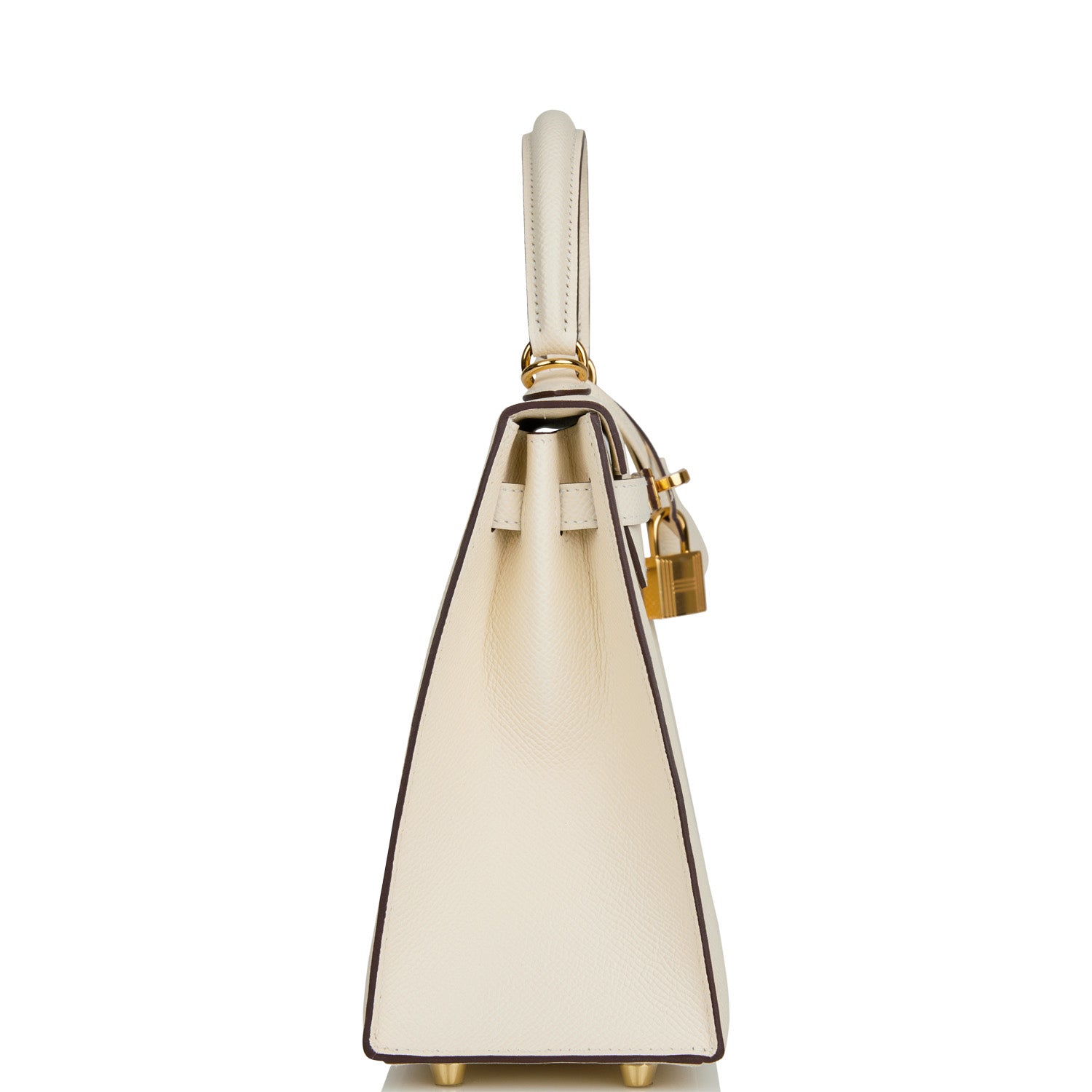 This Kelly, in the Sellier style, is in Nata epsom leather with gold hardware and has tonal stitching, front flap, two straps with center toggle closure, clochette with lock and two keys, single rolled handle and removable shoulder strap.