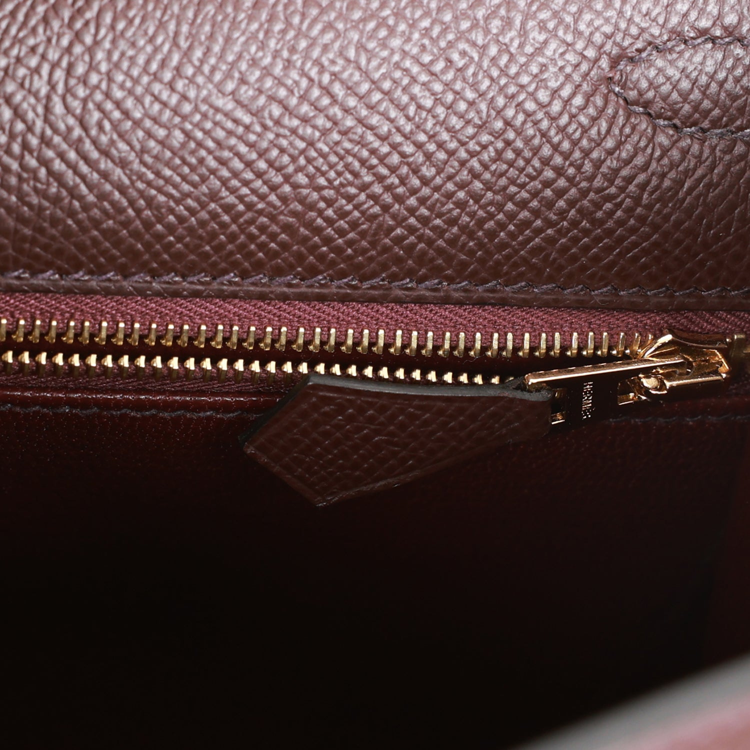 The interior is lined with Rouge Sellier chevre leather and has one zip pocket with an Hermes engraved pull and one open pocket on the opposite side.