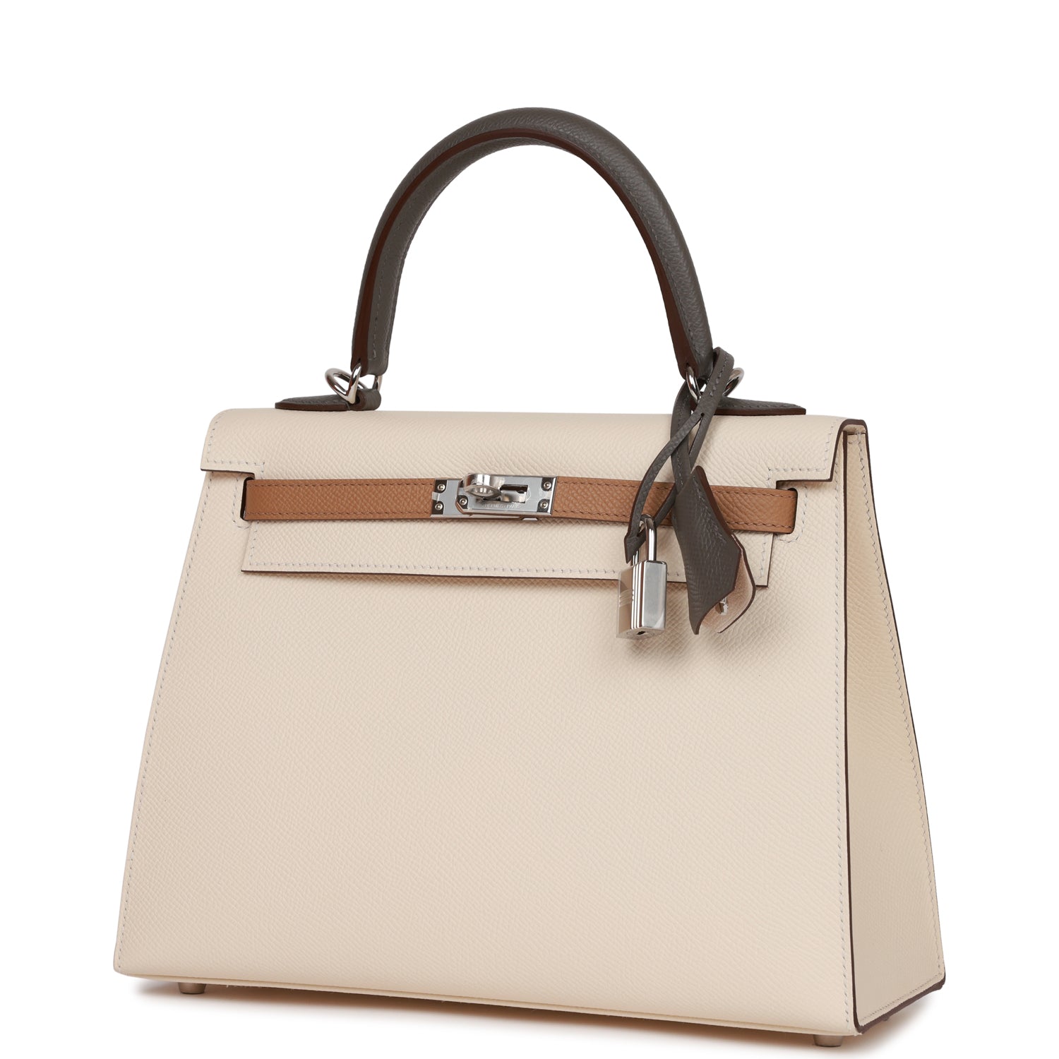 This Tri-Color Kelly, in the Sellier style, is in Nata, Chai and Gris Meyer epsom leather with palladium hardware and has tonal stitching, front flap, two straps with center toggle closure, clochette with lock and two keys, single rolled handle and removable shoulder strap.