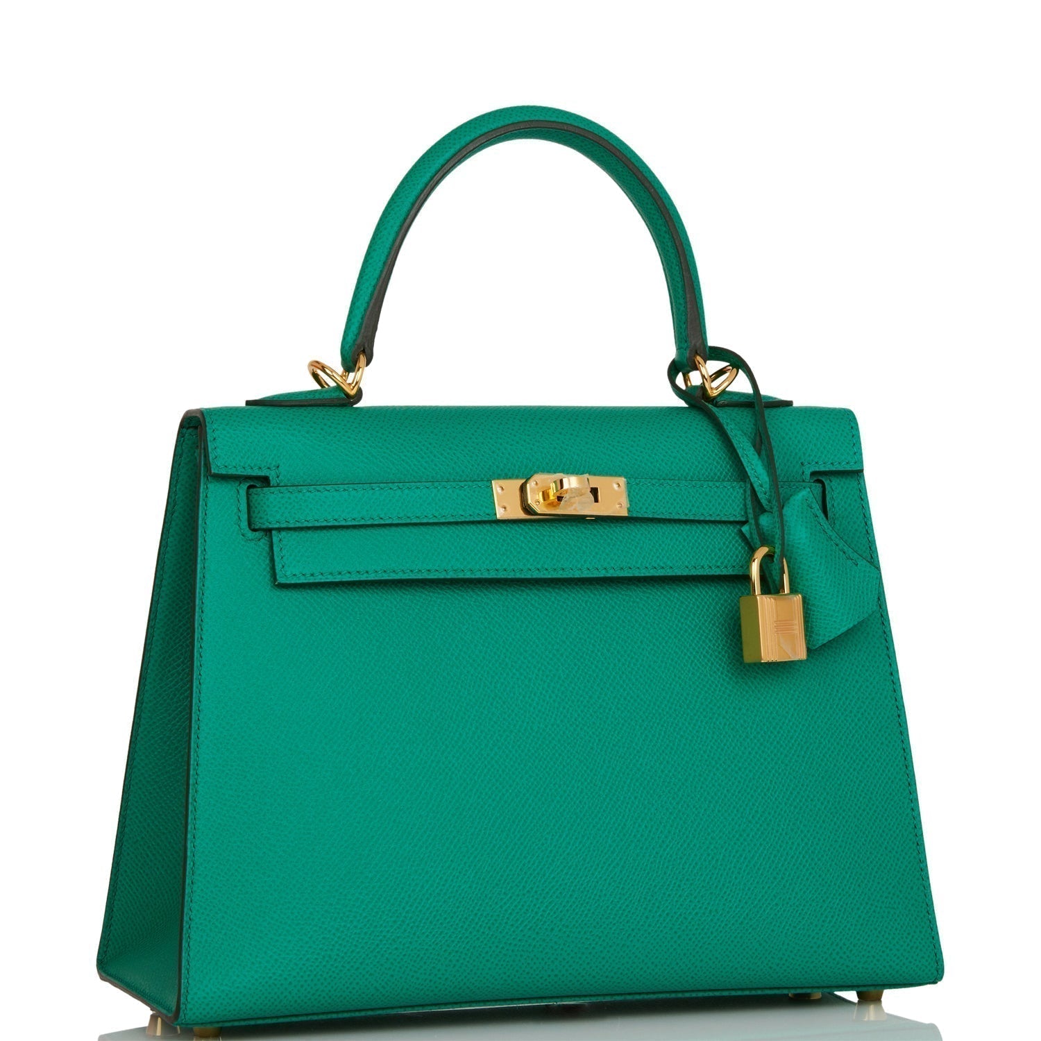 This Sellier Kelly is of Vert Jade epsom leather with gold hardware and has tonal stitching, front flap, two straps with center toggle closure, clochette with lock and two keys, single rolled handle and an optional shoulder strap.