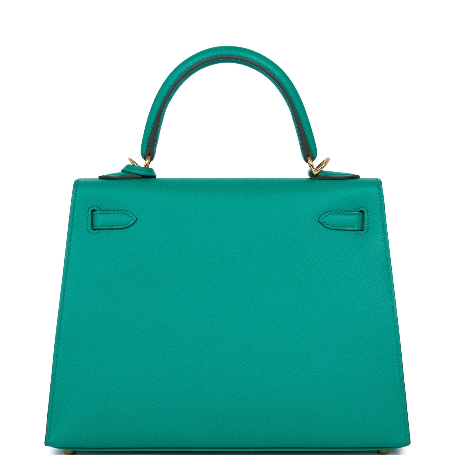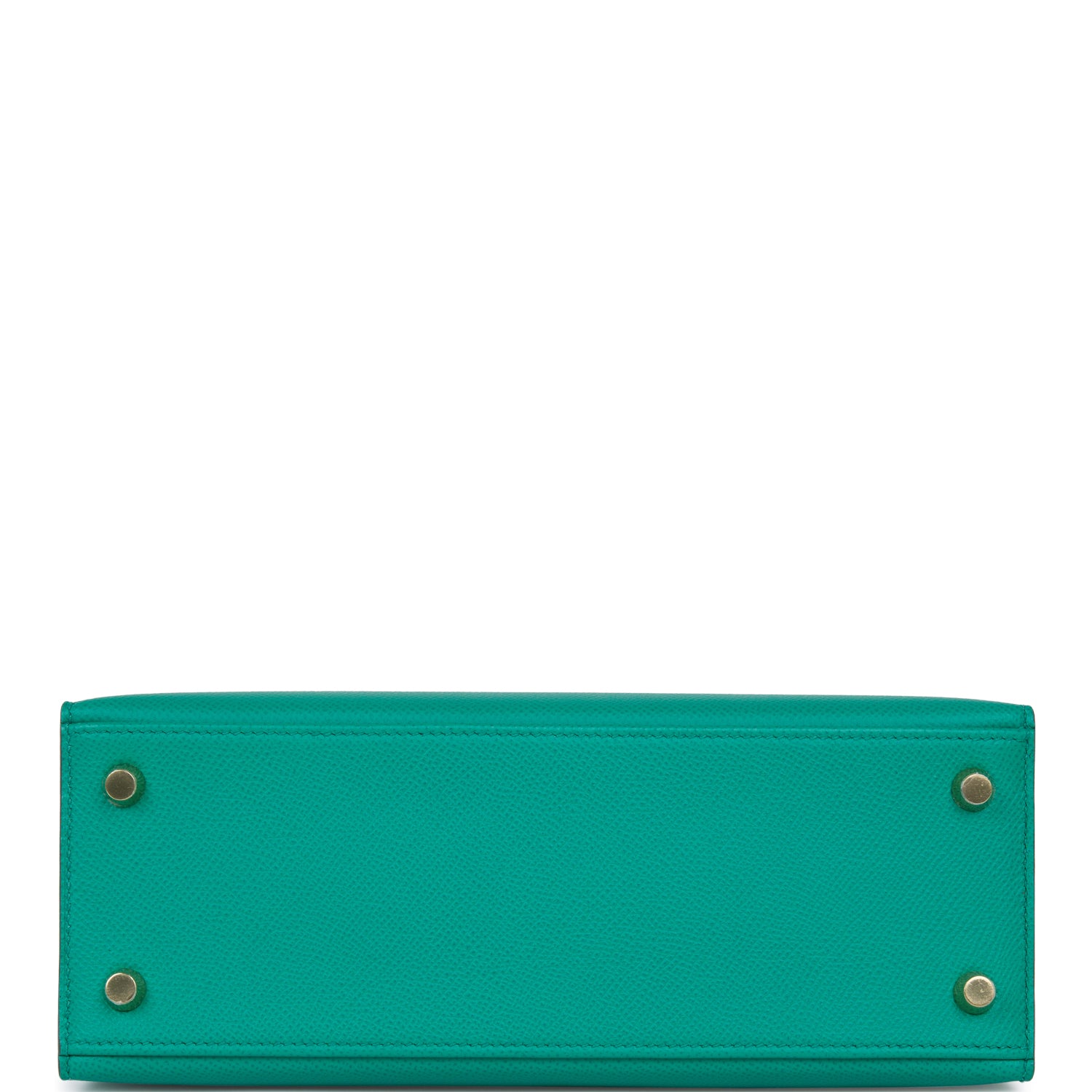 This Sellier Kelly is of Vert Jade epsom leather with gold hardware and has tonal stitching, front flap, two straps with center toggle closure, clochette with lock and two keys, single rolled handle and an optional shoulder strap.