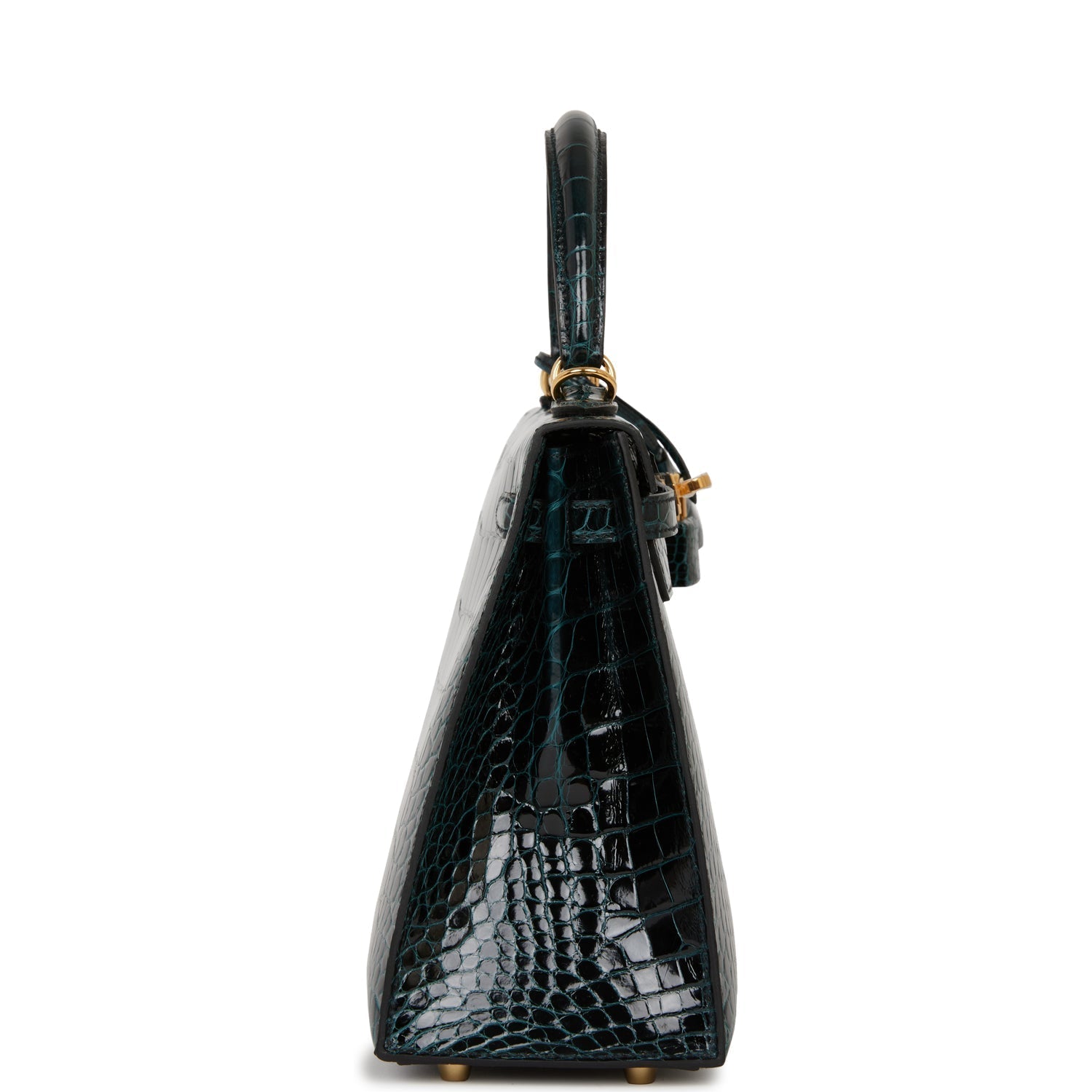 This Sellier Kelly is in Vert Rousseau shiny alligator with gold hardware and has tonal stitching, front flap, two straps with center toggle closure, clochette with lock and two keys, single rolled handle and removable strap.