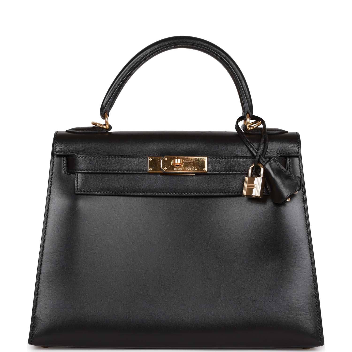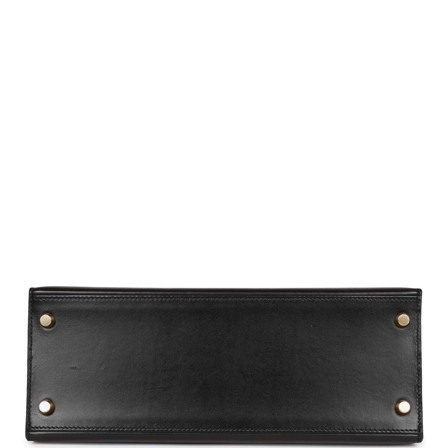 This Kelly, in the Sellier style, is of black box leather with gold hardware and has tonal stitching, a front toggle closure, a clochette with lock and two keys and a single rolled handle.
