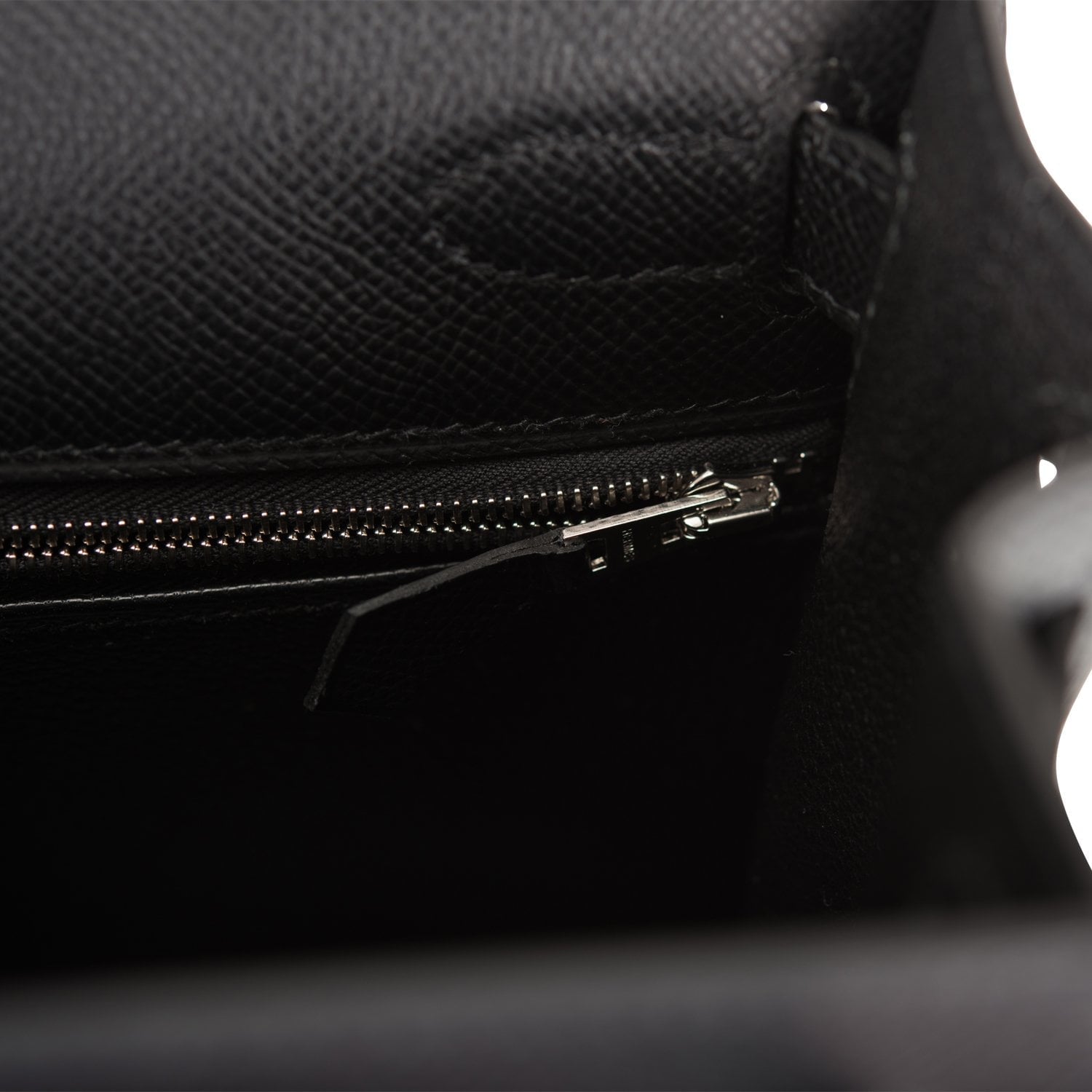 This Kelly Sellier is of black epsom leather with palladium hardware and has tonal stitching, a front toggle closure, a clochette with lock and two keys, a single rolled handle and an optional shoulder strap.