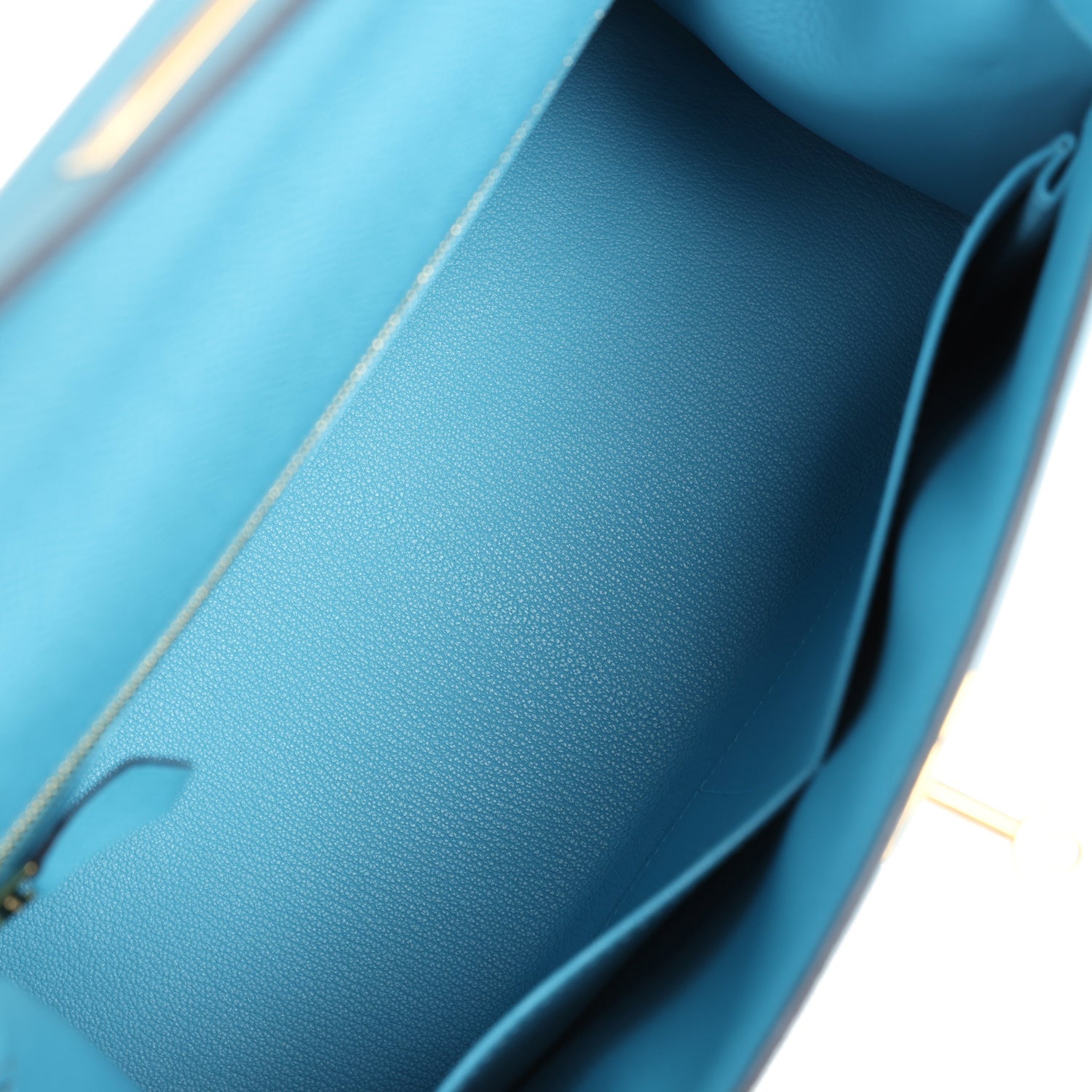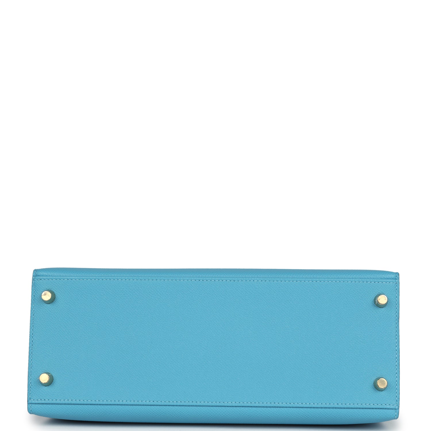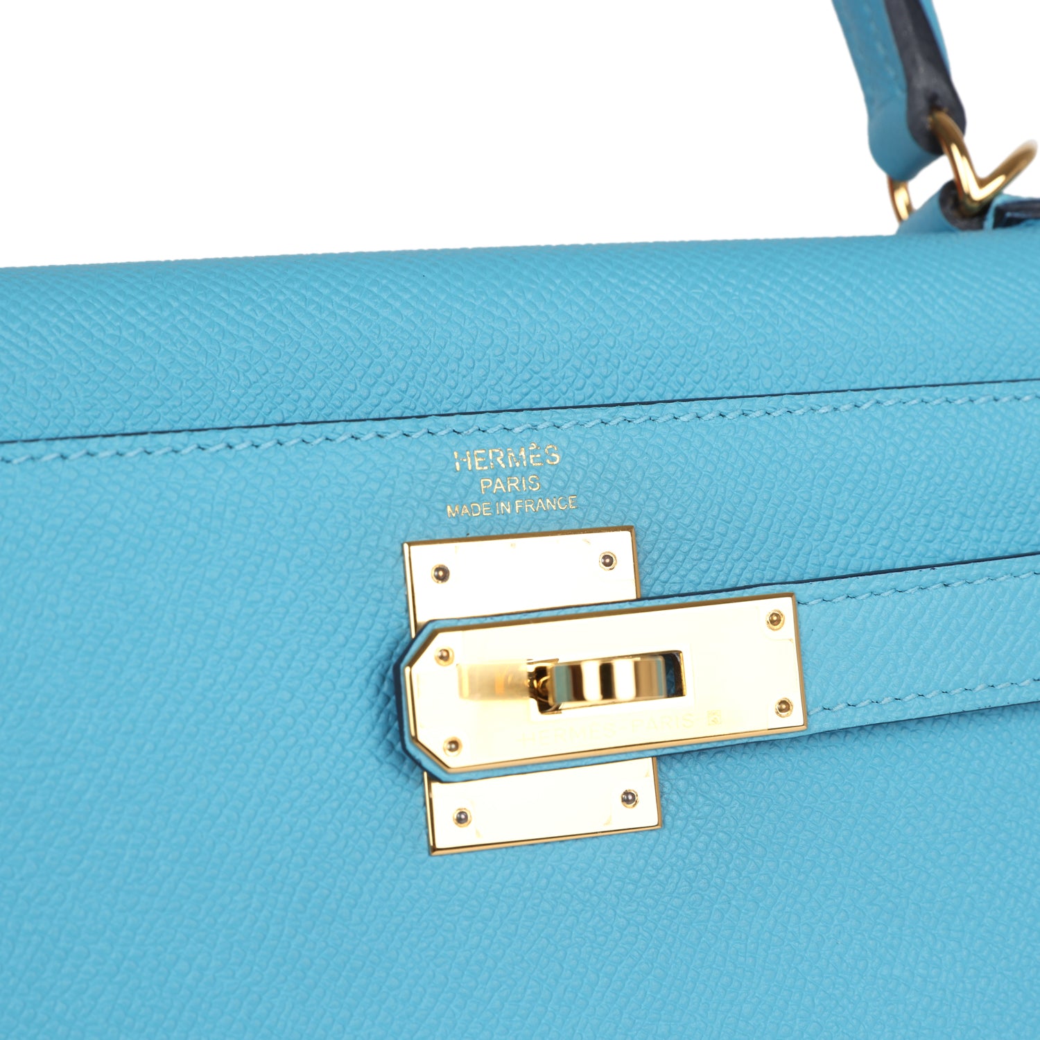 Kelly, in the Sellier style, is in Bleu du Nord epsom leather with gold hardware and has tonal stitching, front flap, two straps with center toggle closure, clochette with lock and two keys a single rolled handle and removable shoulder strap.