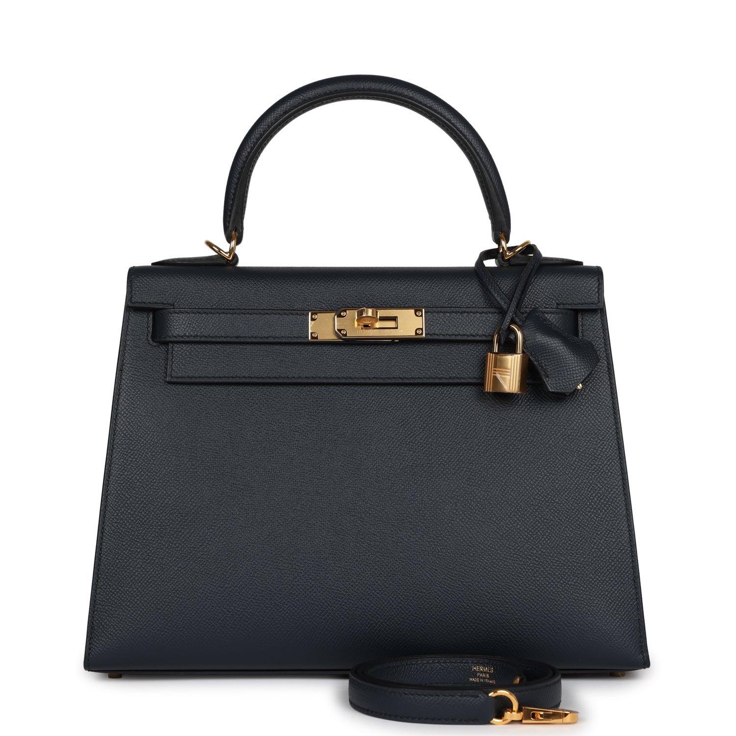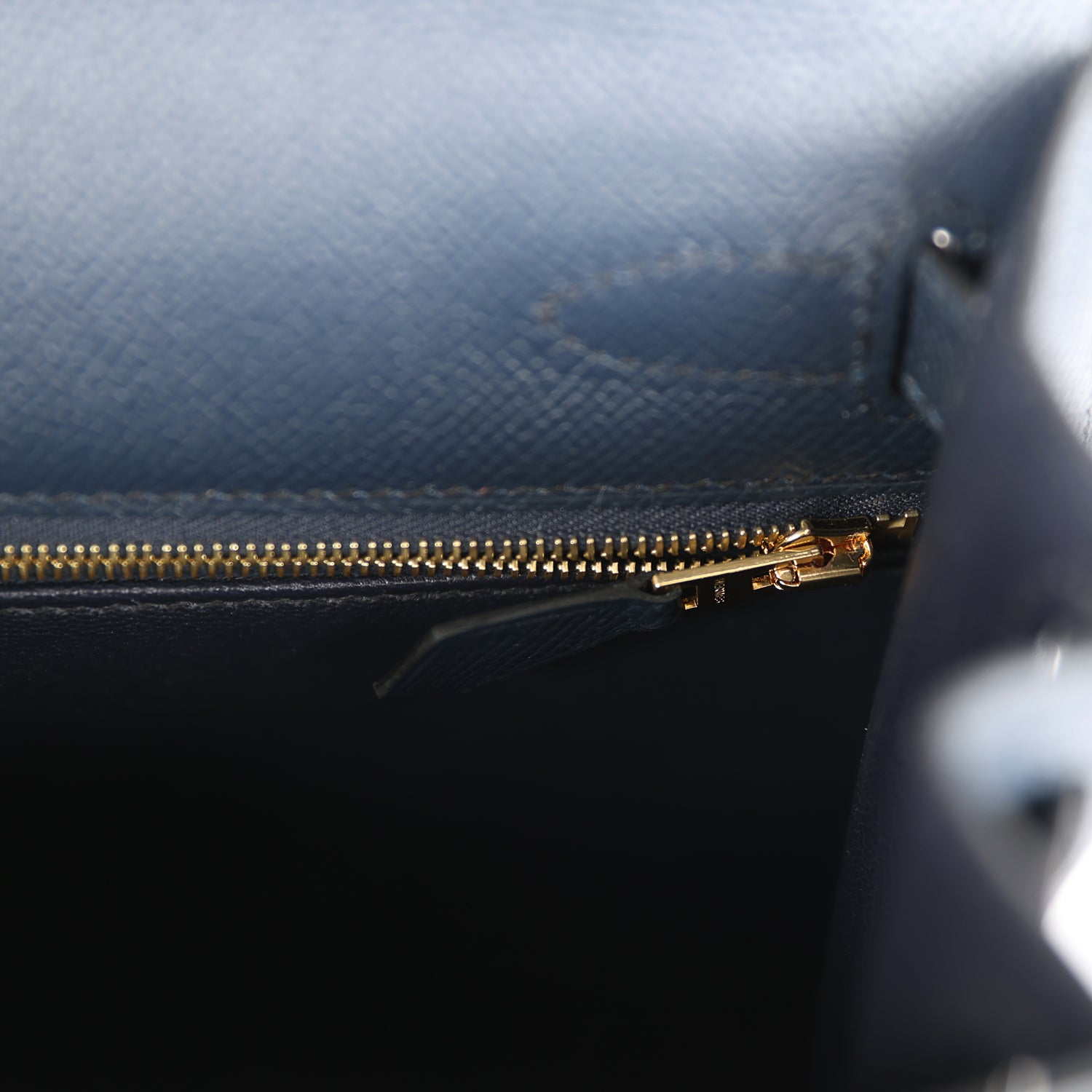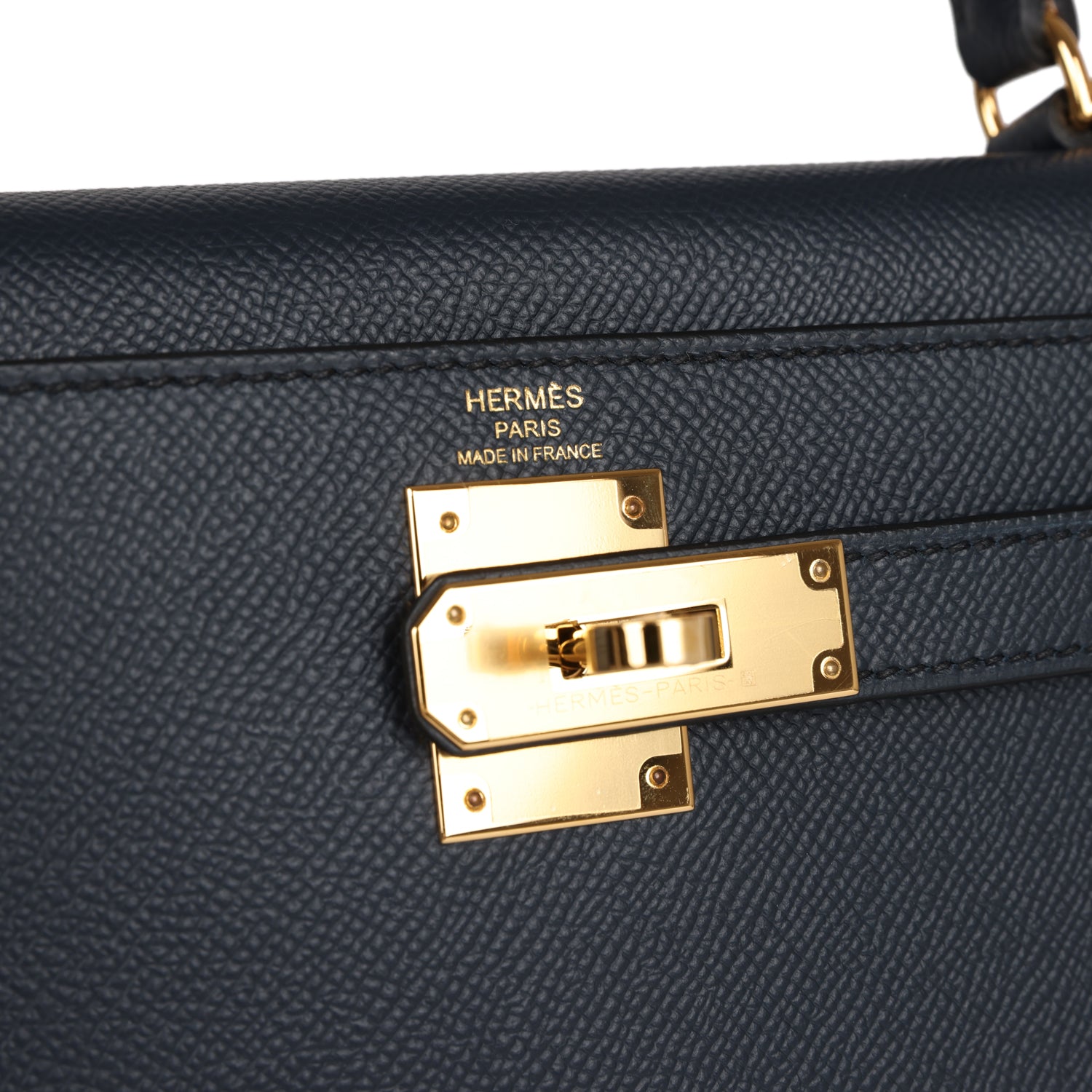 Kelly, in the Sellier style, is in Bleu Indigo epsom leather with gold hardware, has tonal stitching, front flap, two straps with center toggle closure, clochette with lock and two keys, single rolled handle and removable shoulder strap.