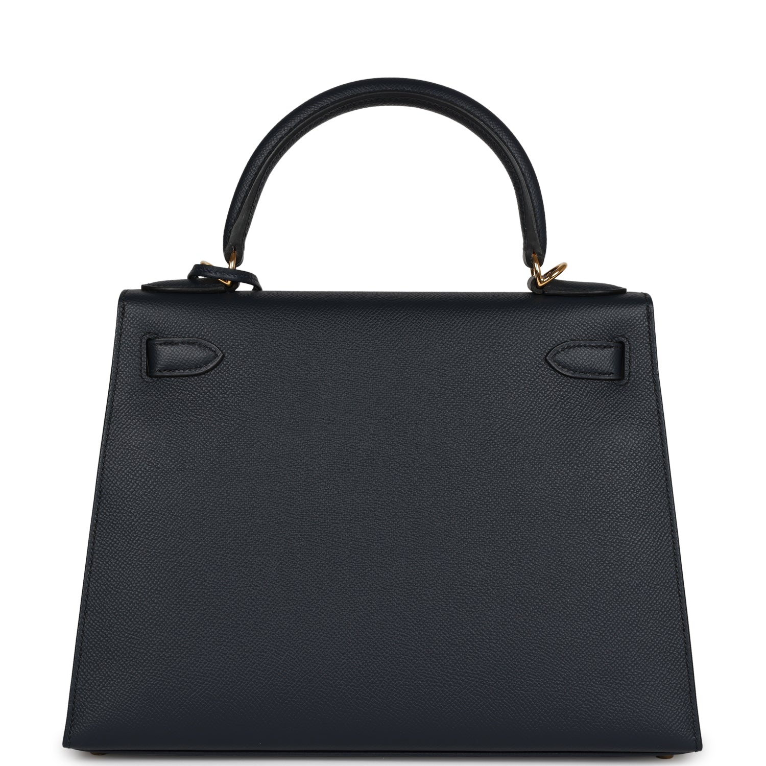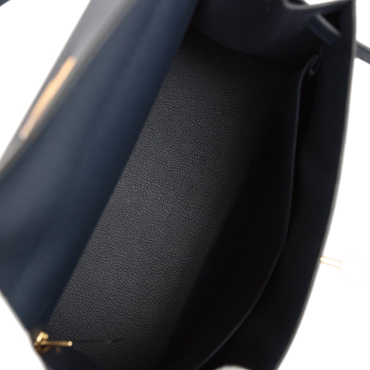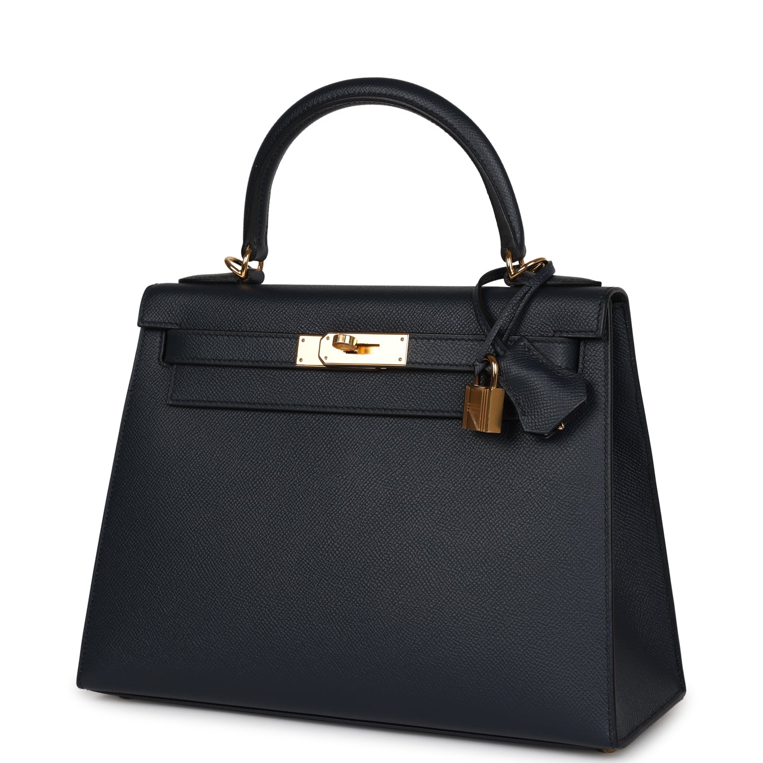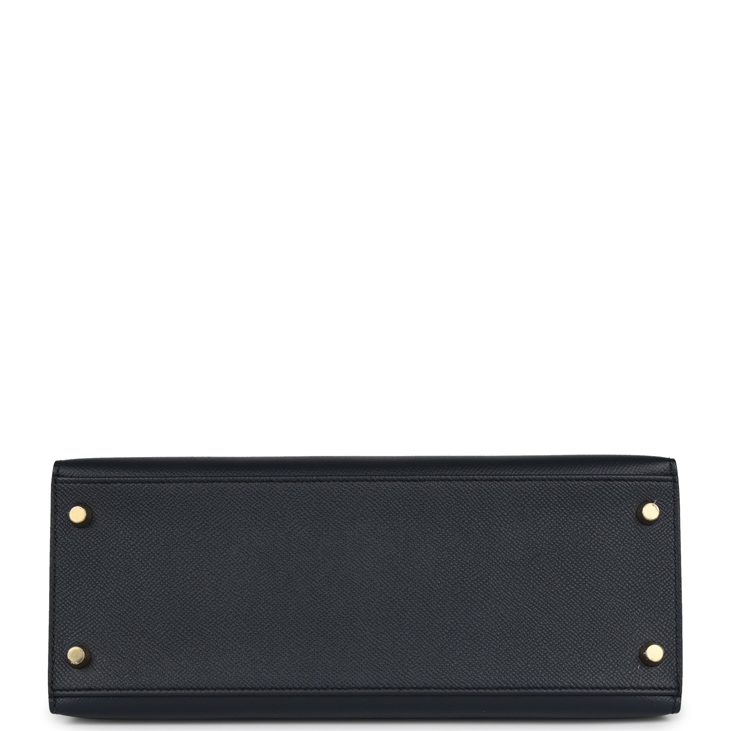 Kelly, in the Sellier style, is in Bleu Indigo epsom leather with gold hardware, has tonal stitching, front flap, two straps with center toggle closure, clochette with lock and two keys, single rolled handle and removable shoulder strap.