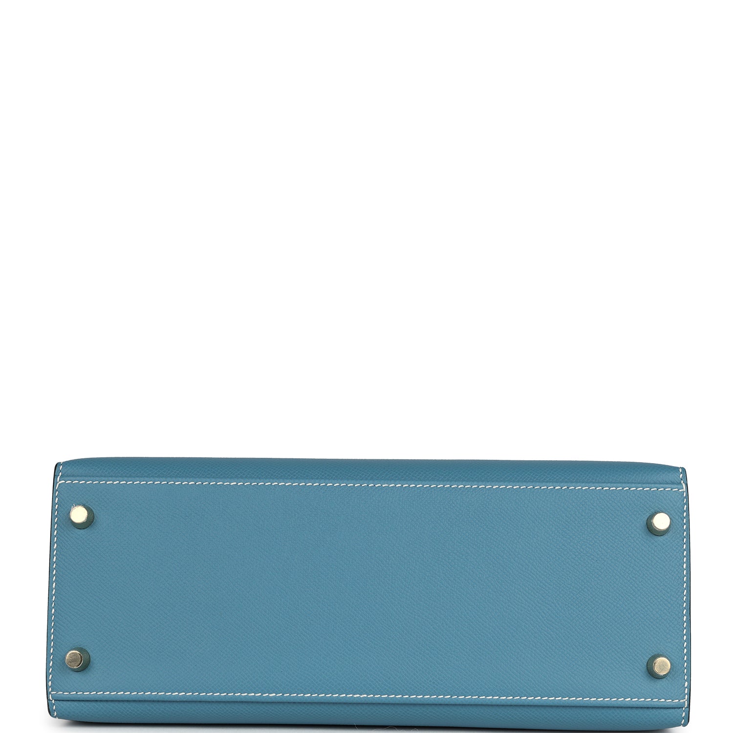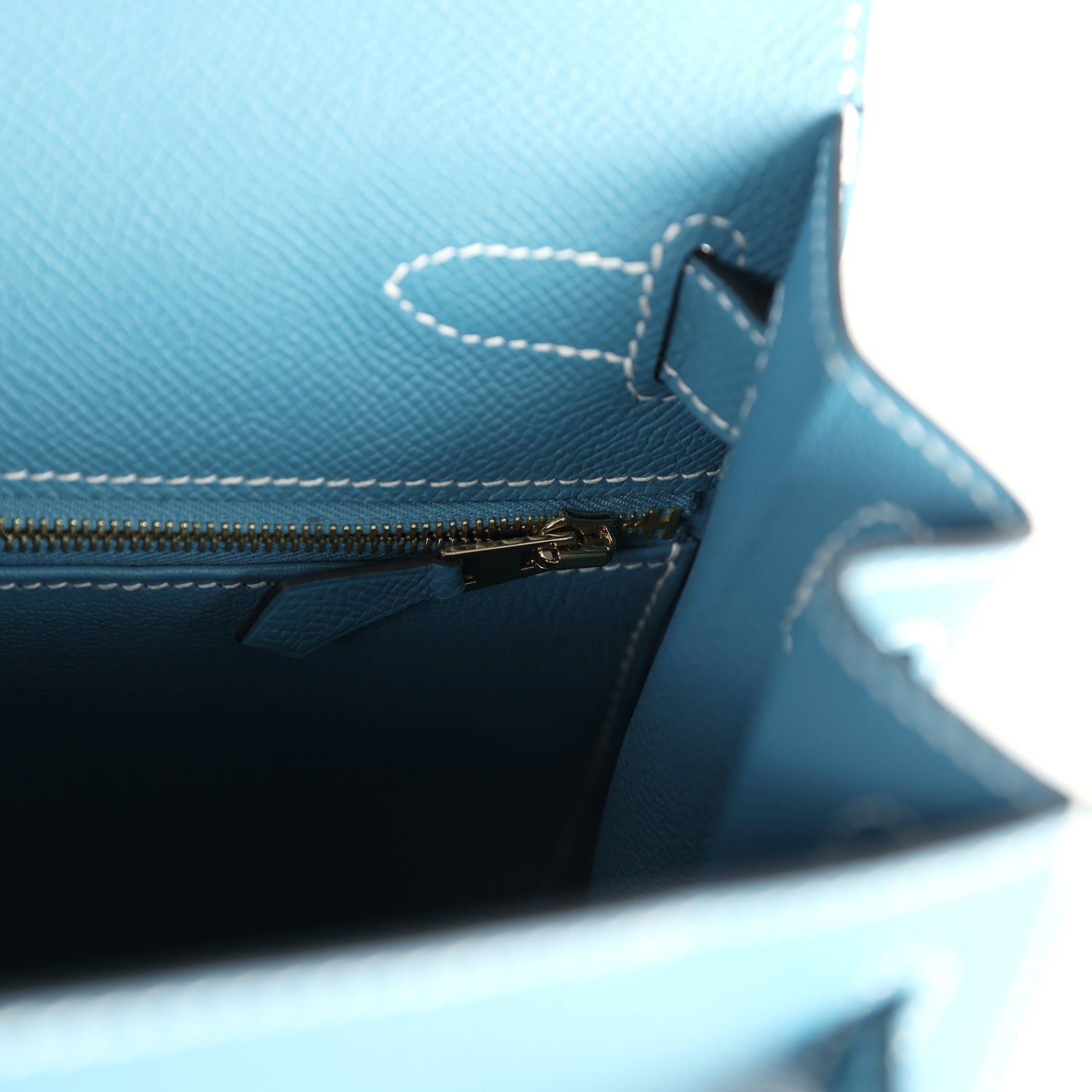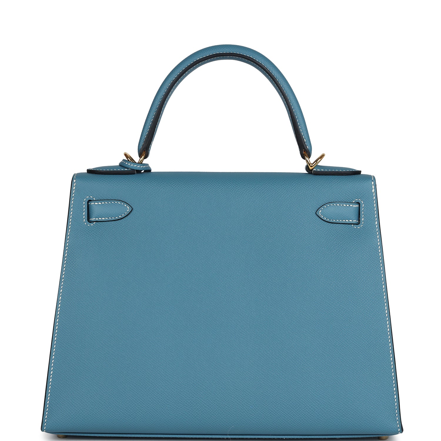 Kelly, in the Sellier style, is in Blue Jean epsom leather with gold hardware, has contrast stitching, front flap, two straps with center toggle closure, clochette with lock and two keys, single rolled handle and removable shoulder strap.