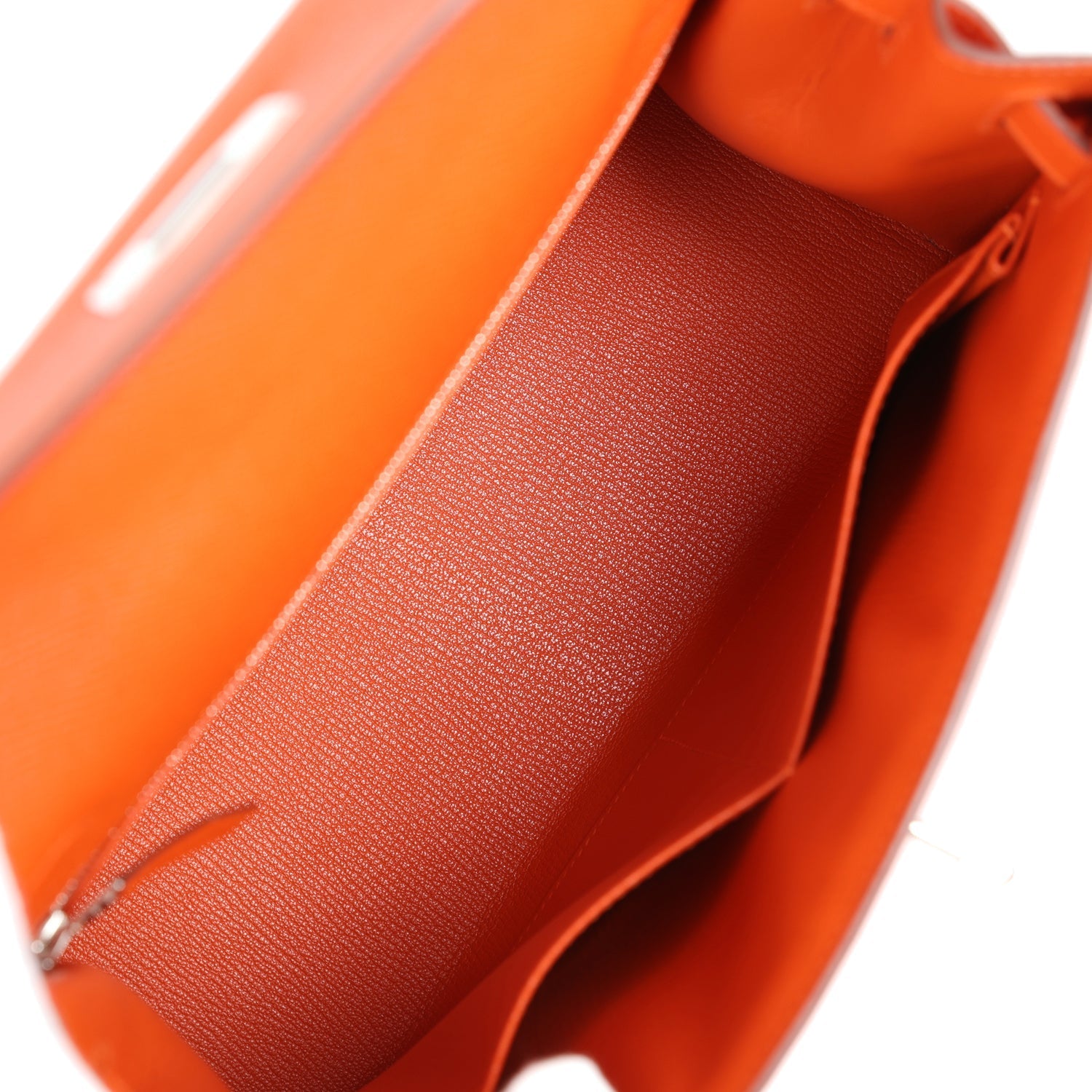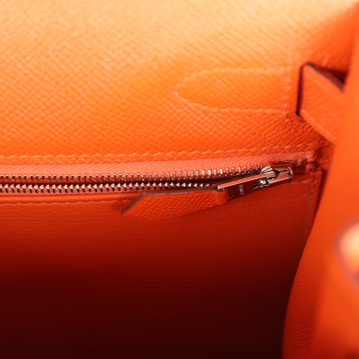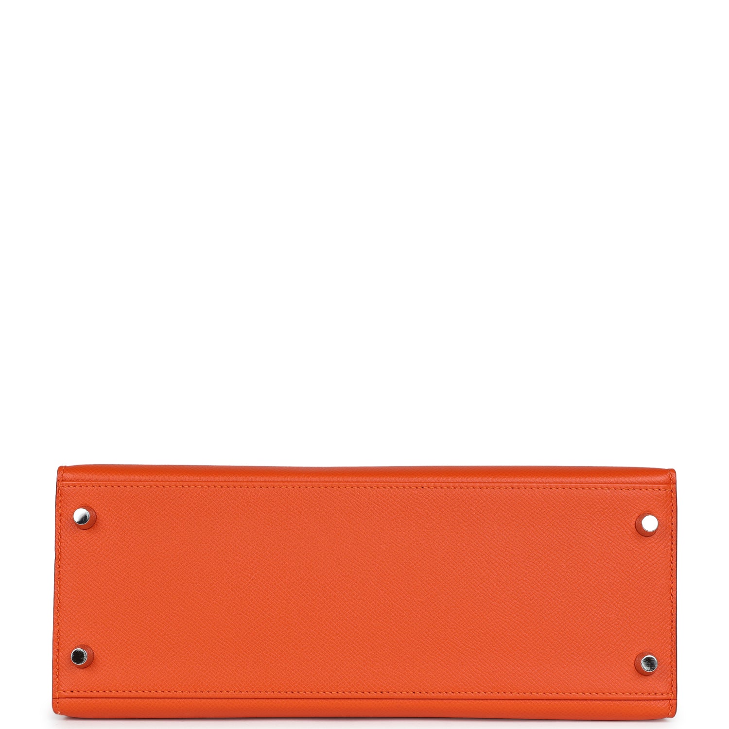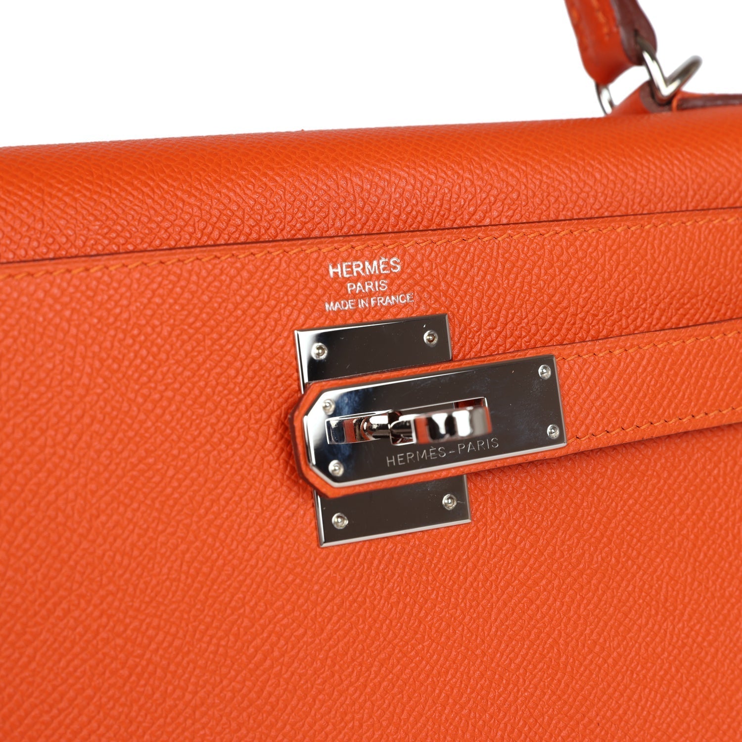 Kelly, in the Sellier style, is of Feu epsom leather with palladium hardware, features tonal stitching, a front toggle closure, a clochette with lock and two keys and a single rolled handle.