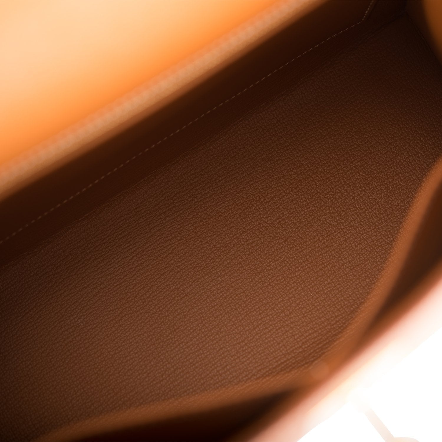 The interior is lined with gold chevre leather and has one zip pocket with an Hermes engraved pull and two open pockets on the opposite side.