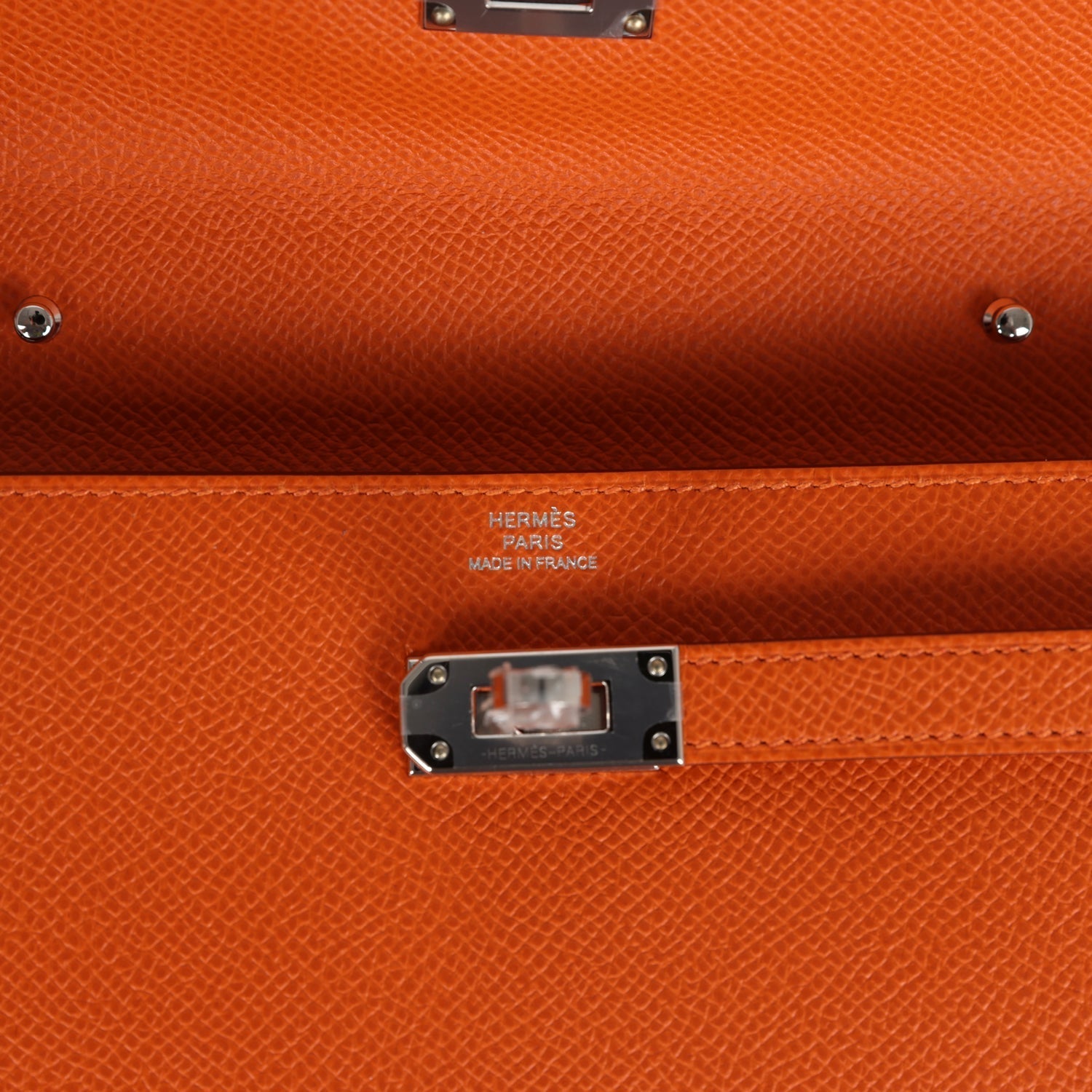 The interior is lined with Orange epsom leather and two main compartments with four credit card slots and a zippered center compartment with Hermes H lock pull.