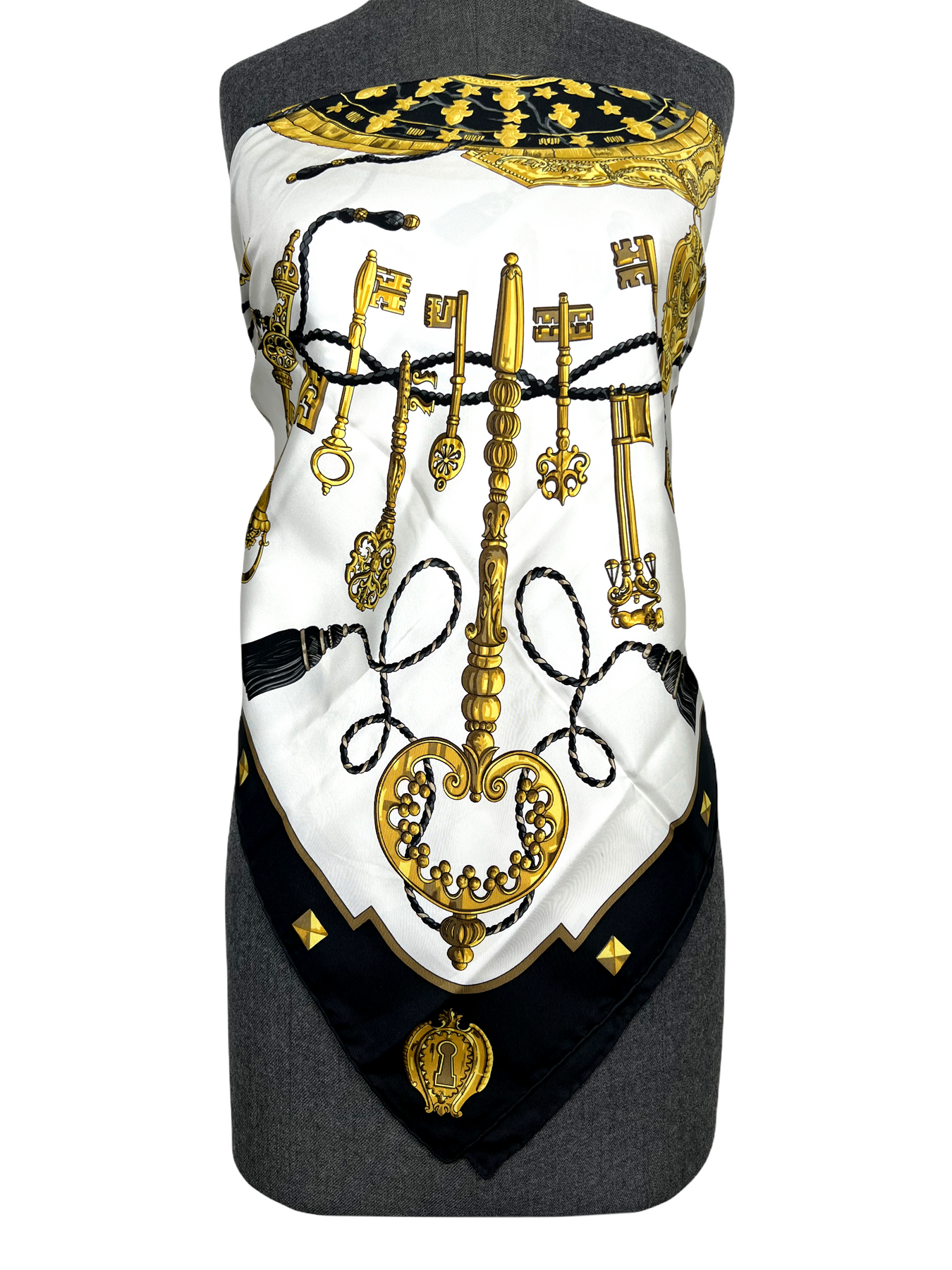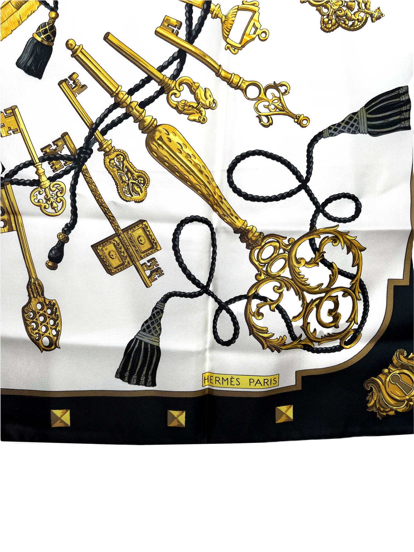 We the ity of this classic Hermes Keys Les Cles Silk Scarf 90 designed by Caty Latham and was first issued in 1965 which translates to "The Keys". This scarf shows a beautiful graphic design of golden keys on a lovely white and black silk background with hand-rolled edges.