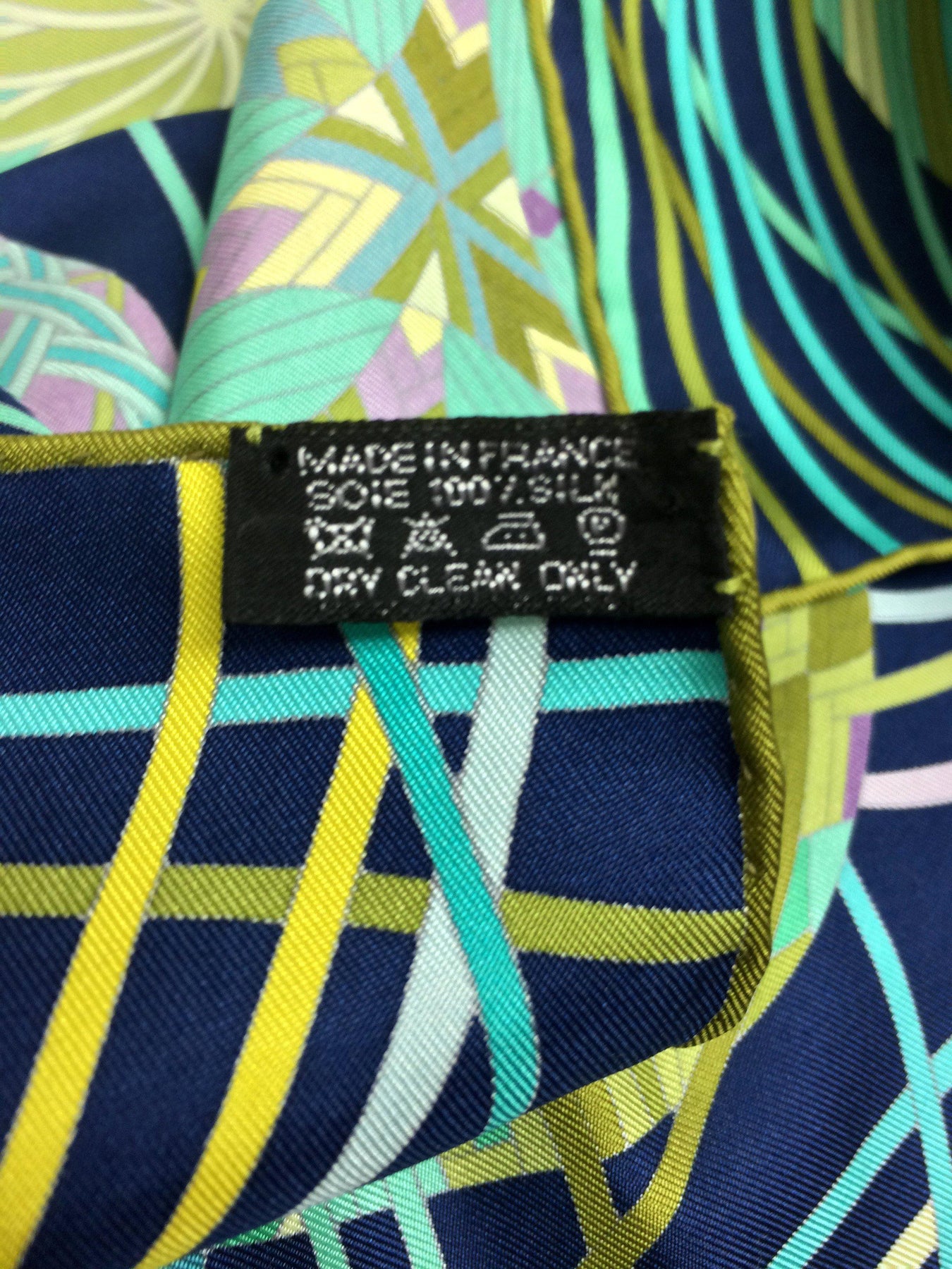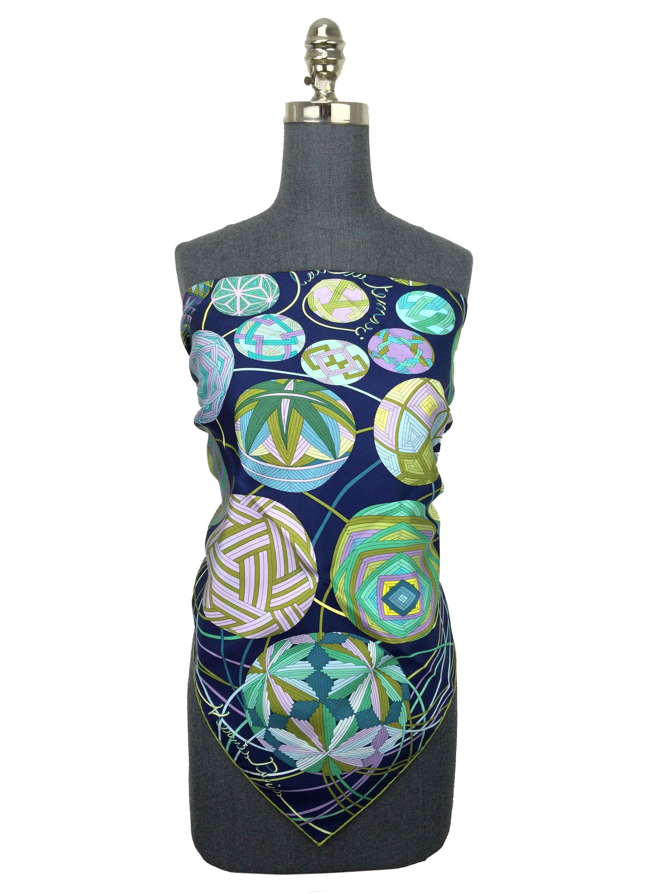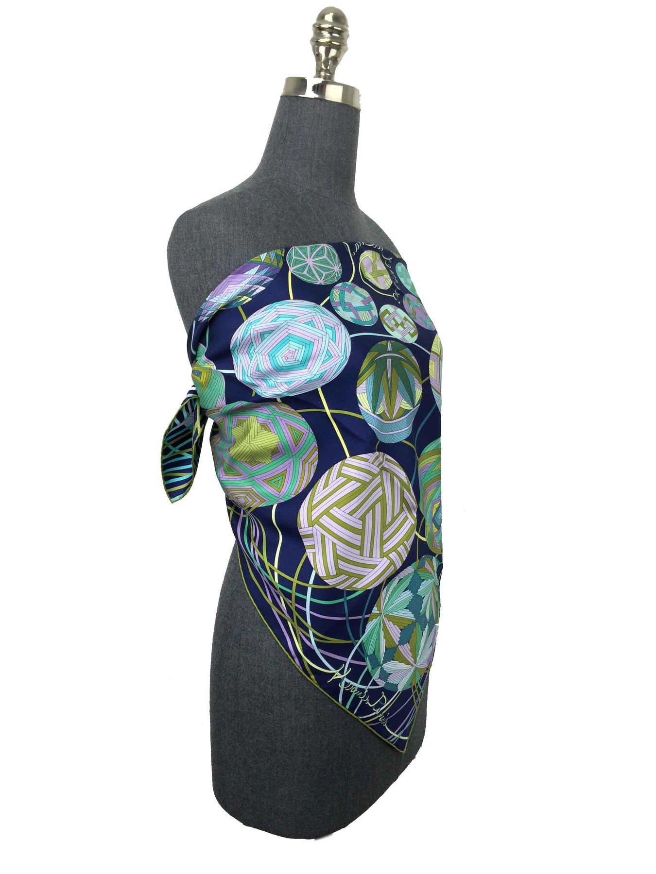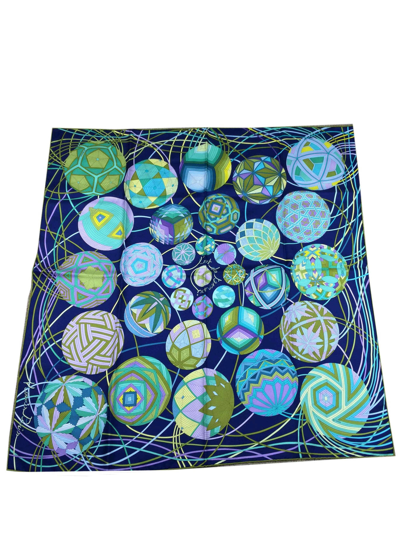 We the ity of this Hermes L'Art Du Temari Silk Scarf 90 by Natalie Vialars featuring the Japanese traditional Art called Temari which depicts stunning handcrafted geometric embroidered balls in hues of blue and purple.