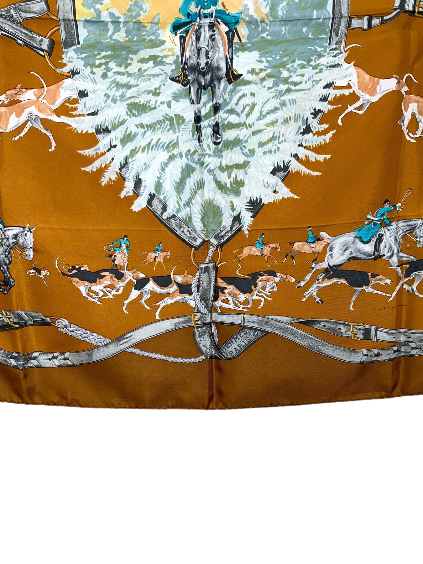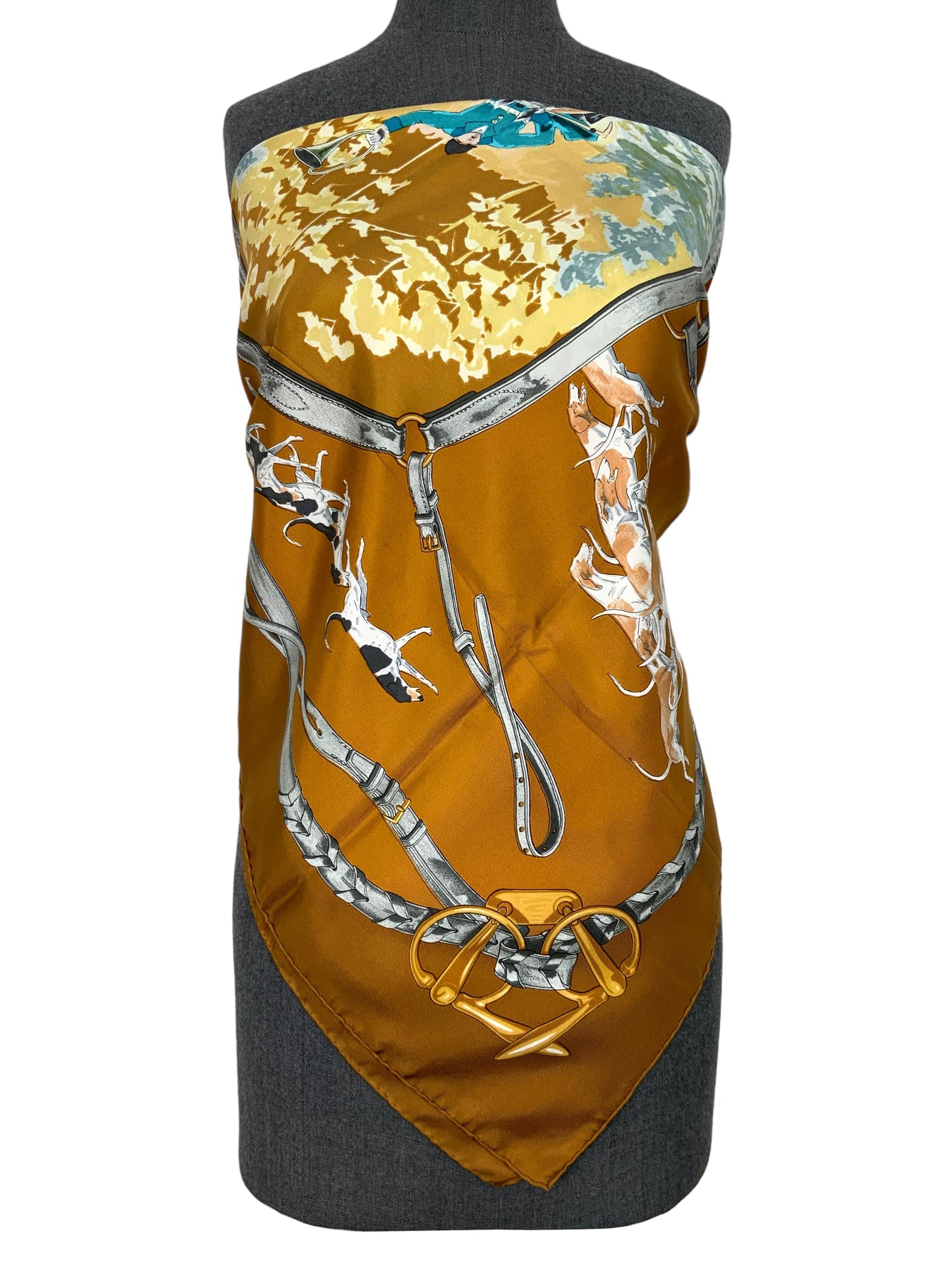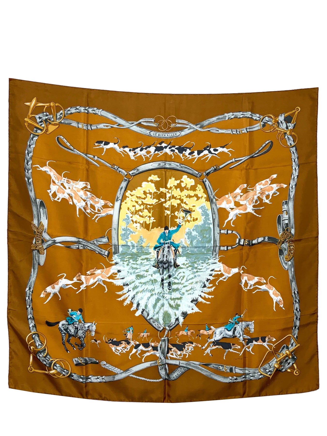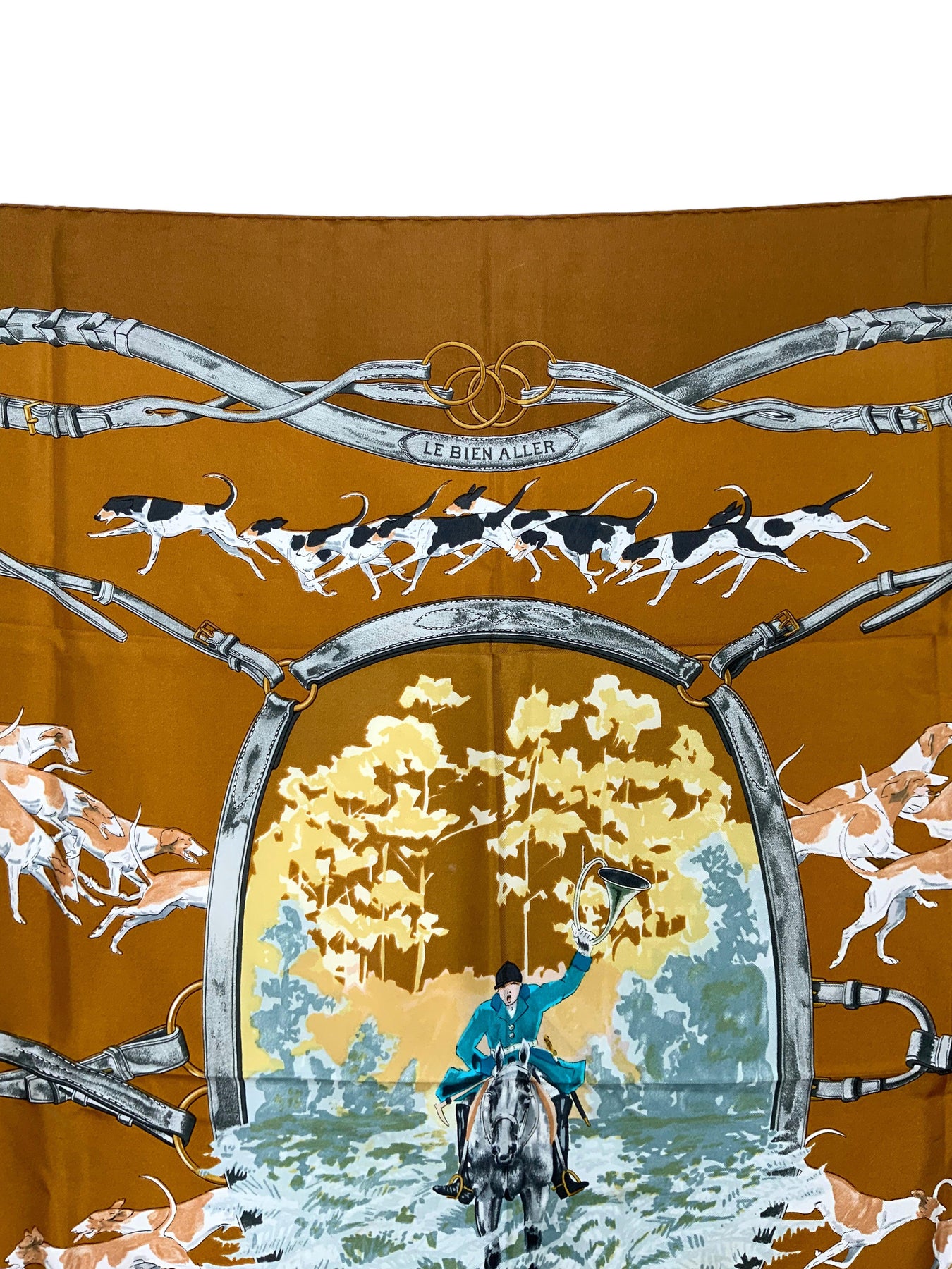 We the ity of this classic HERMES Le Bien Aller Silk Scarf 90 designed by Jean de Fougerolle and was first issued in 1979 which translates to "The Good to Go". This scarf shows a beautiful equestrian graphic design on a lovely brown silk background with hand-rolled edges.