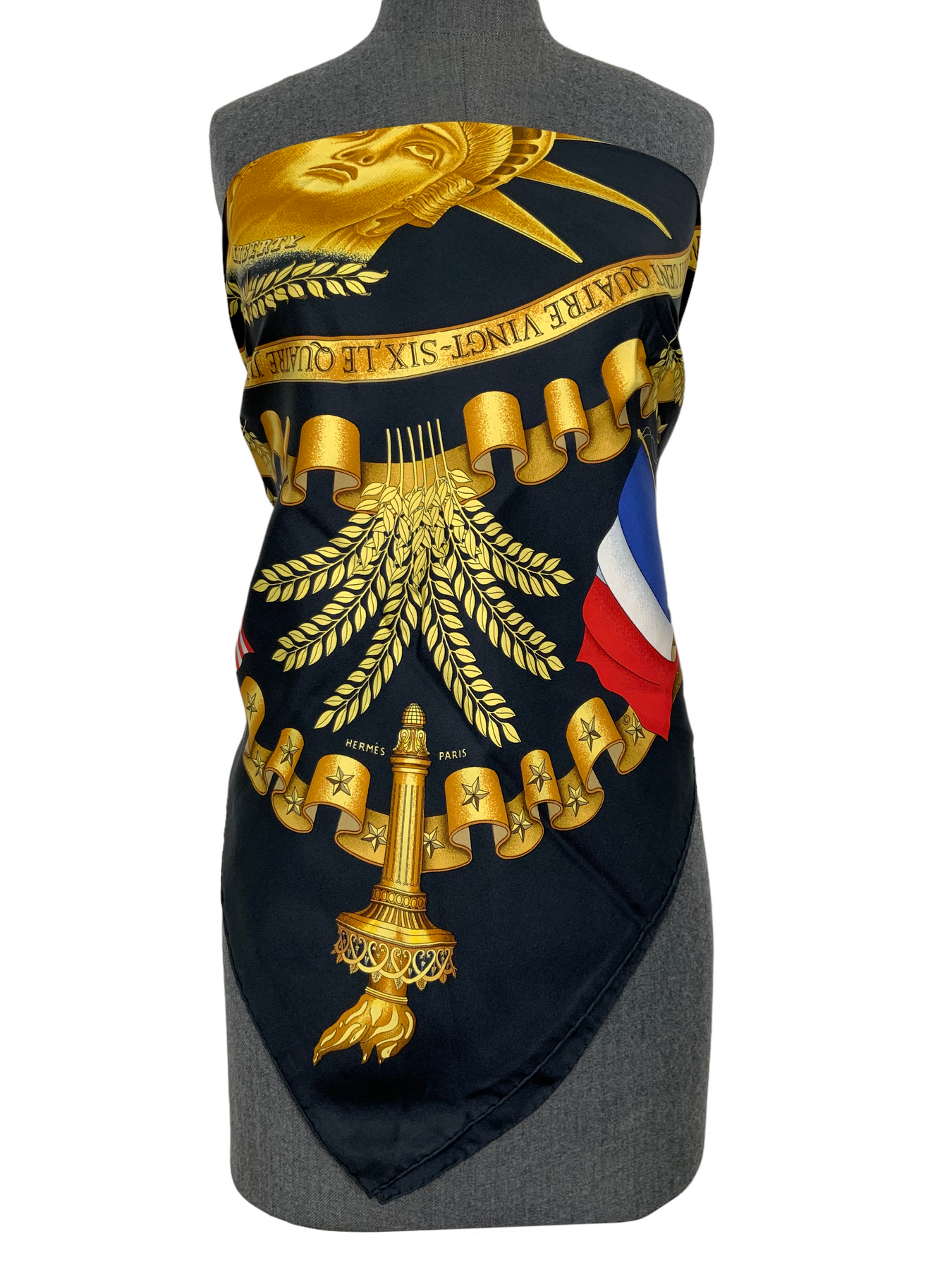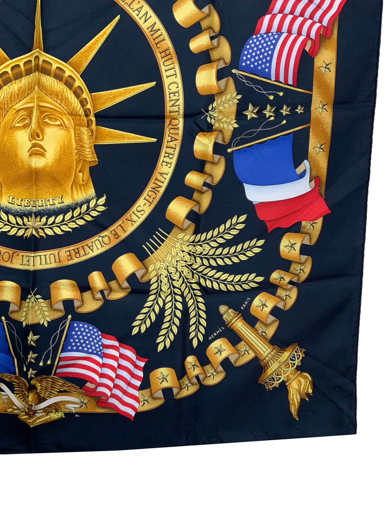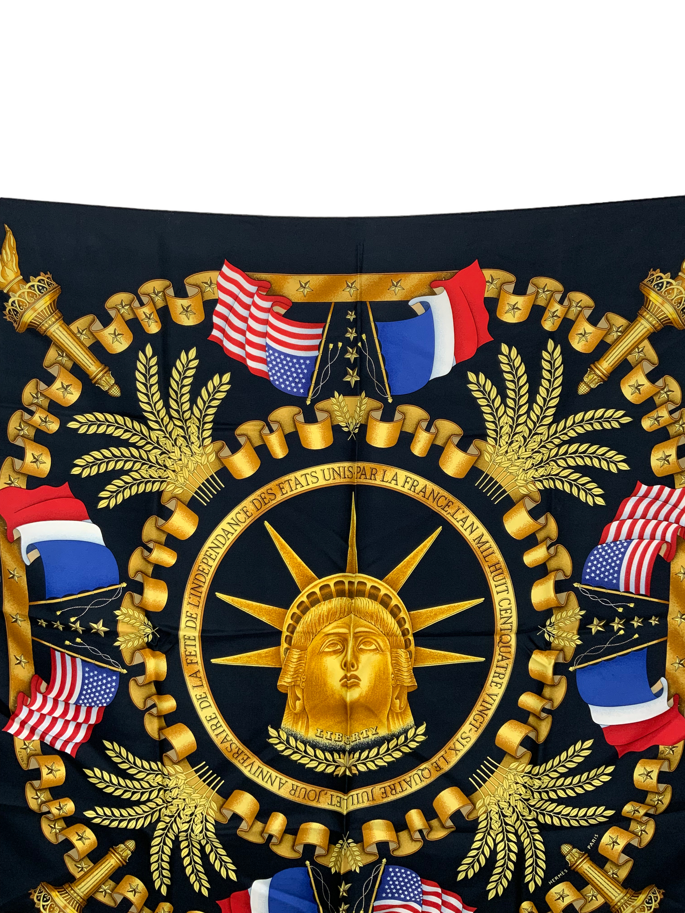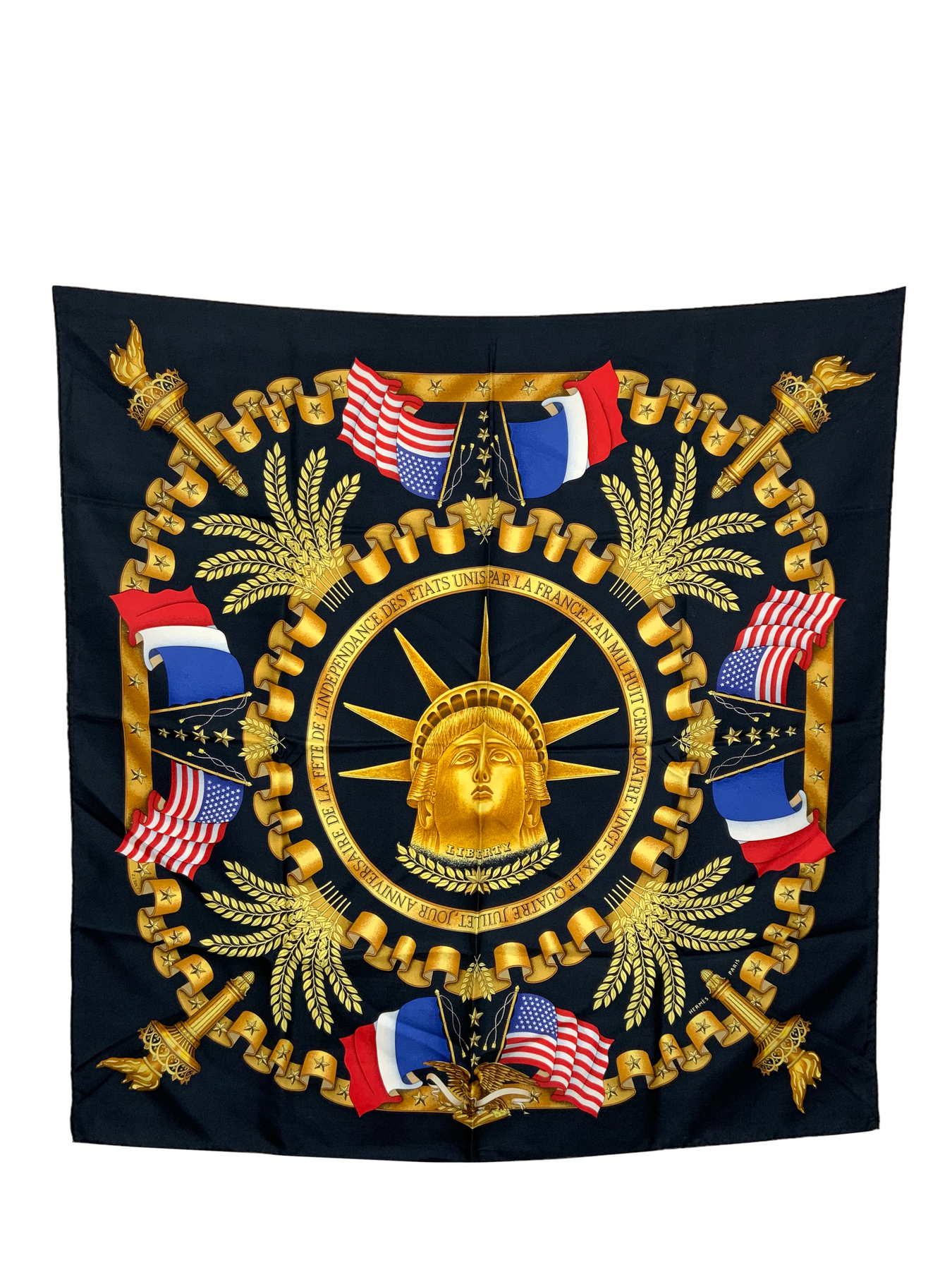 We the ity of this Hermes Liberty Silk Scarf 90 designed by Joachim Metz and issued in 1986. This stunning scarf commemorates the 4th of July Independence Day and features beautiful gold, red, white and blue hues on a solid black silk background.