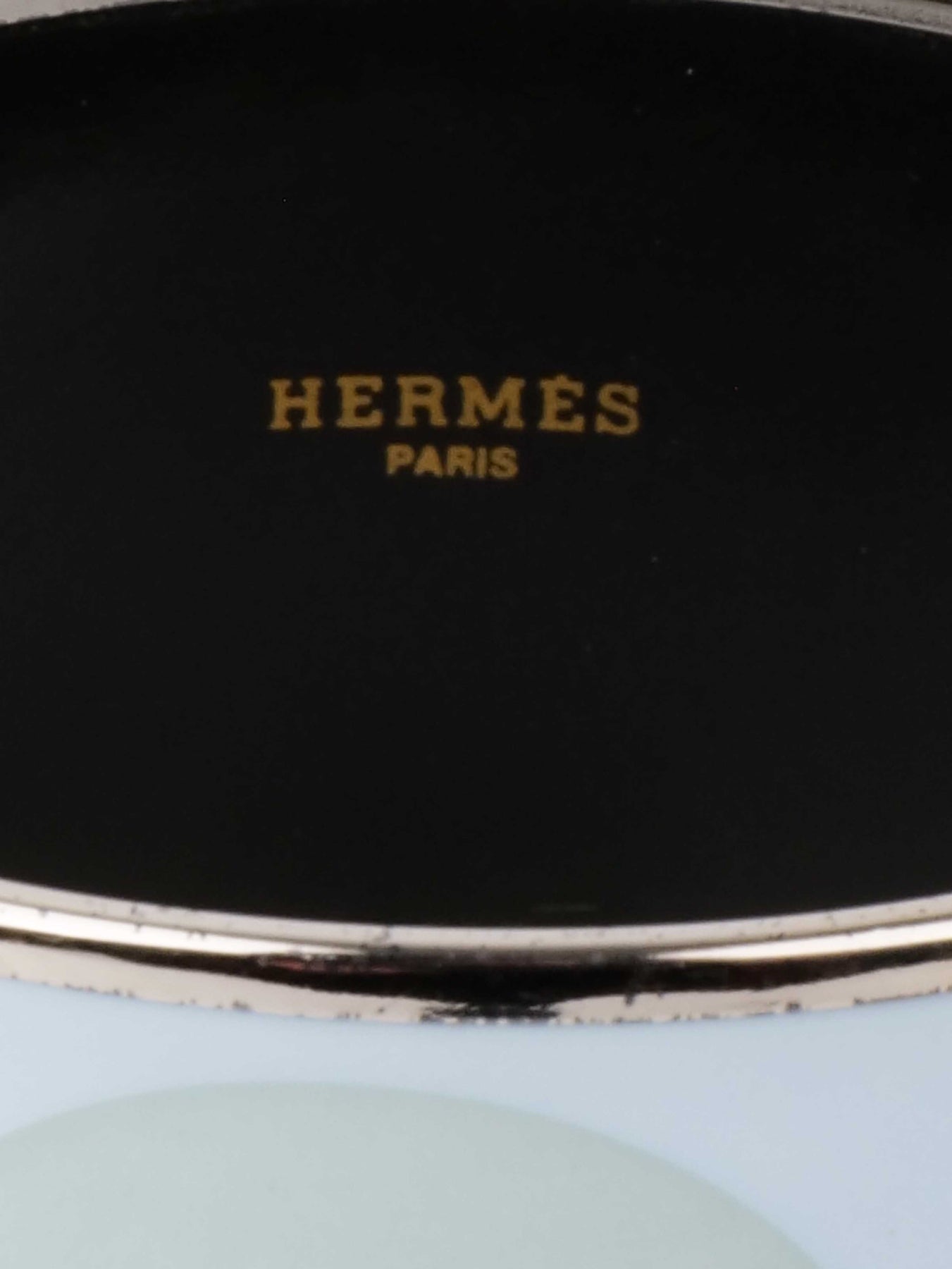 Description : A subtle pop of colour, this Hermes bangle in a gorgeous light blue colour comes in great condition with mild signs of wear and tarnishing on the silver portions.