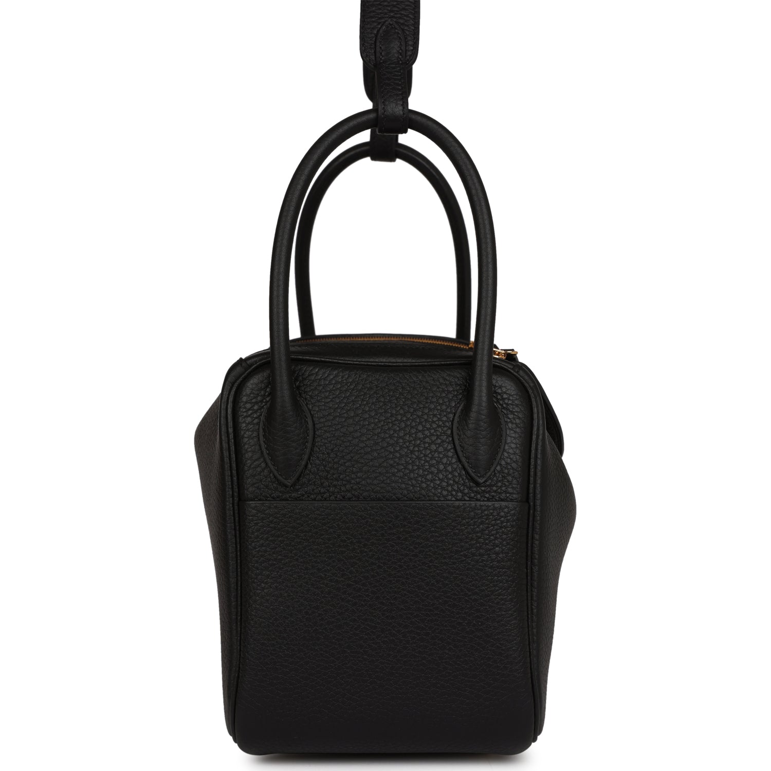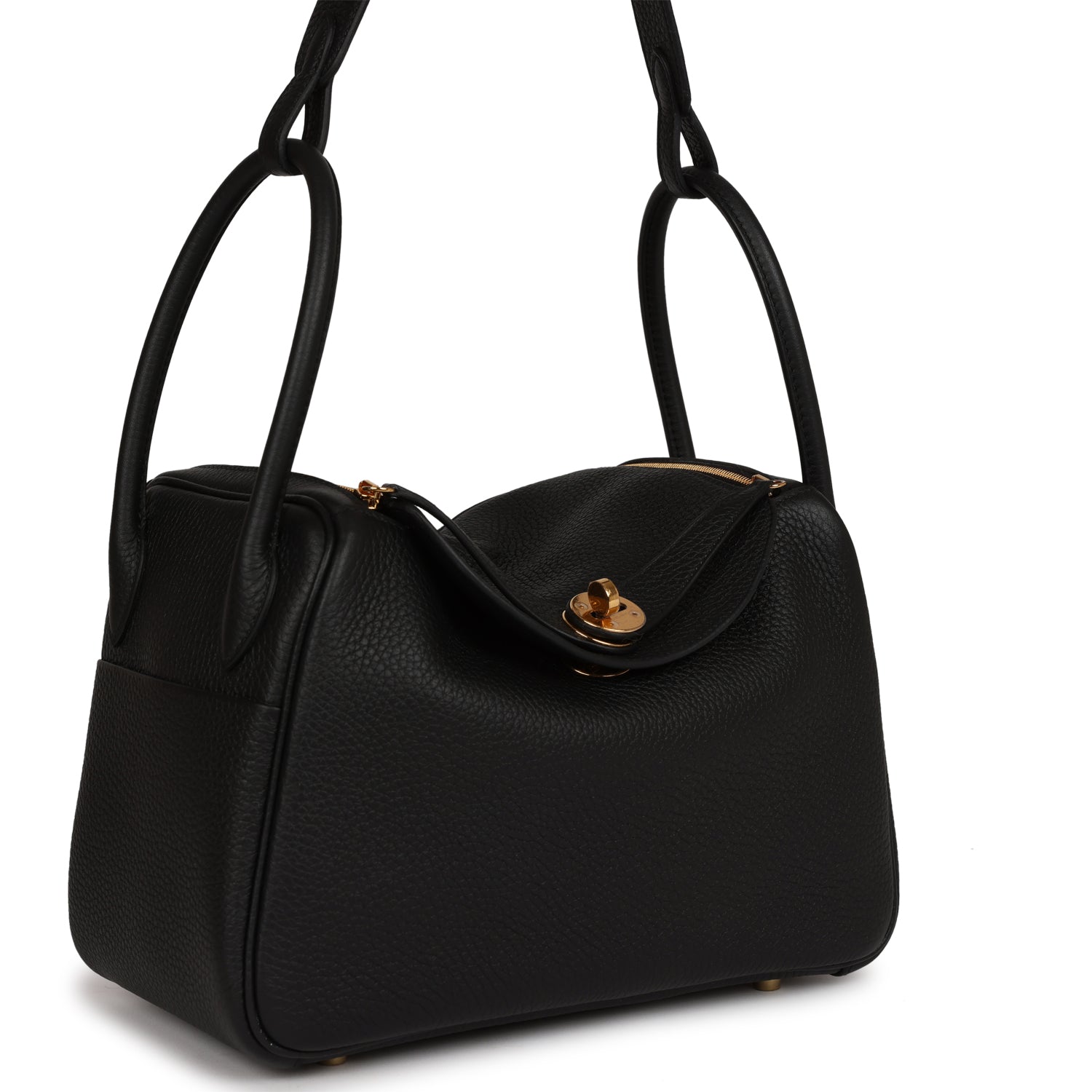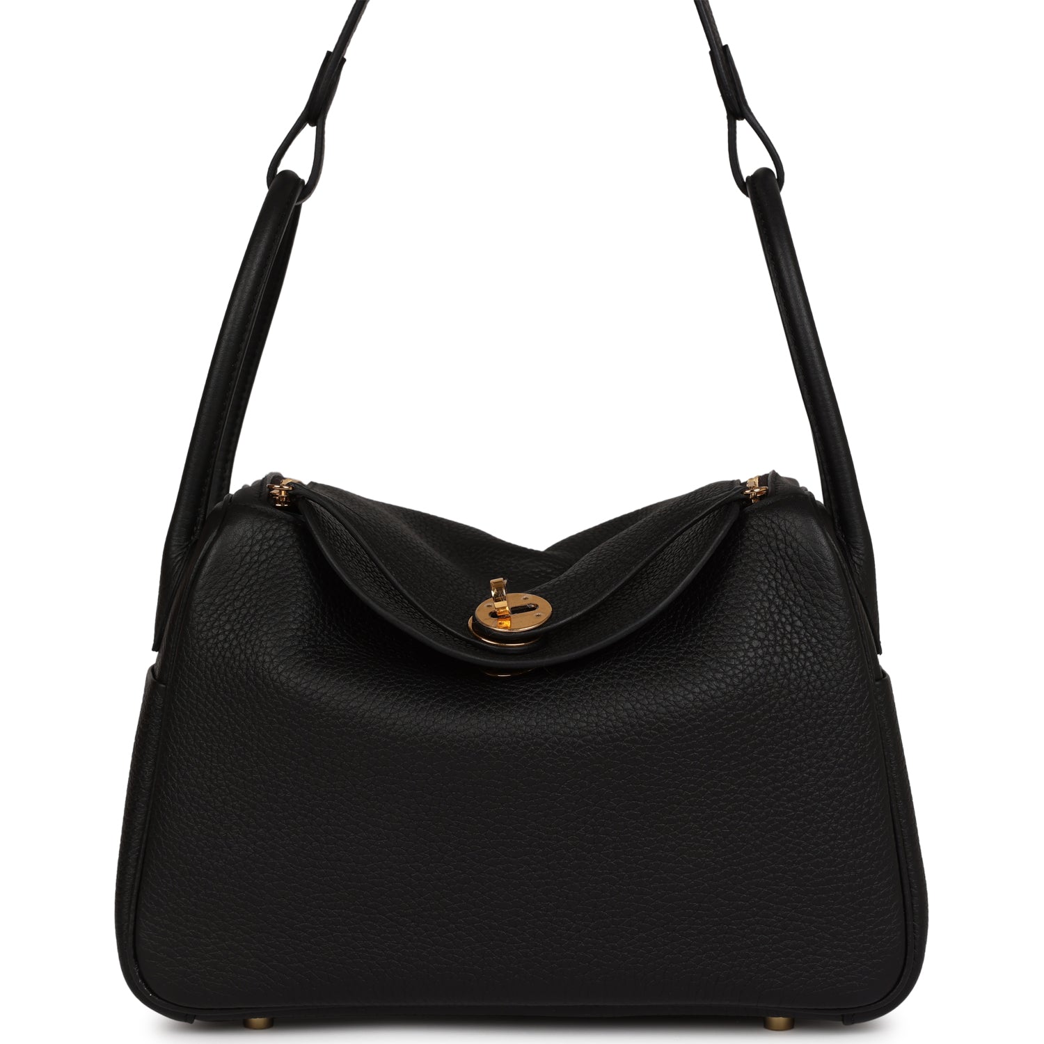 This Lindy is in Black clemence with gold hardware and features tonal stitching, double zipper pulls, center Hermes twist lock closure, five gold feet, and two top handles that are linked by a removable shoulder strap.