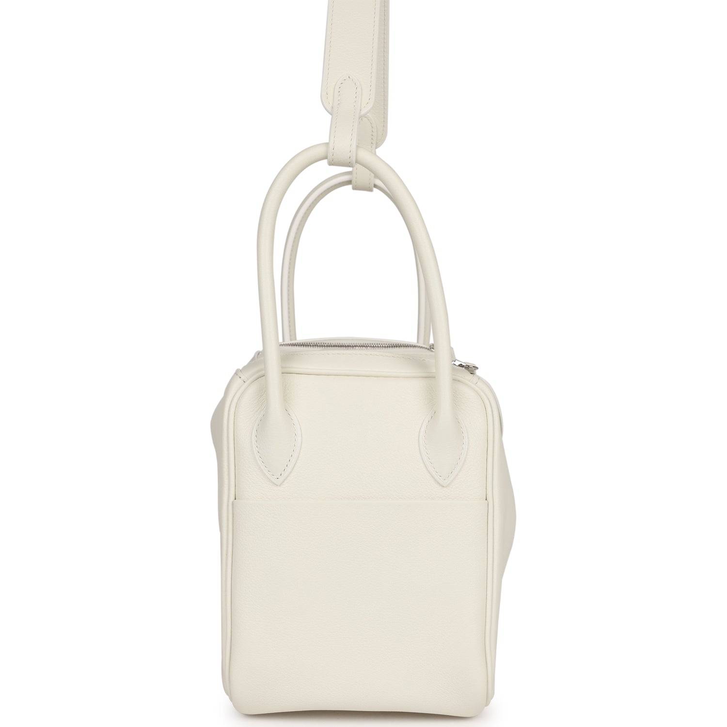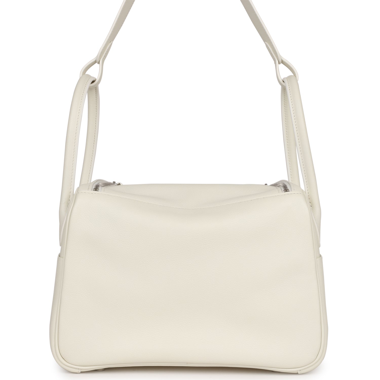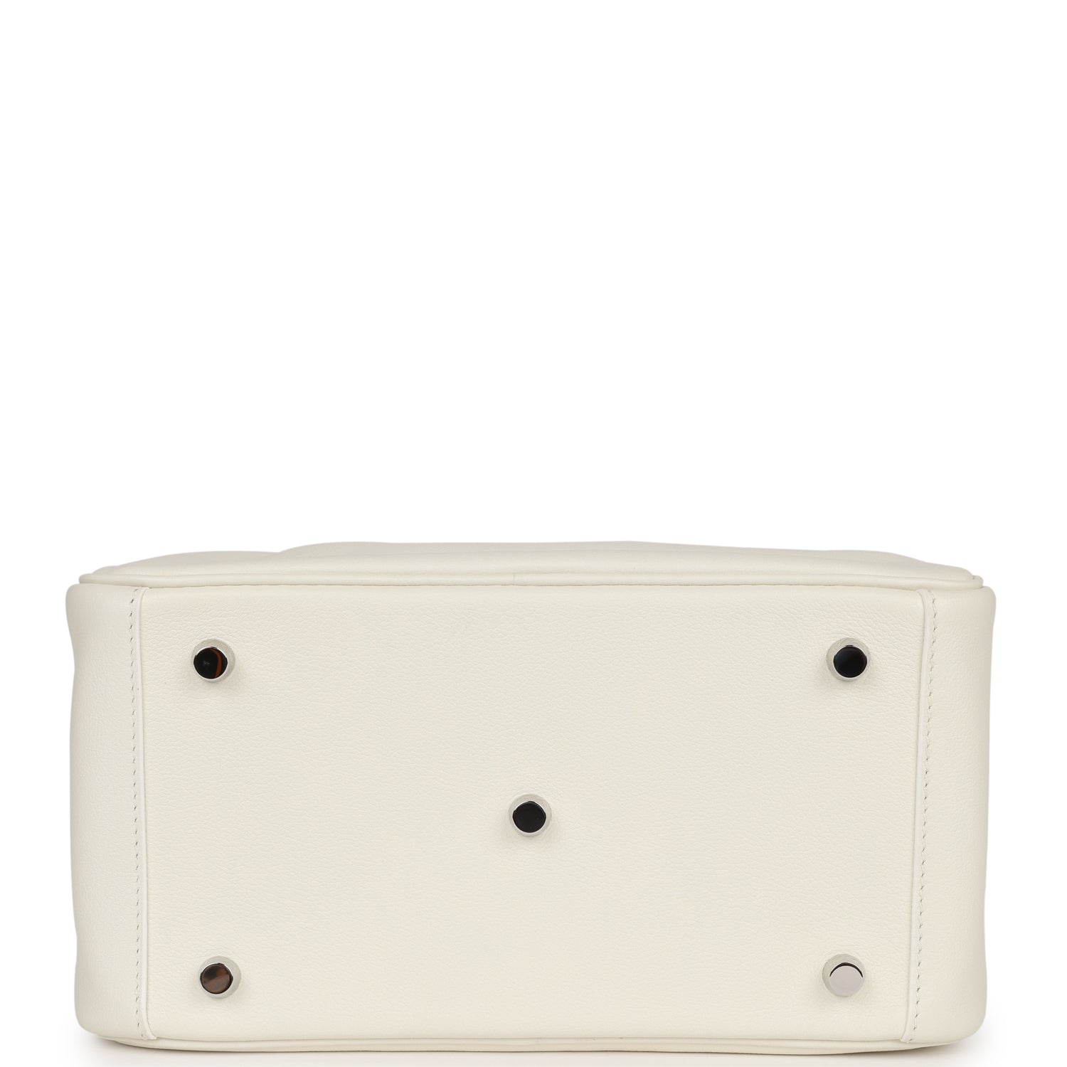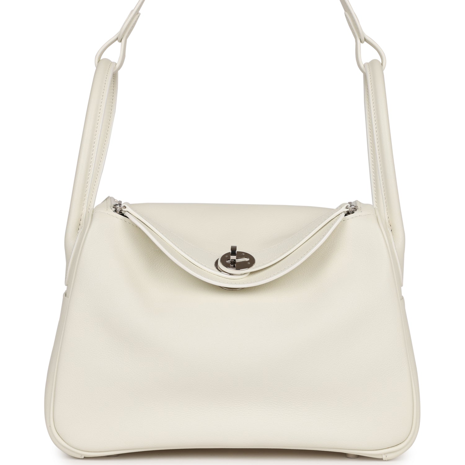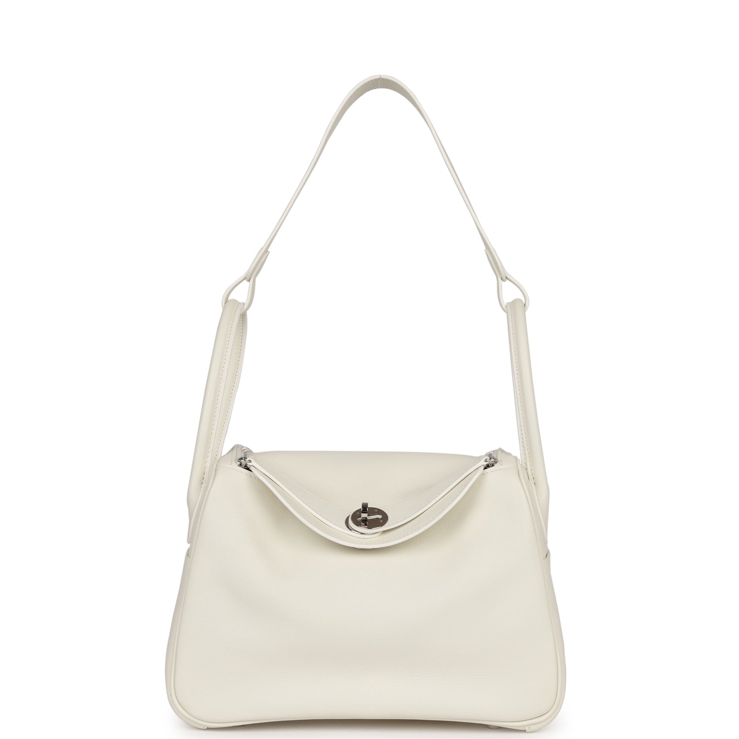 This Lindy is of White evercolor with palladium hardware and features tonal stitching, double zipper pulls, center Hermes twist lock closure, five gold feet, and two top handles that are linked by a removable shoulder strap.