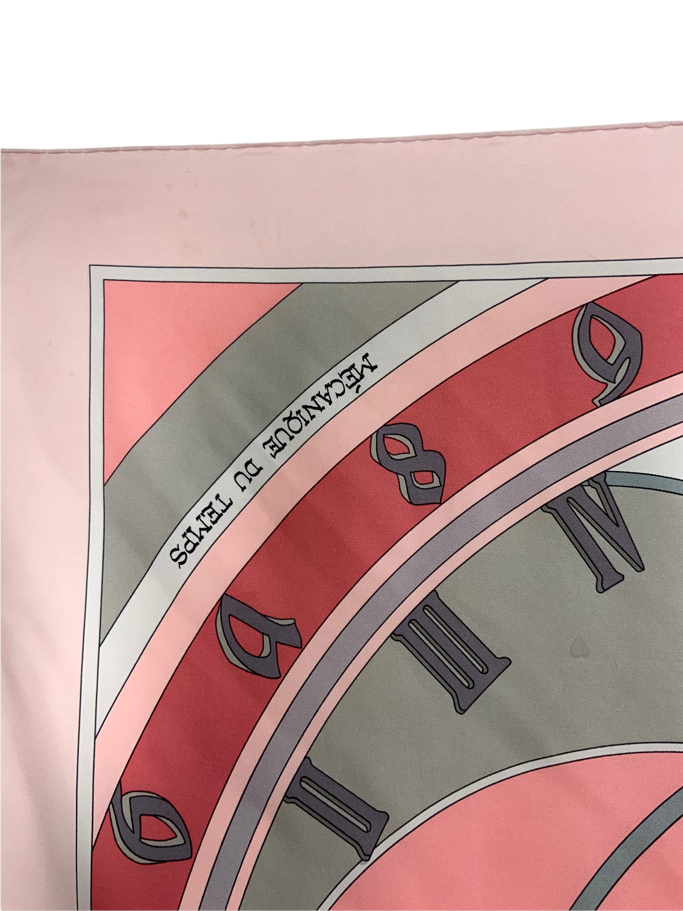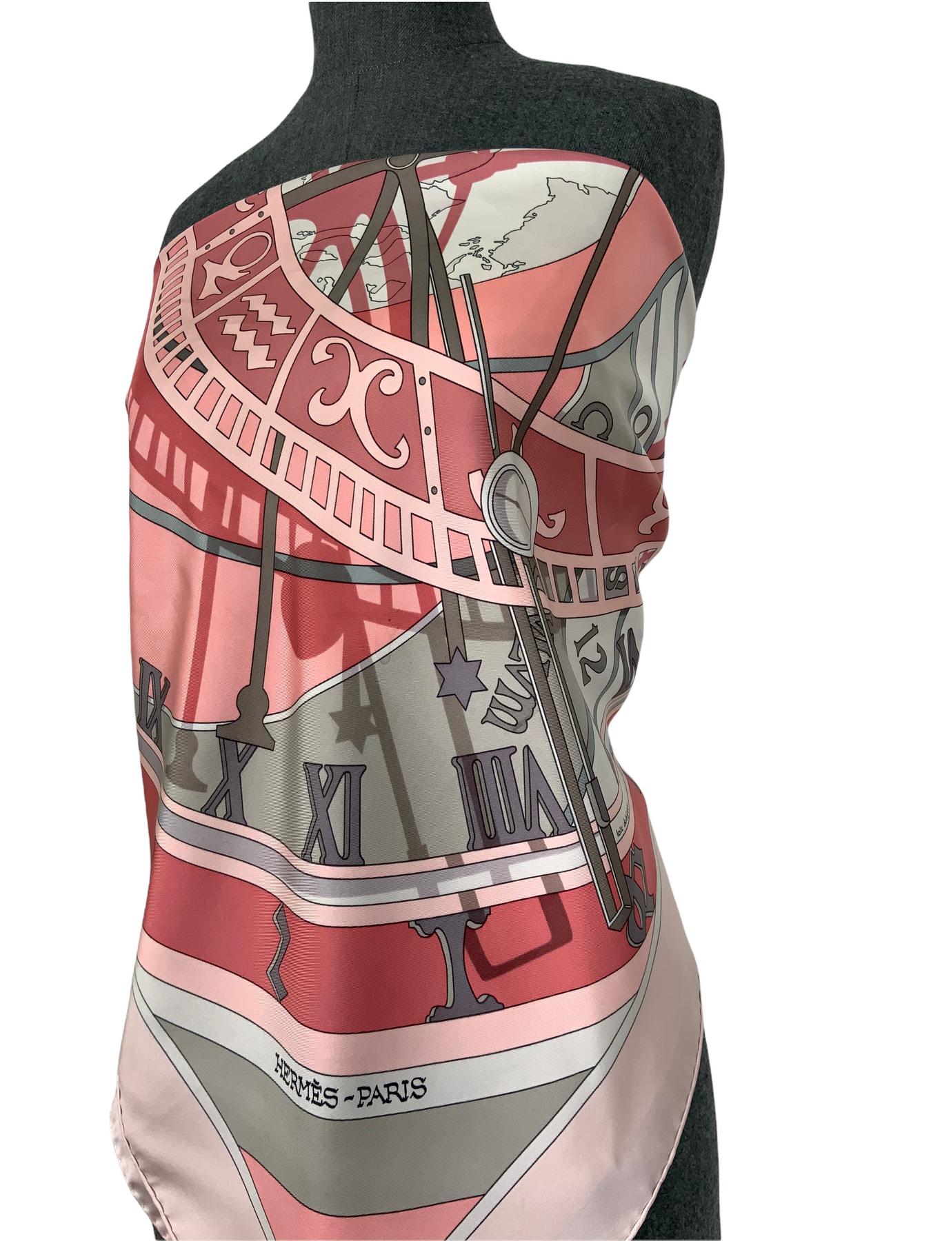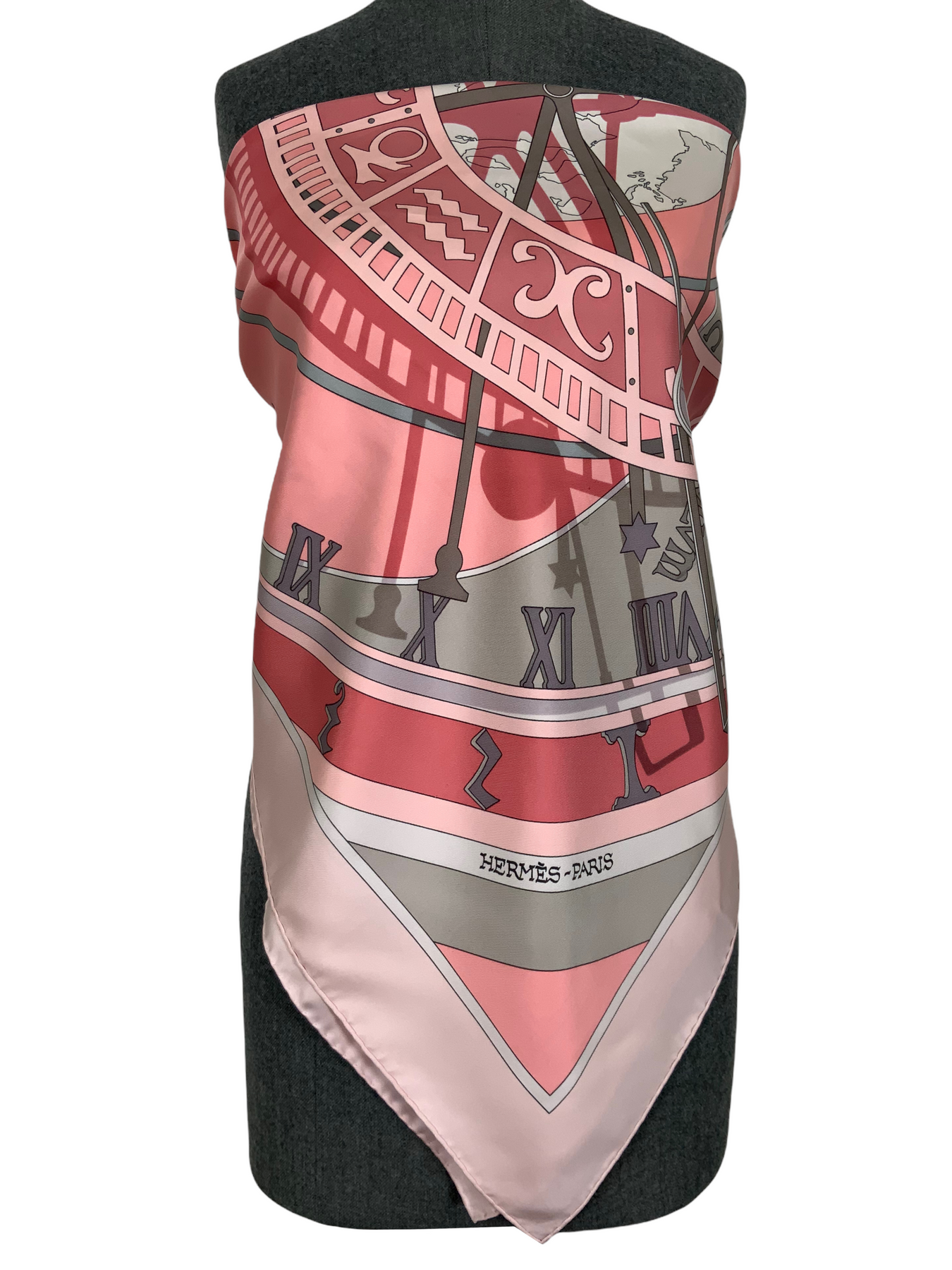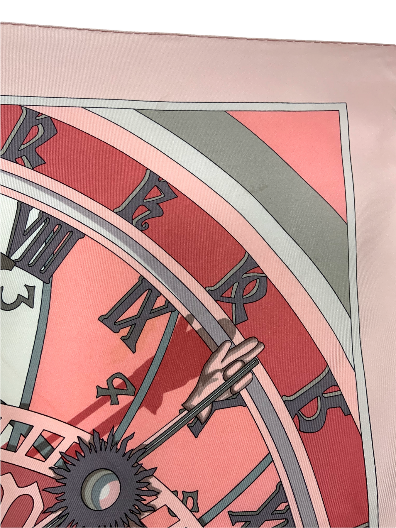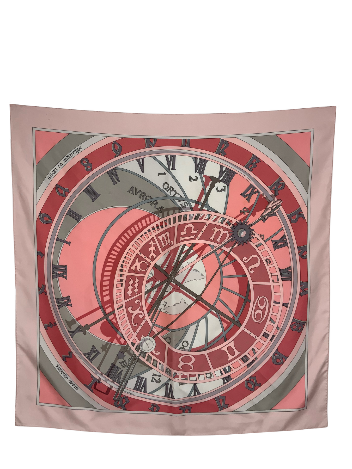 We the ity of this Hermes Mecanique Du Temps Silk Scarf 90 designed by Loïc Dubigeon and first issued in 2002. This stunning scarf translates to 'The Mechanics of Time" and features beautiful hues of coral and pink, depicting Prague's Astronomical Clock in the Old Town.
