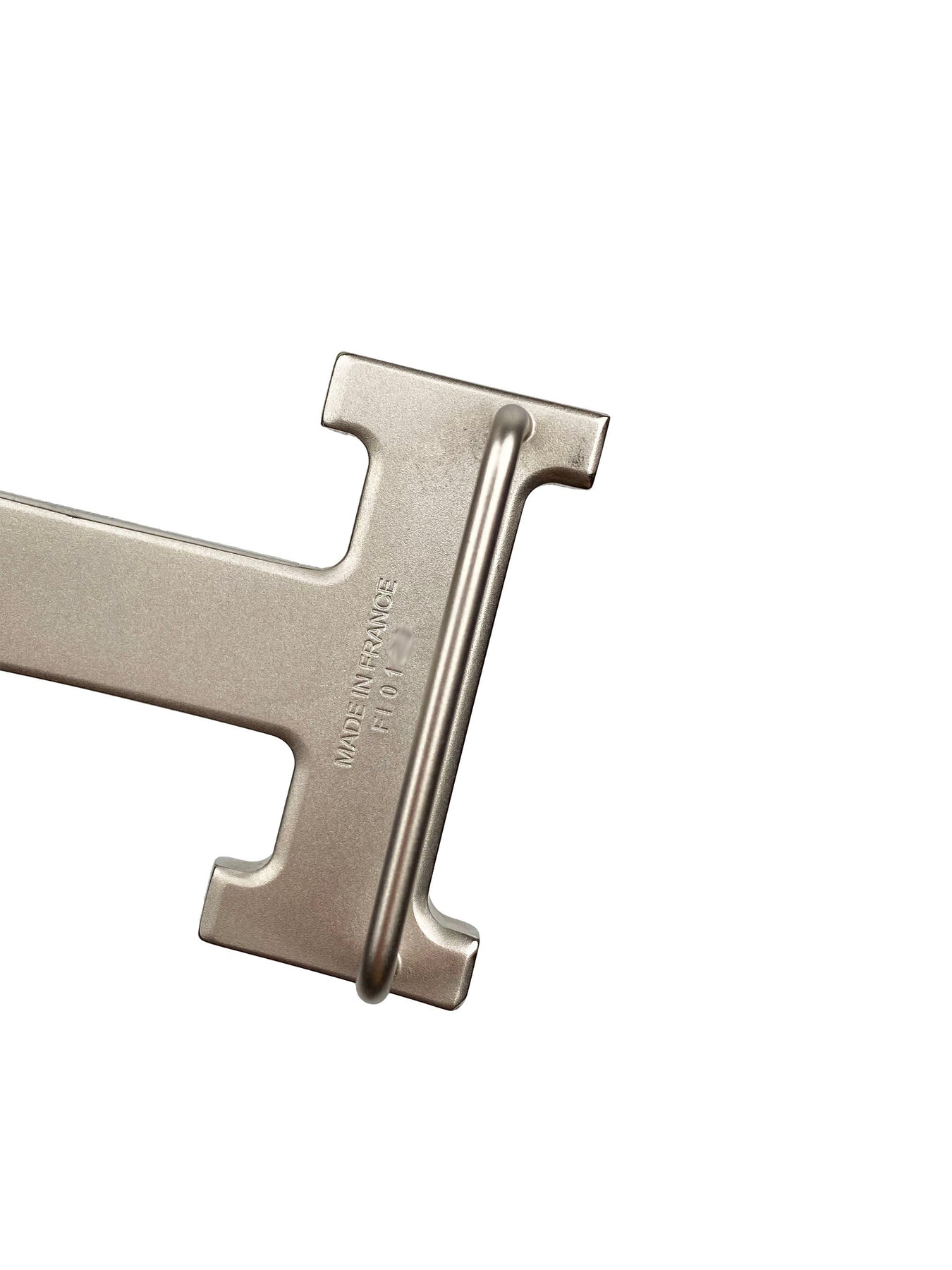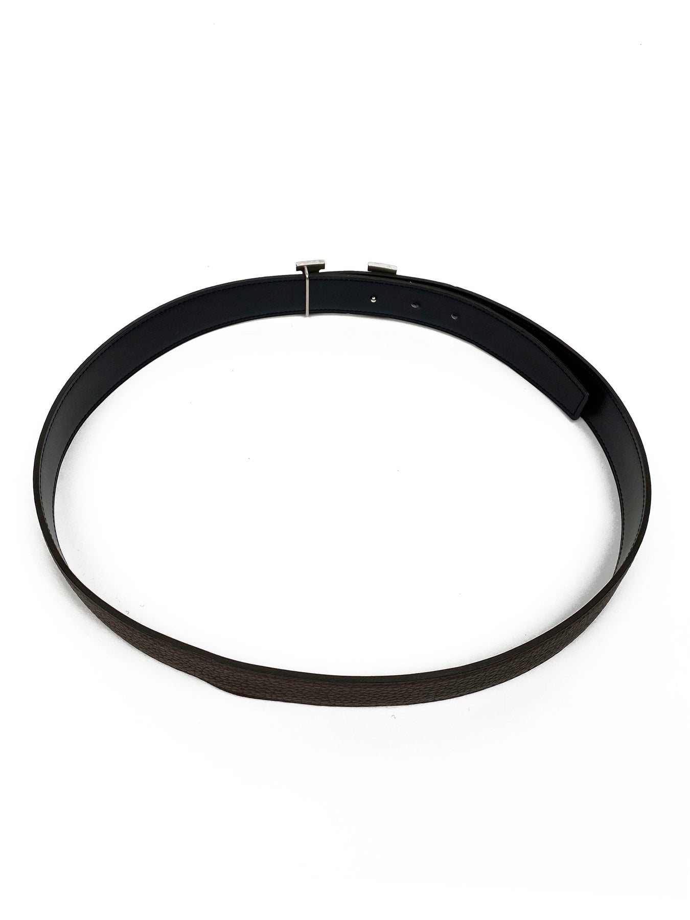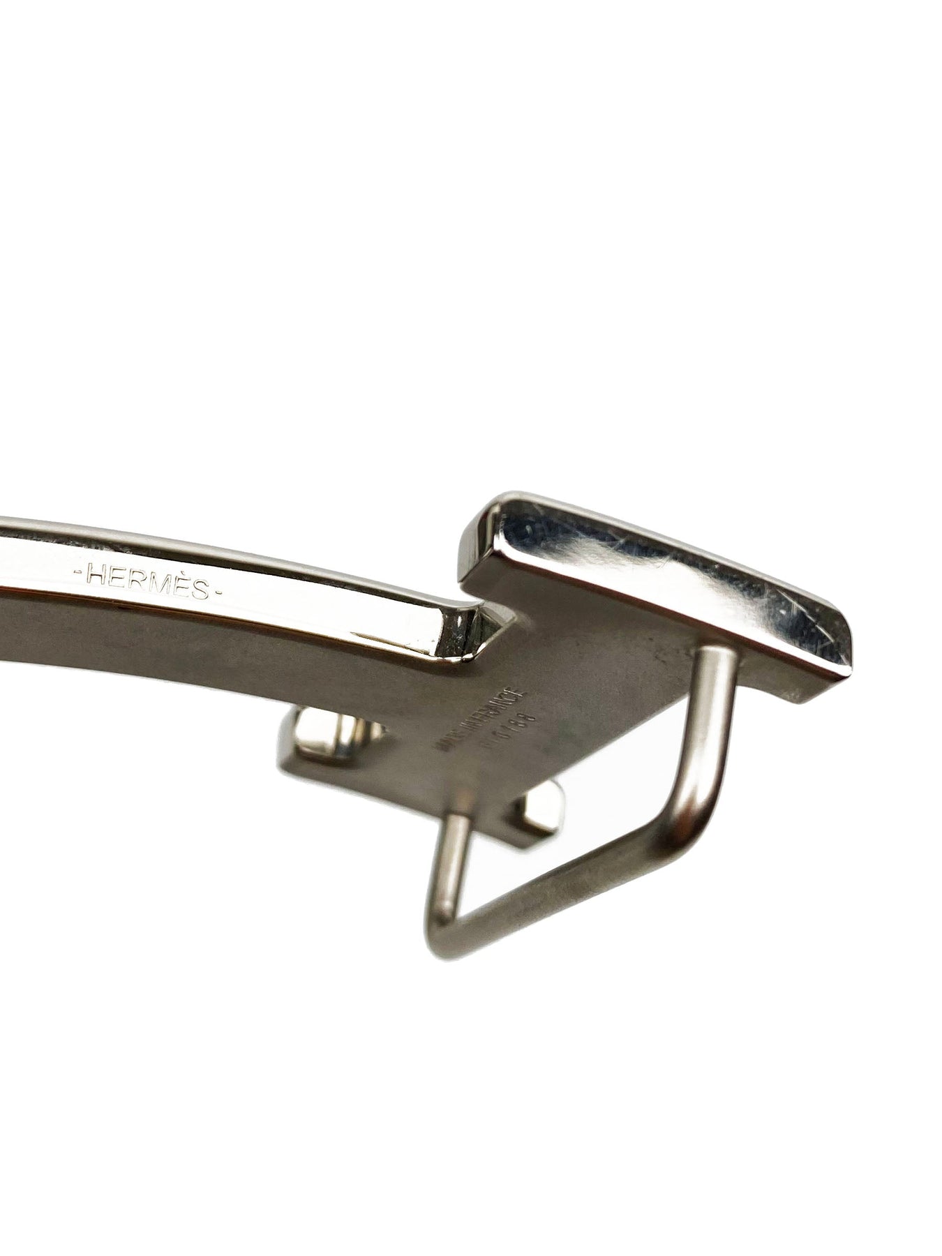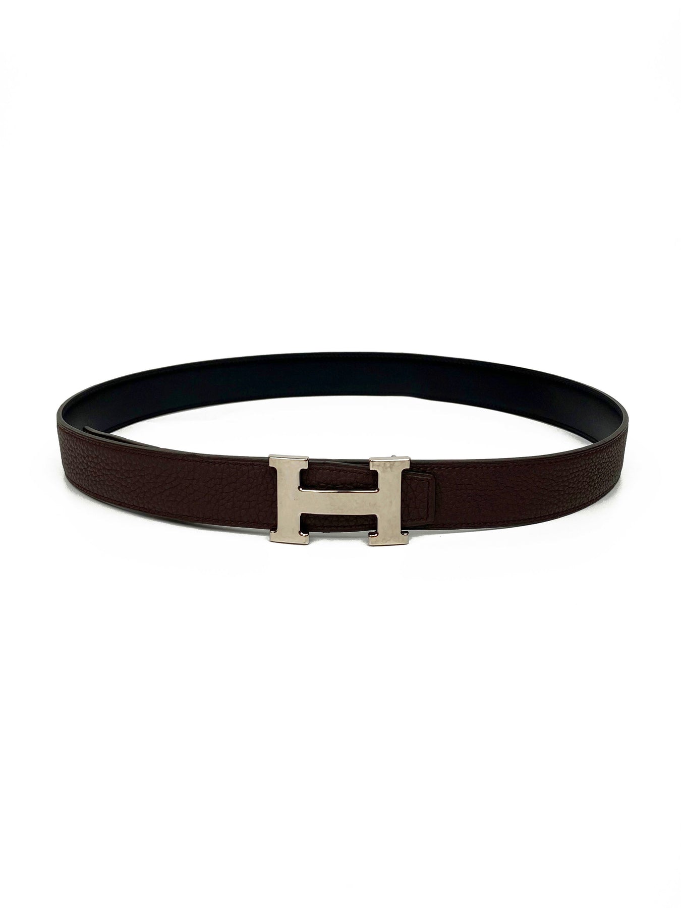 Description : This gorgeous buckle and belt set is a staple. With signature 'H' hammered palladium buckle and togo leather strap in the shades noir/chocolat, this versatile design has been wildly popular since 1967. This belt is adjustable. In excellent condition; mild signs of wear, including slight wrinkling in leather, mild scratches on buckle, mild dents and nicks on edges