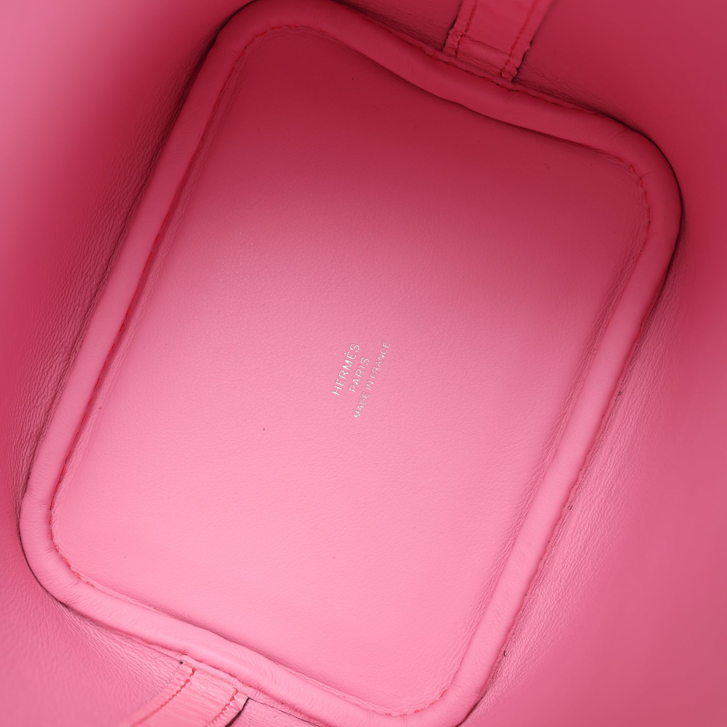 The interior is lined with Bubblegum Pink leather, no interior pockets and has a pull through closure secured by padlock.