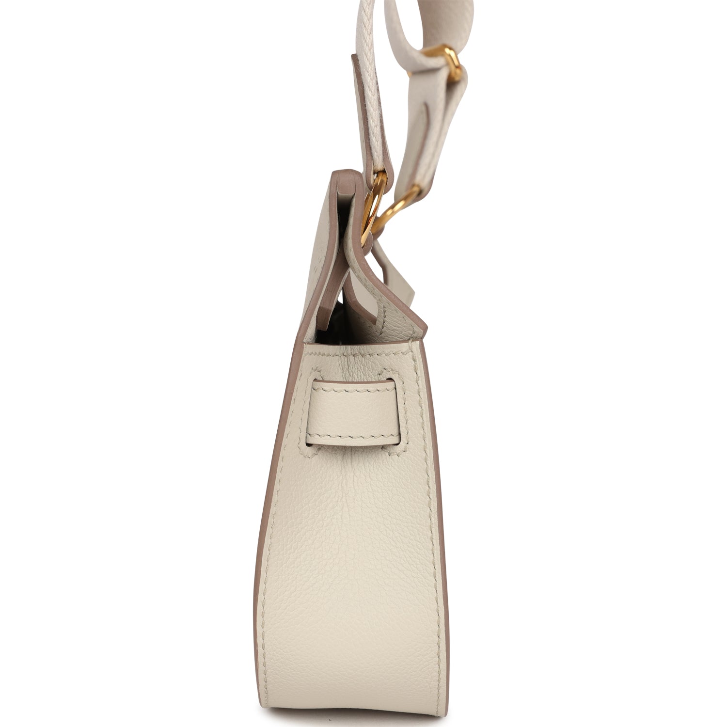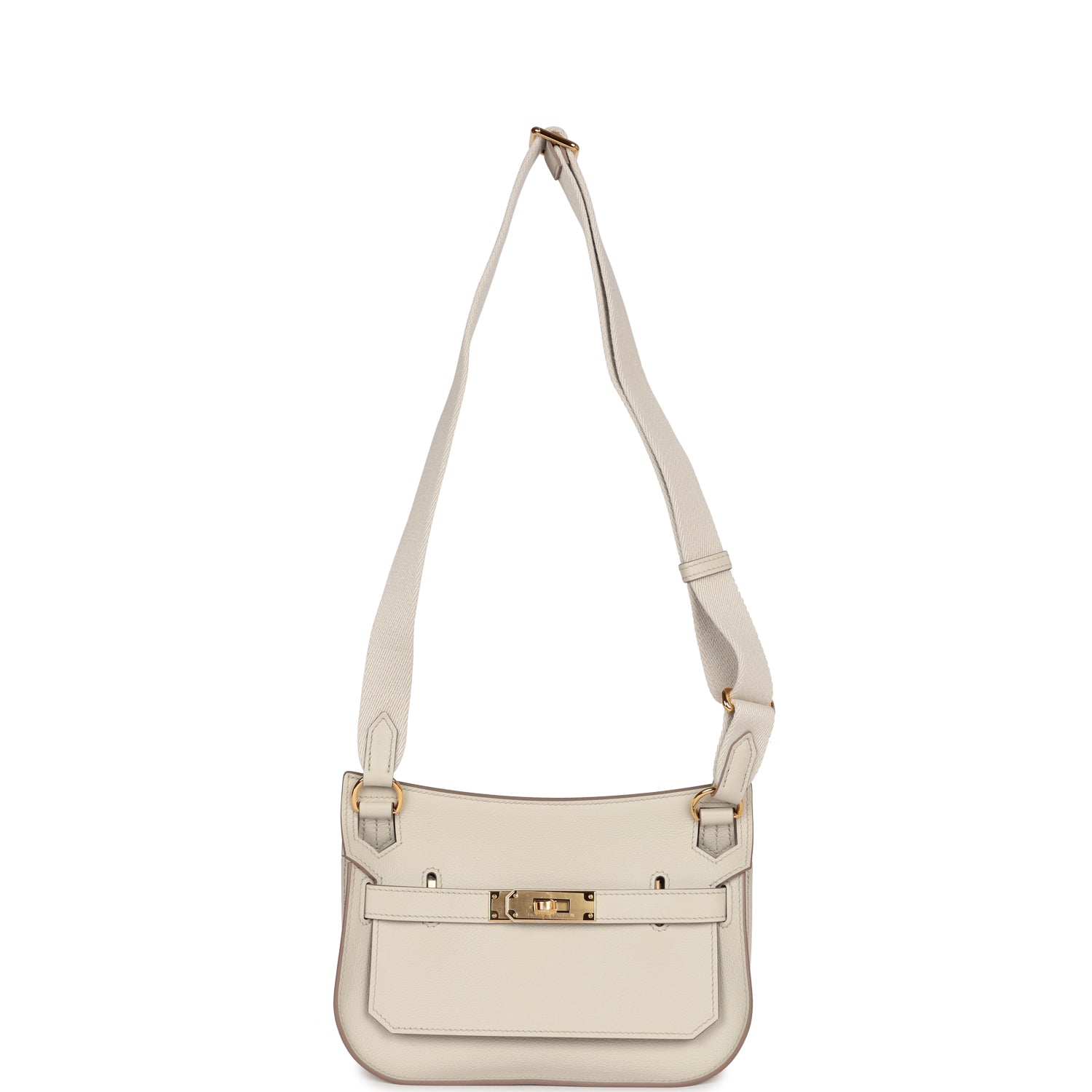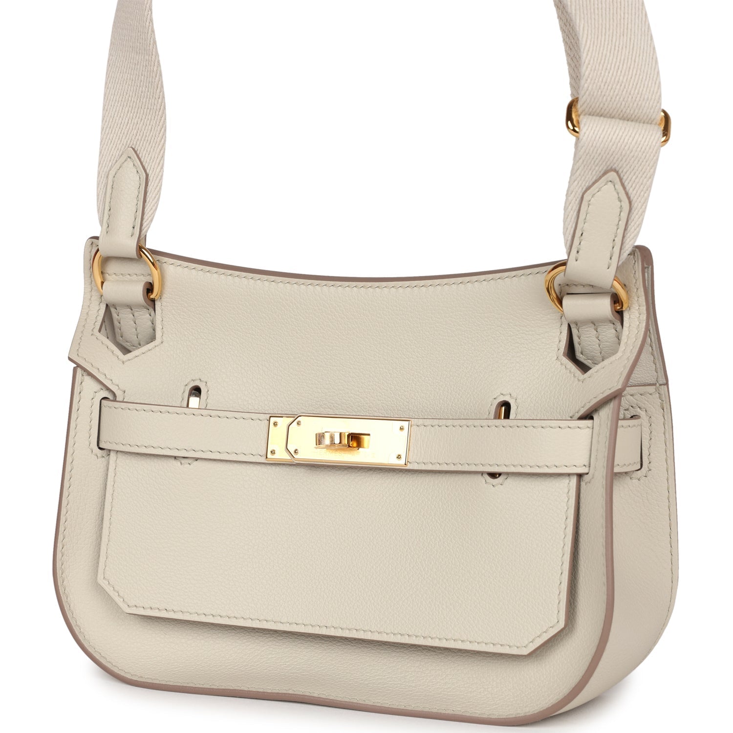 Jypsiere mini is in Beton evercolor leather with gold hardware, tonal stitching, single flap, two pull straps, turnlock closure, and a flat wool shoulder strap.