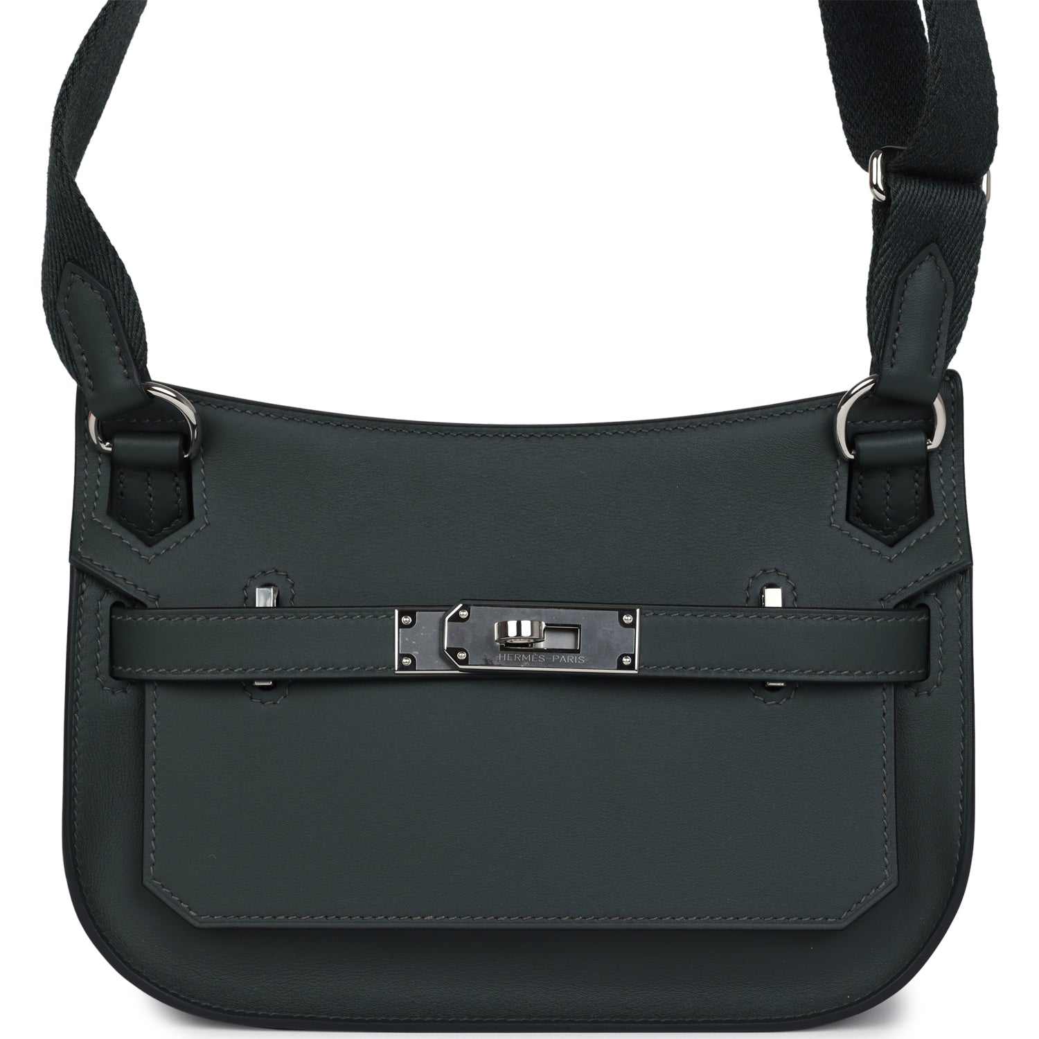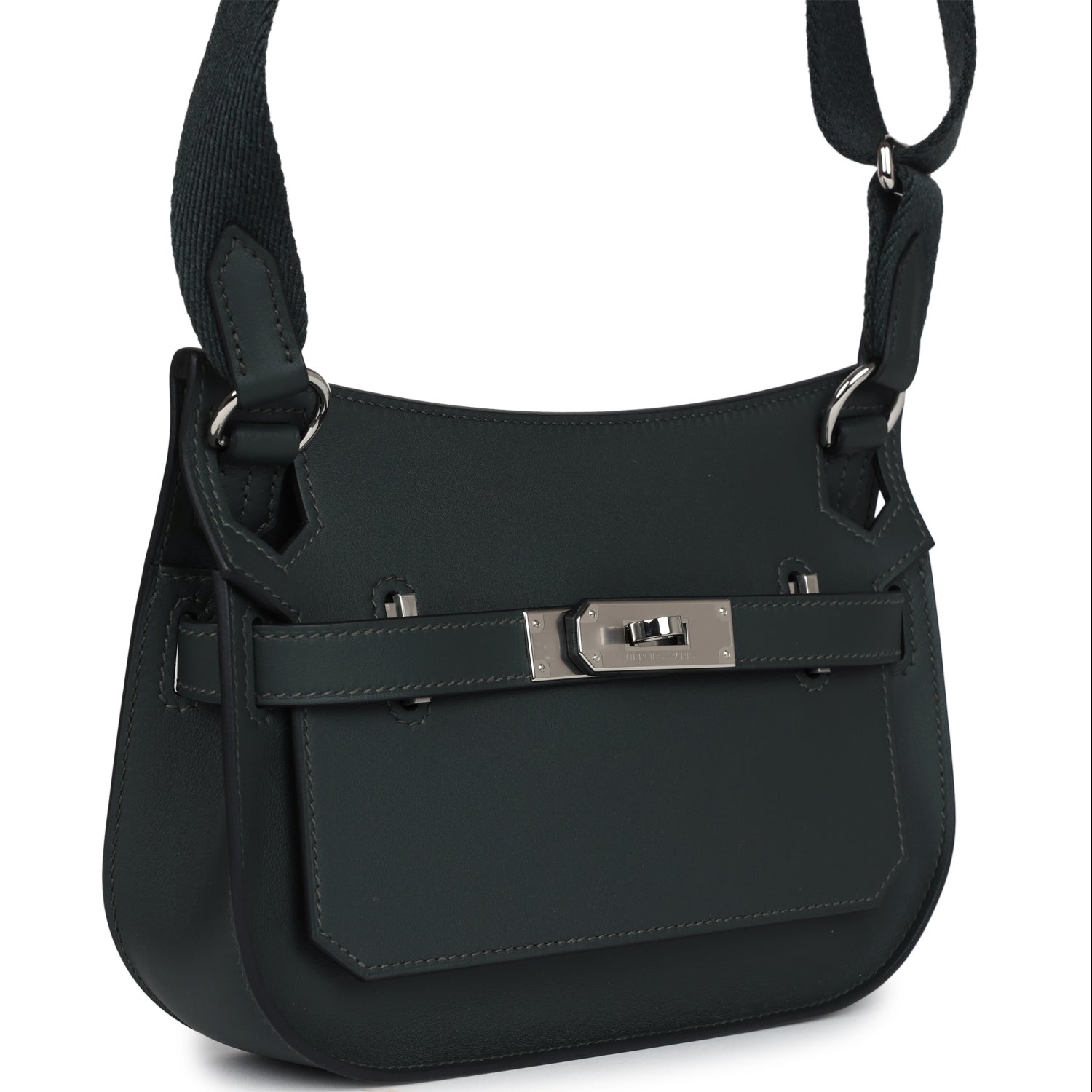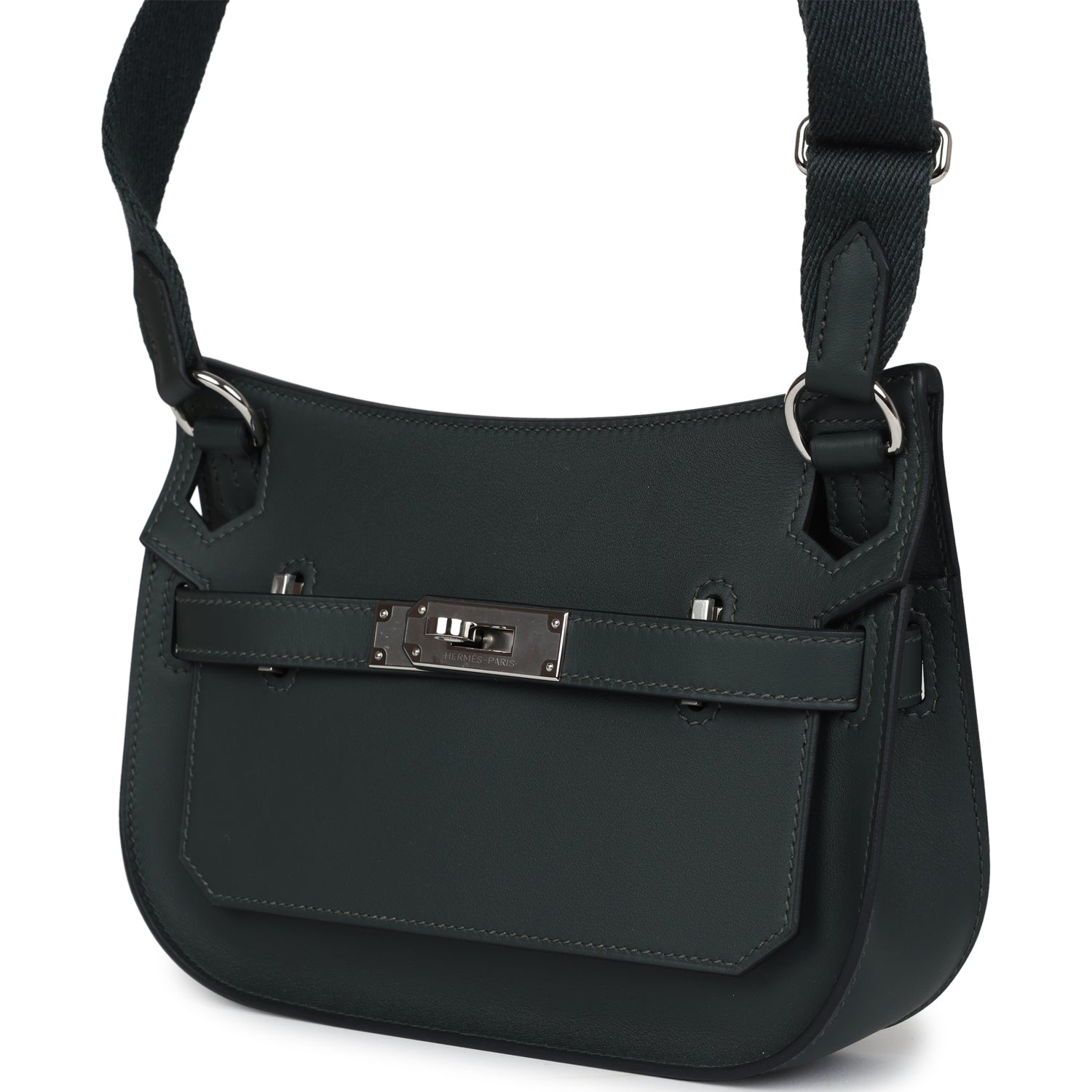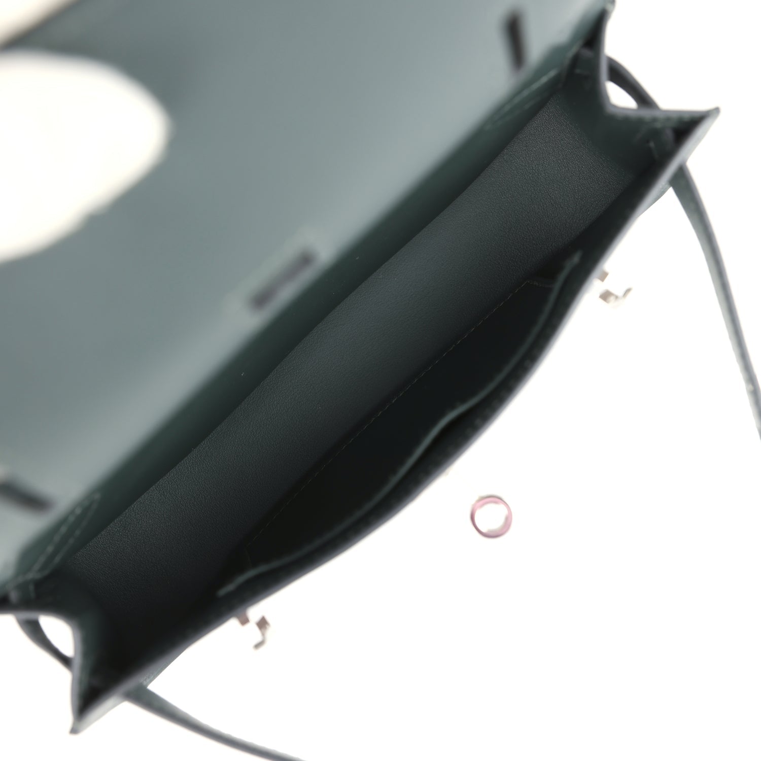 Mini Jypsiere bag is of Vert Fonce swift leather with palladium hardware, tonal stitching, single flap, two pull straps, turnlock closure, and a flat wool shoulder strap.