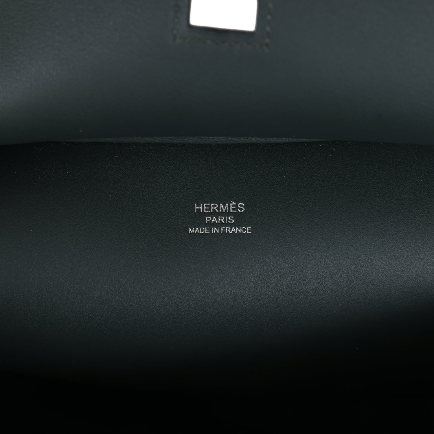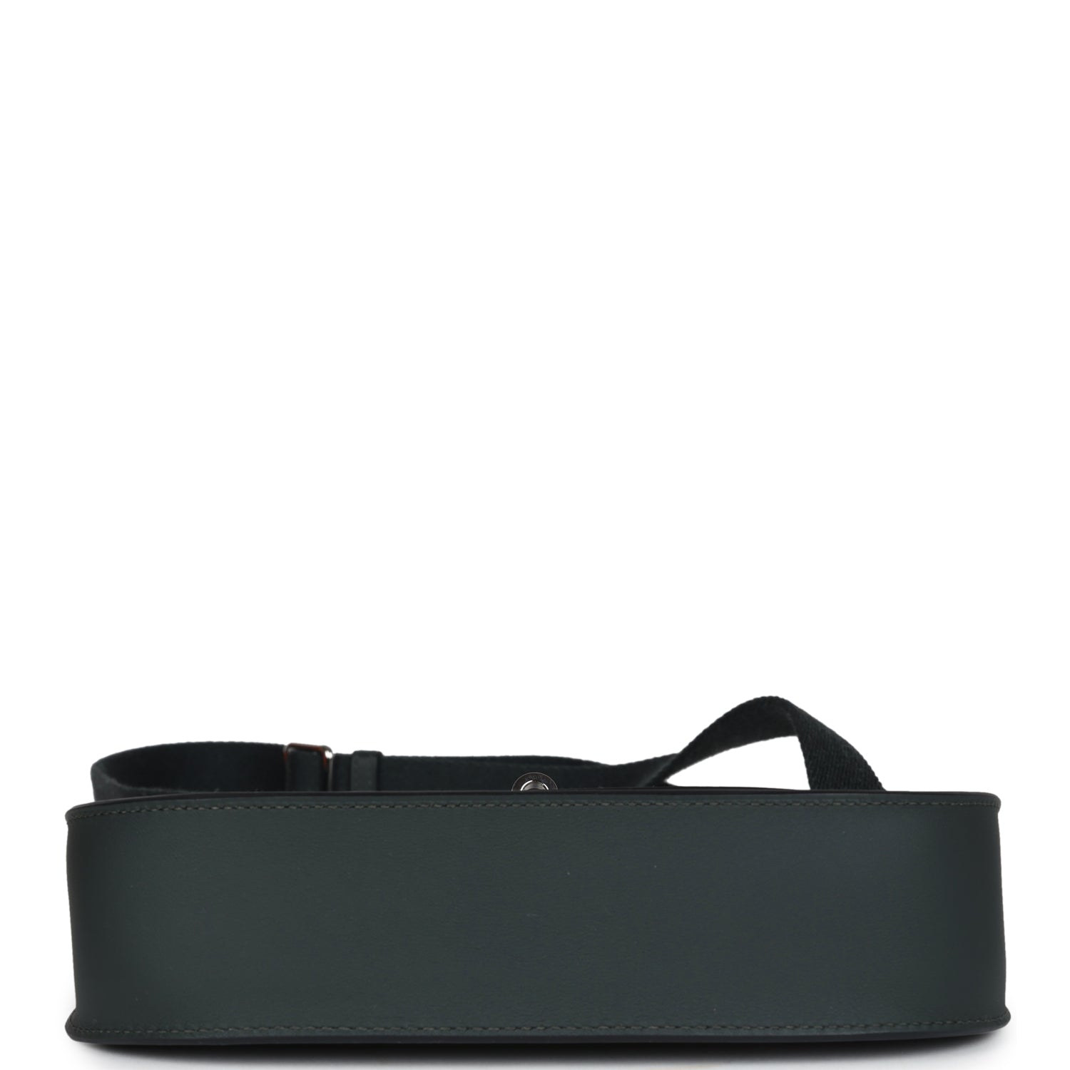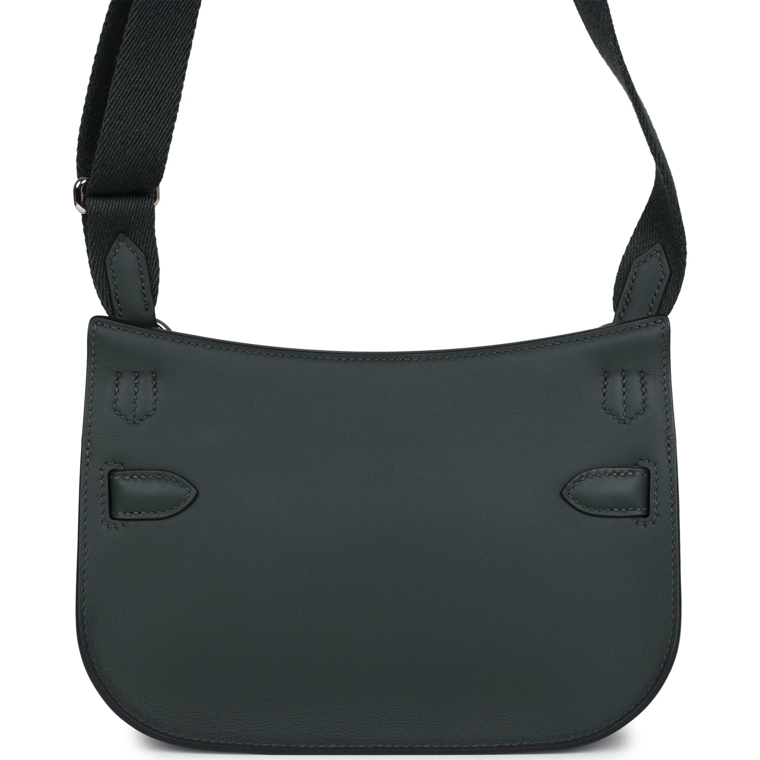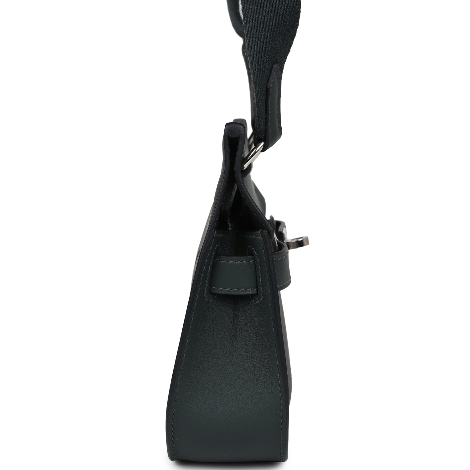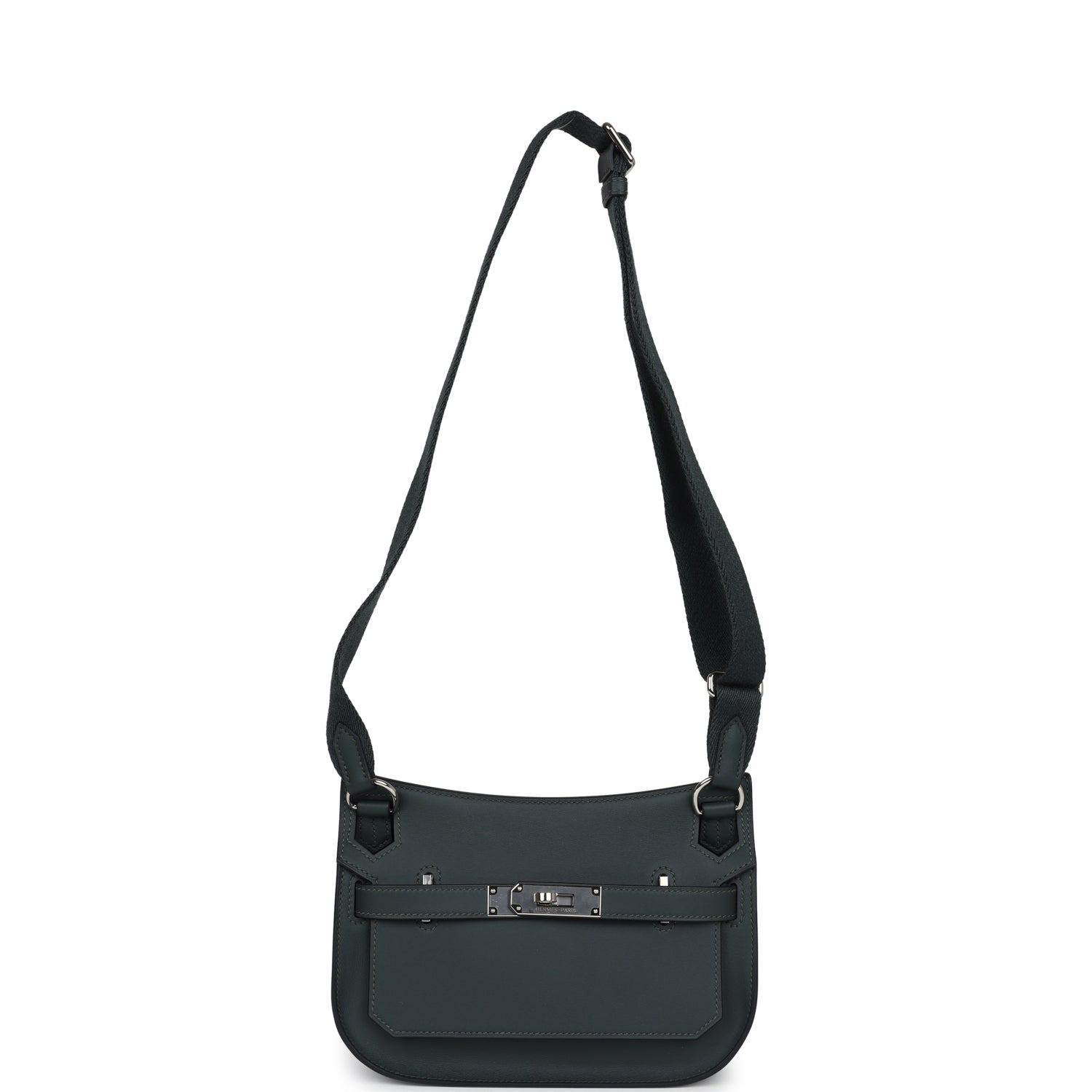 Mini Jypsiere bag is of Vert Fonce swift leather with palladium hardware, tonal stitching, single flap, two pull straps, turnlock closure, and a flat wool shoulder strap.