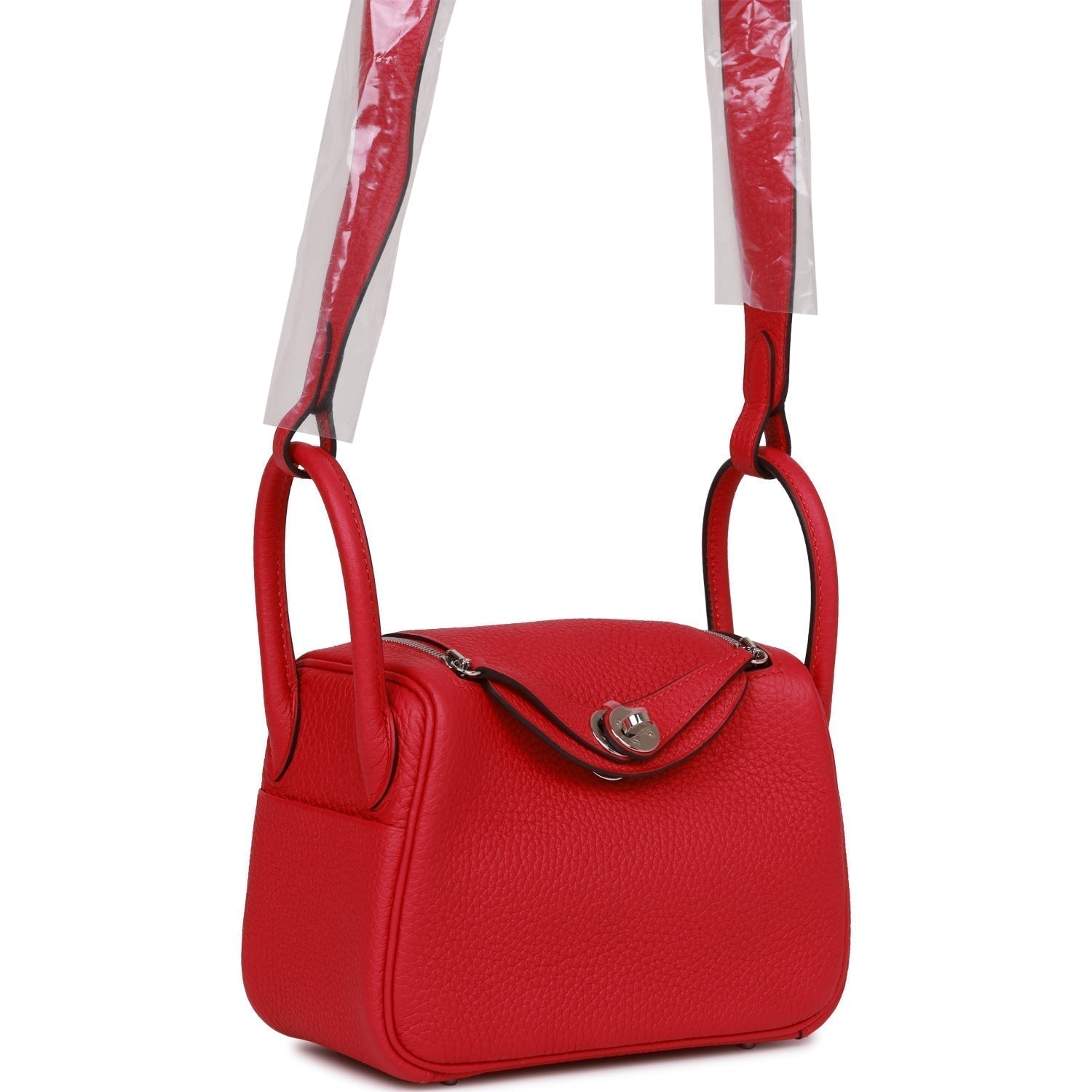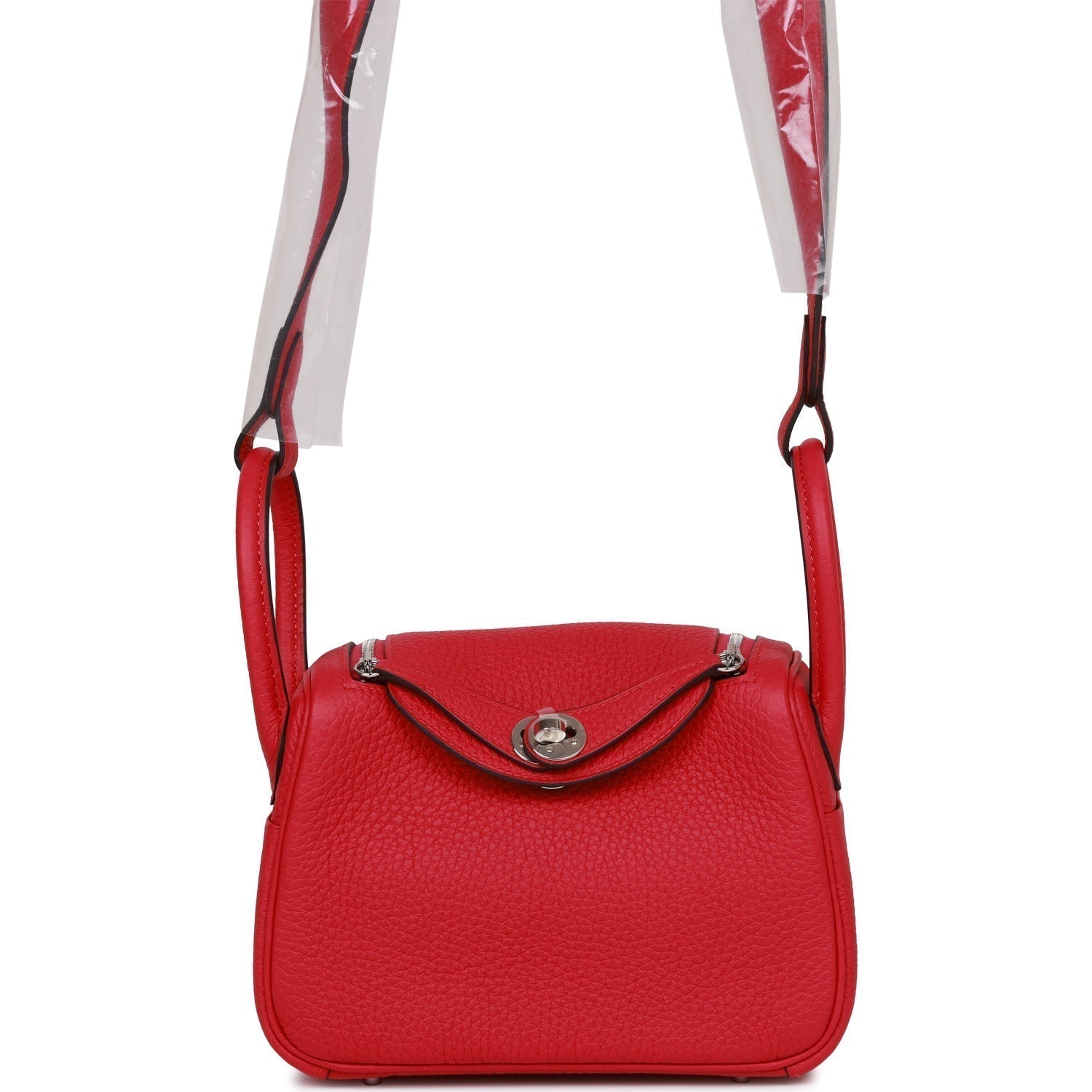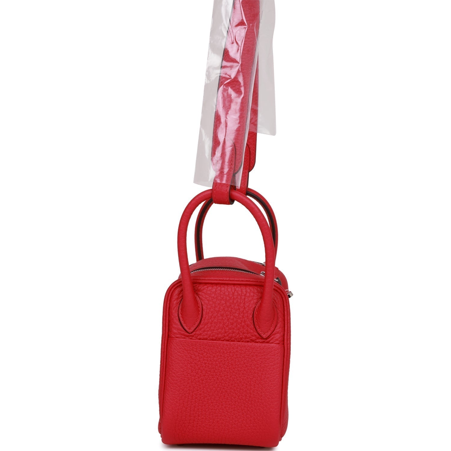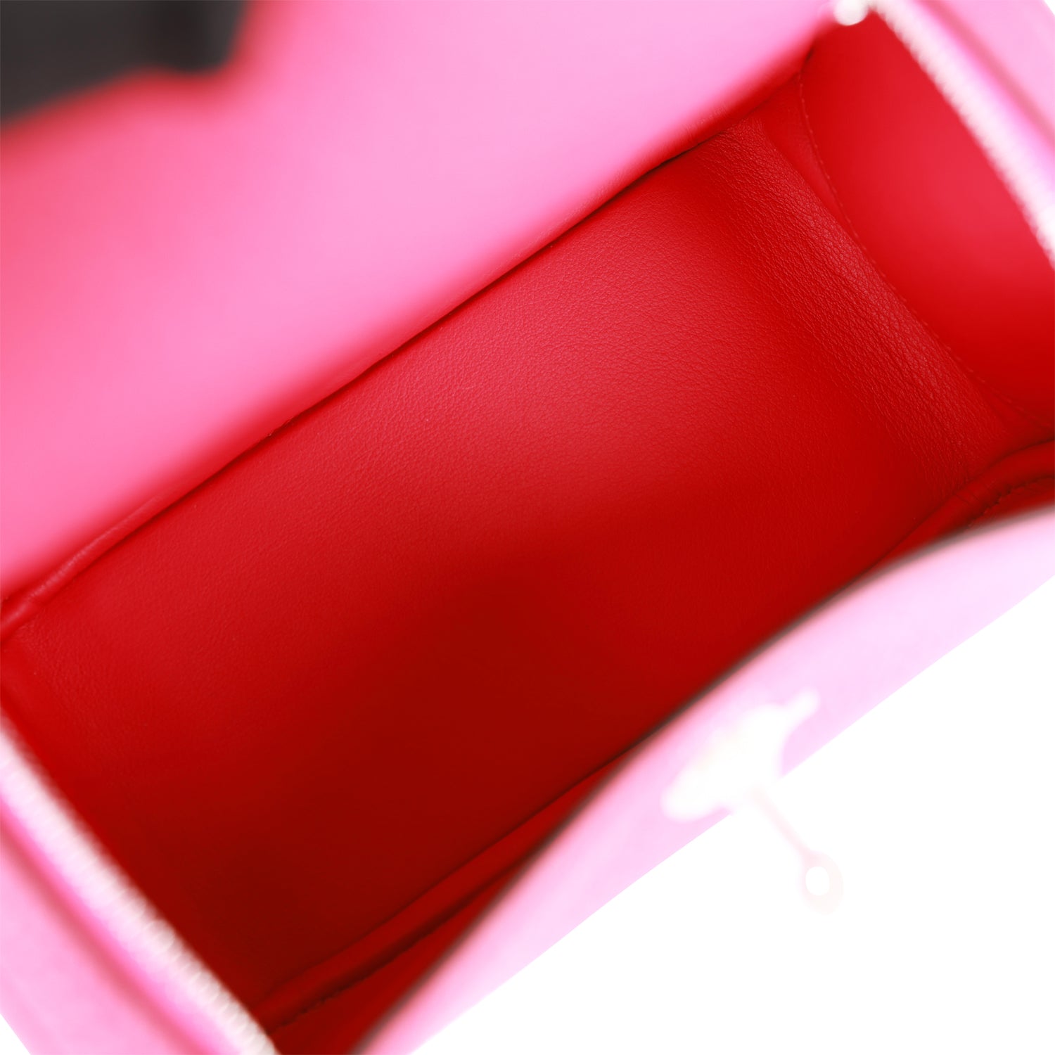 This Mini Lindy is in Framboise clemence leather with palladium hardware and has tonal stitching, double zipper pulls, front Hermès twist lock, single pocket on each side, two rolled top handles linked by a flat shoulder strap.