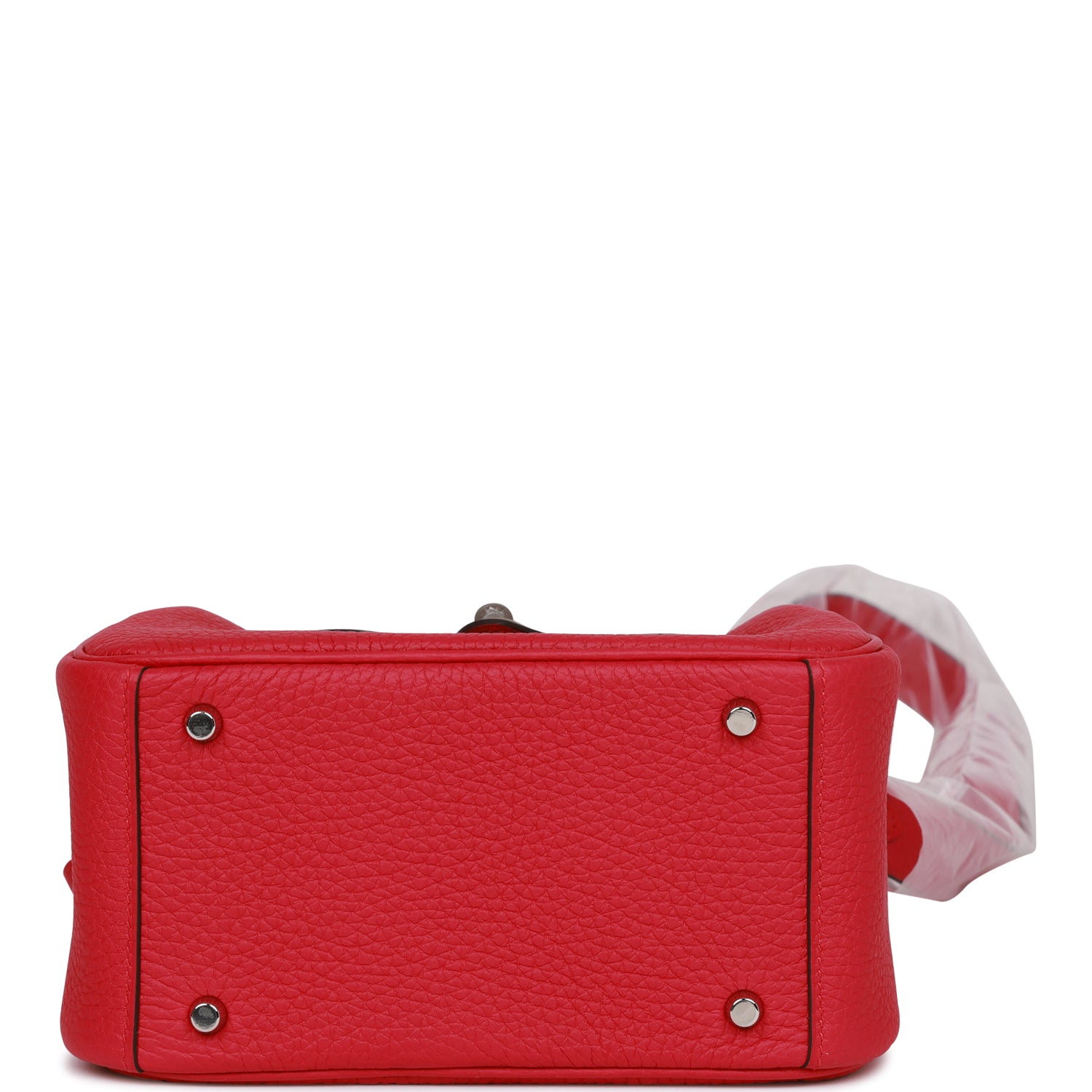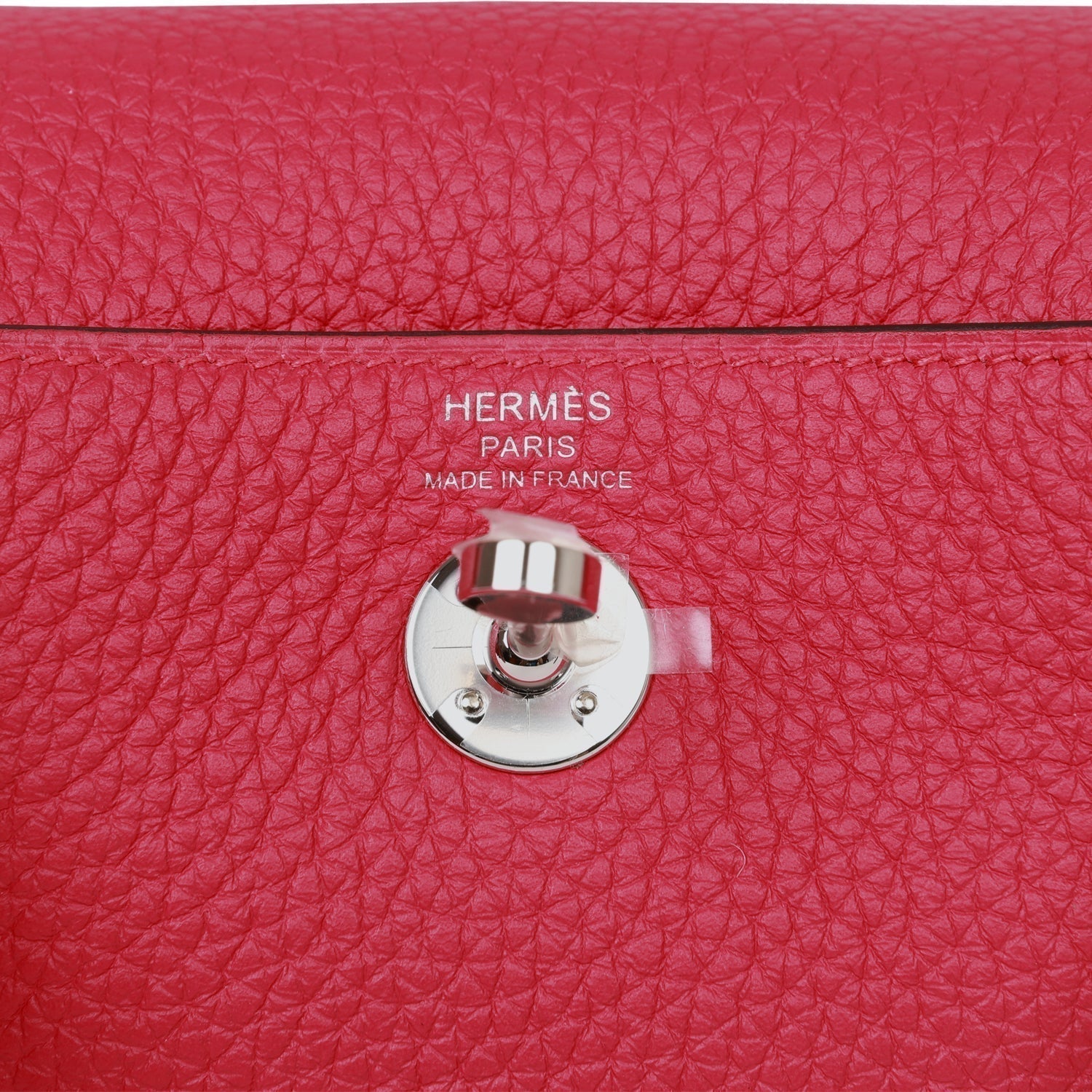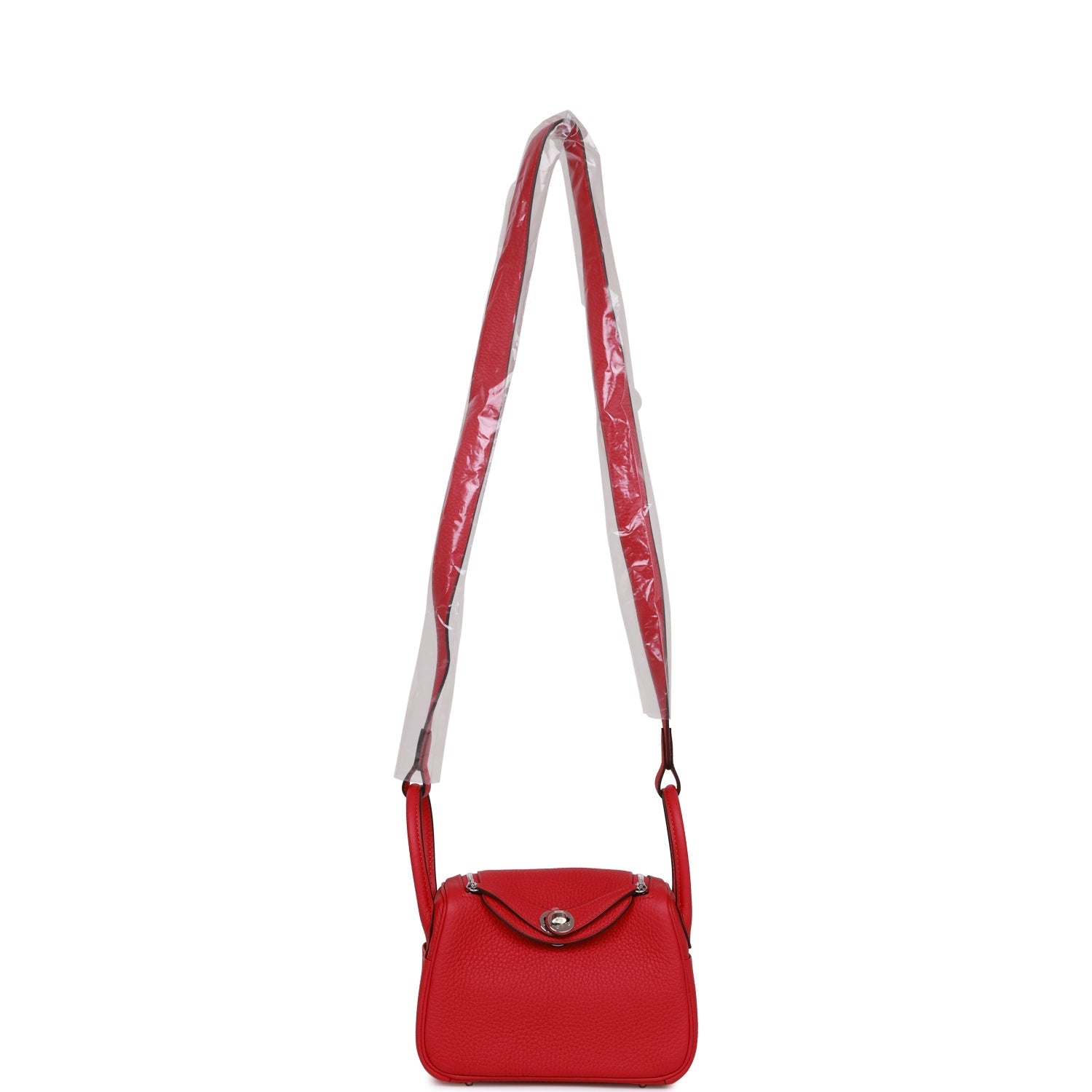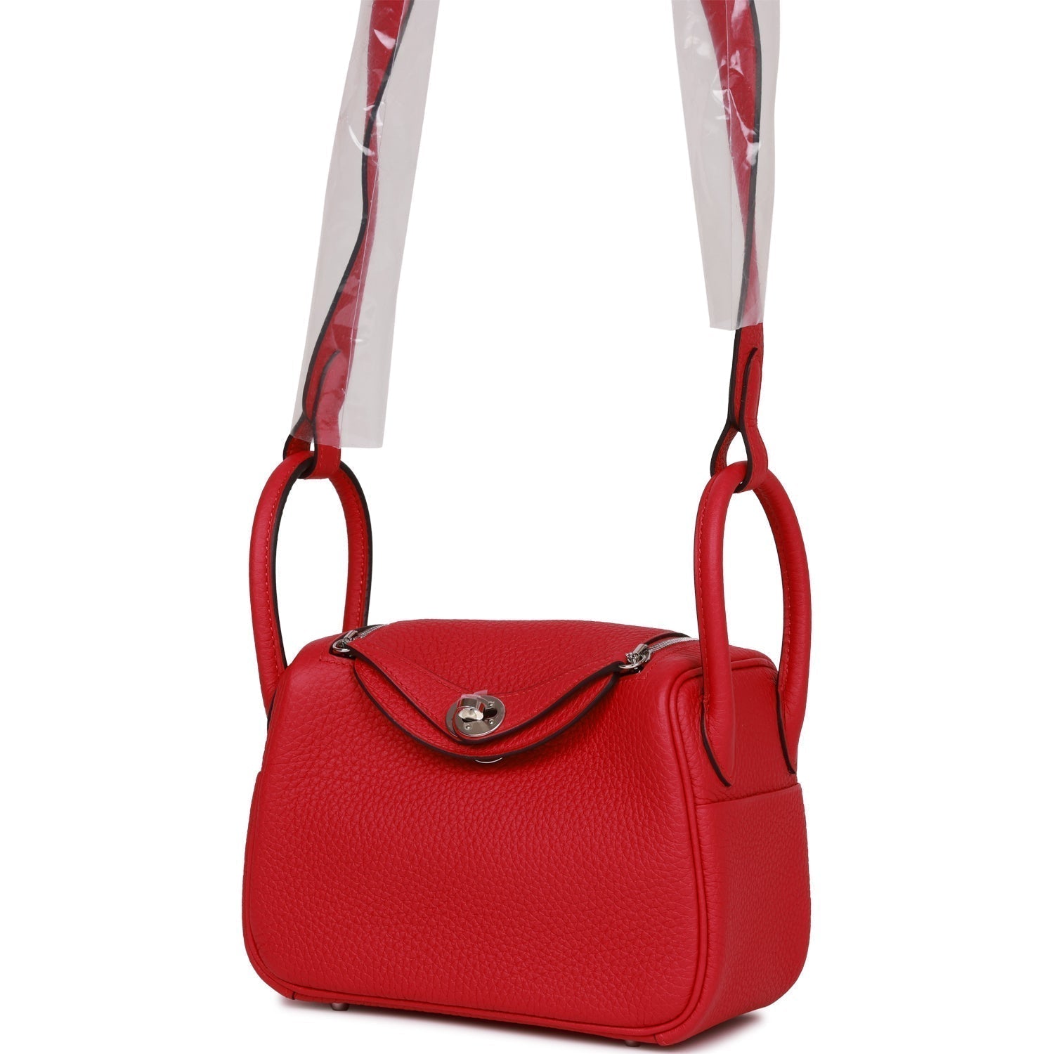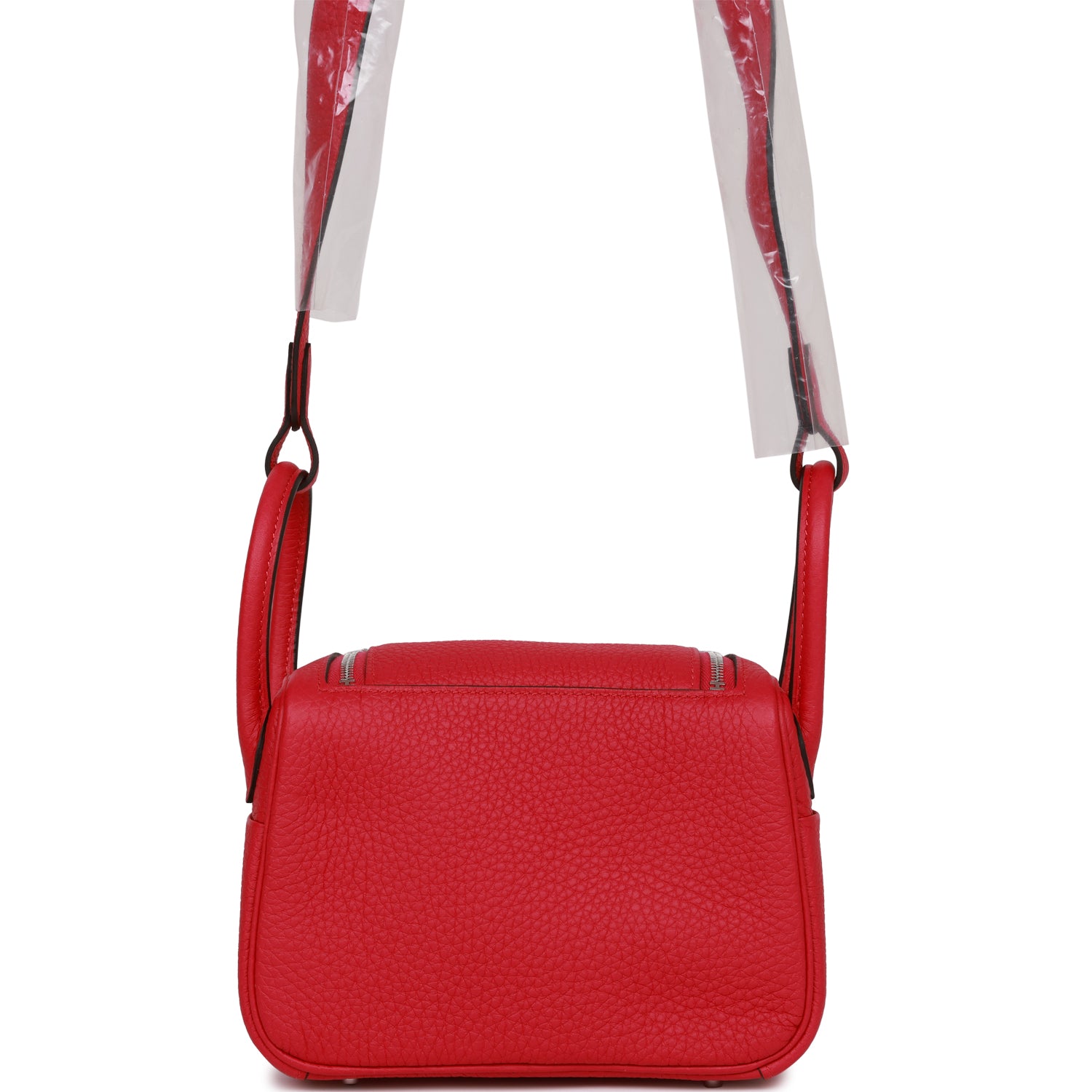 This Mini Lindy is in Framboise clemence leather with palladium hardware and has tonal stitching, double zipper pulls, front Hermès twist lock, single pocket on each side, two rolled top handles linked by a flat shoulder strap.