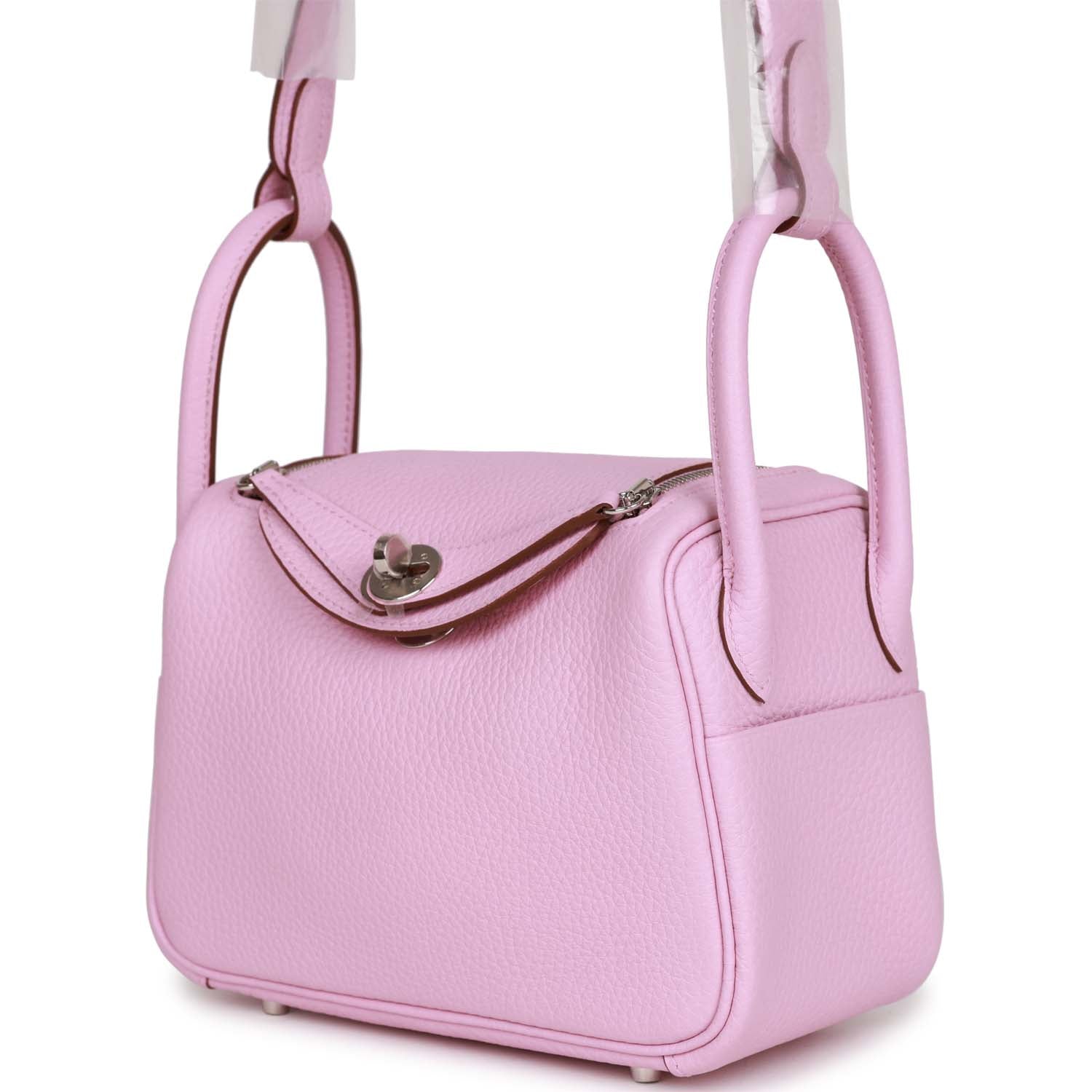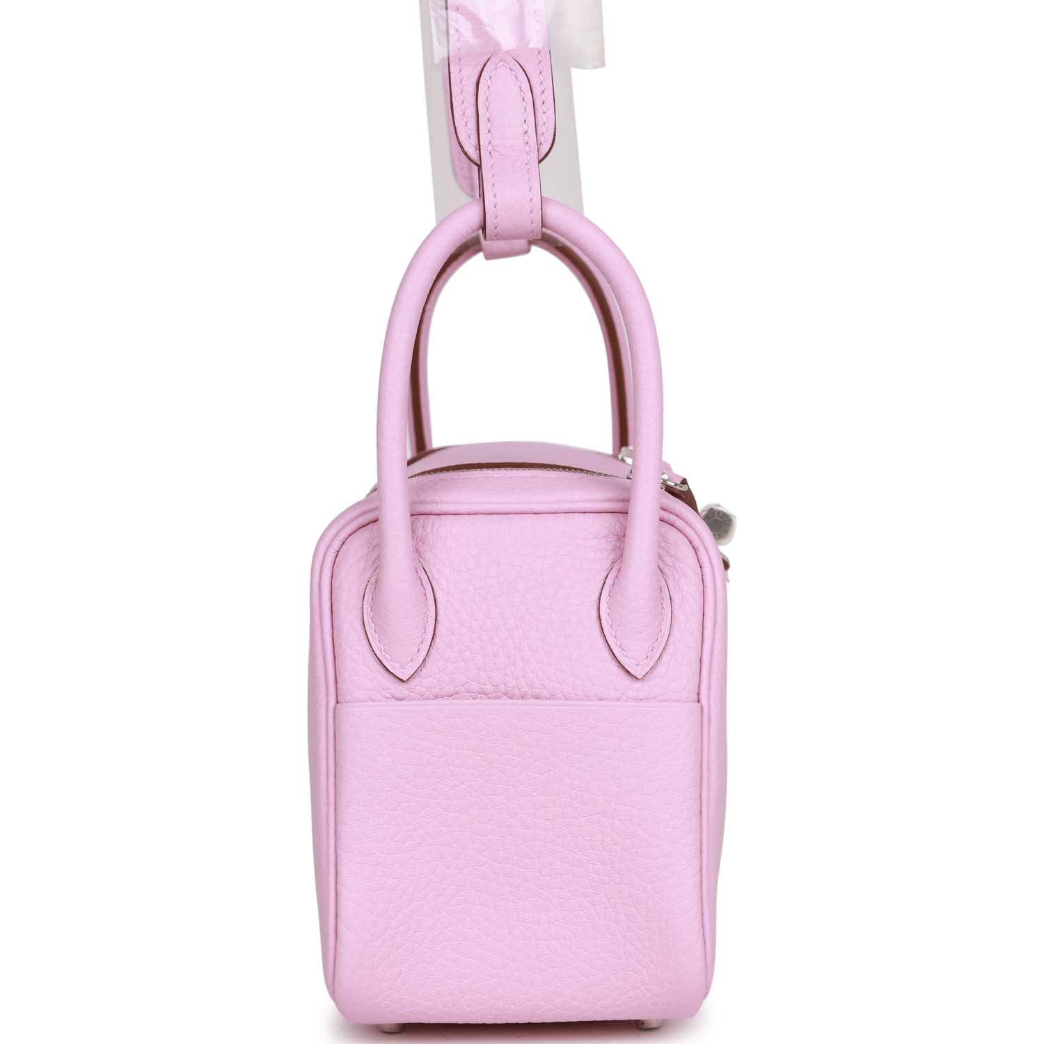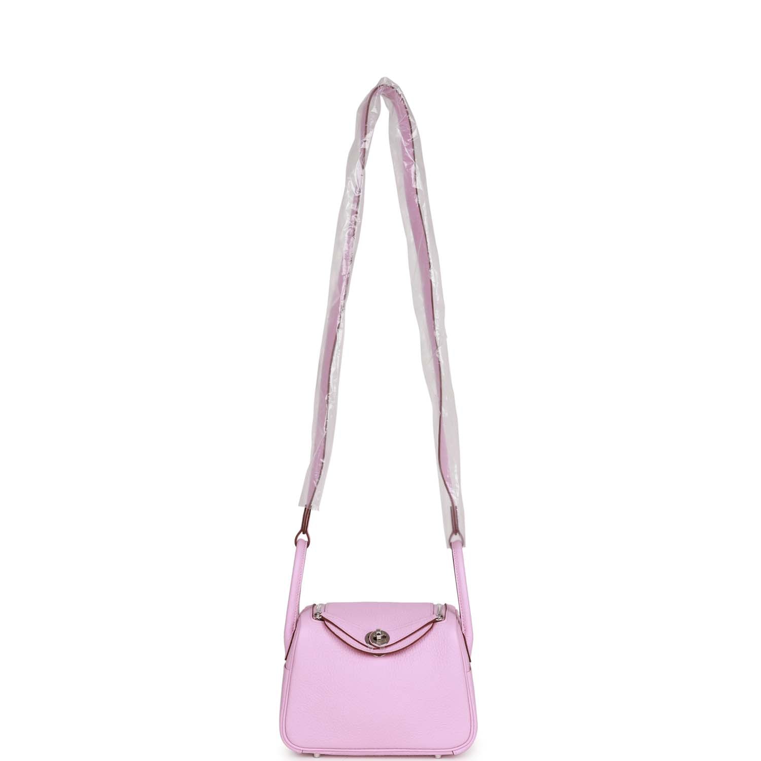 This Mini Lindy is in Mauve Sylvestre clemence leather with palladium hardware and has tonal stitching, double zipper pulls, front Hermès twist lock, single pocket on each side, two rolled top handles linked by a flat shoulder strap.